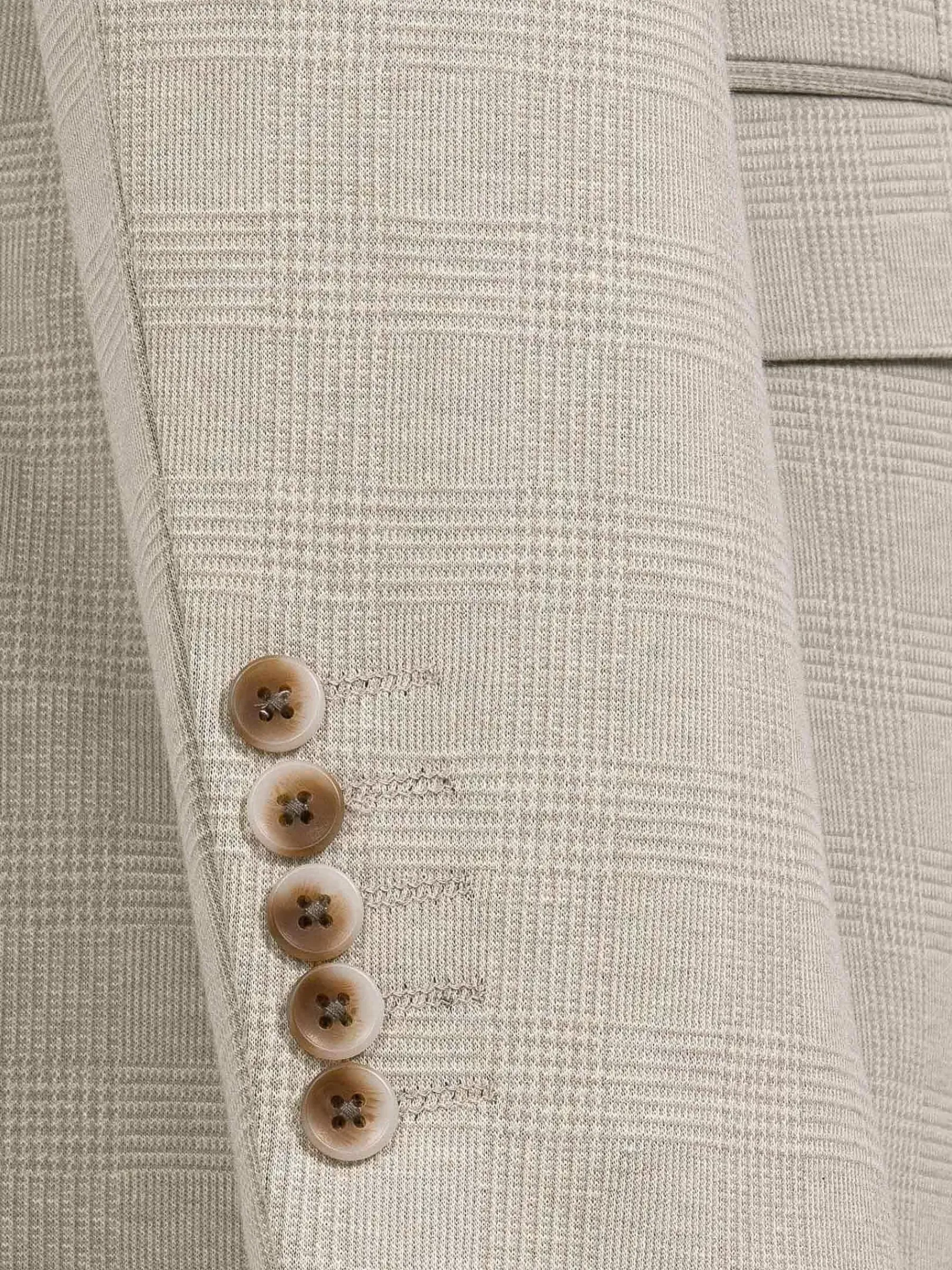 Mustaine Glen Plaid Pattern Beige Blazer Is Een Tijdloos Stuk Dat Klassieke Elegantie Combineert Met Moderne Verfijning. Het Is Gemaakt Van Een Eersteklas Mix Van Polyester, Viscose En Elastaan En Biedt Duurzaamheid, Comfort En Krasvastheid. Het Heeft Een Brede Revers, Een Moderne Pasvorm En Een Eenborstig Ontwerp Met Twee Knopen. De Blazer Heeft Ook Klepzakken Op De Borst En Glen Plaid Pattern, Waardoor Het Een Veelzijdige Keuze Is Voor Verschillende Gelegenheden.