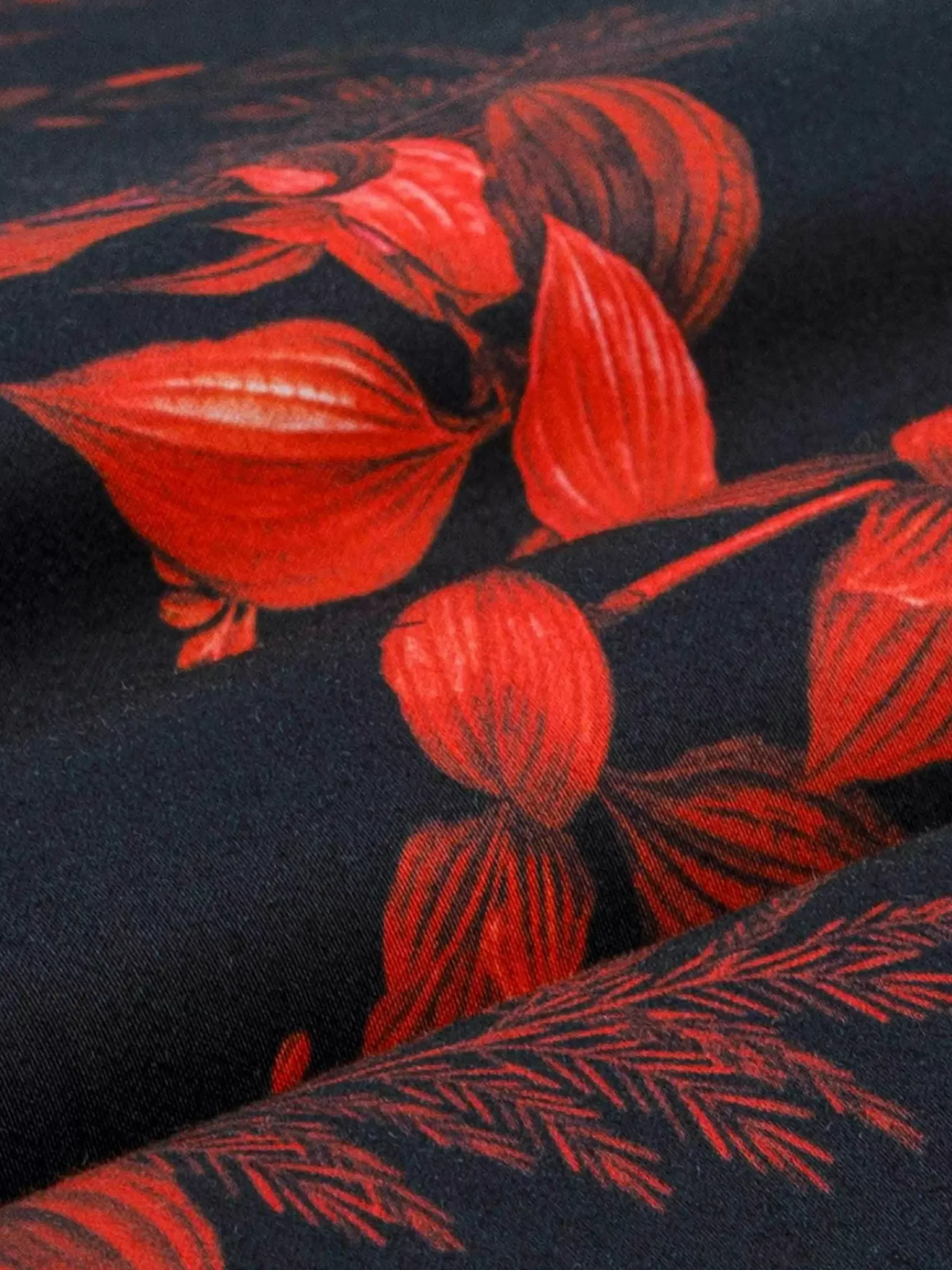 Florence Red Floral Black Long Sleeve Shirt Is Een Geraffineerd En Stijlvol Stuk Met Een Rood Bloemenpatroon Tegen Een Gestroomlijnde Zwart Gestreepte Achtergrond. Het Is Gemaakt Van 100% Katoen En Biedt Comfort En Elegantie, Met Een Slanke Pasvorm En Rode Biesaccenten. Het Overhemd Straalt Verfijning Uit En Maakt Een Statement Bij Elke Outfit.