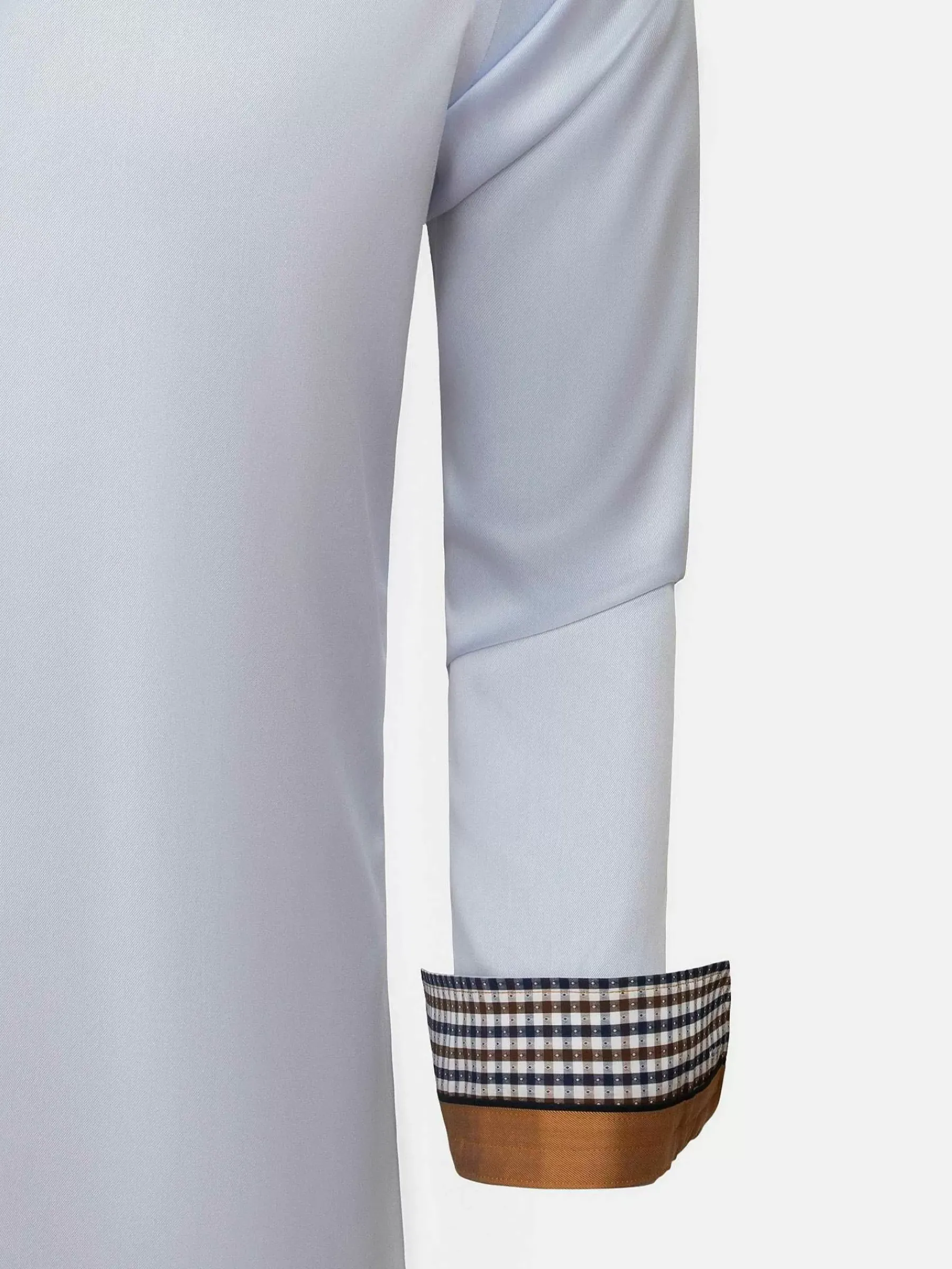 Lichtblauw Overhemd Met Een Dubbele Boord. Het Overhemd Heeft Een Mooie Glans En Is Afgewerkt Met Bruine Manchetten En Bruine Belijning Langs De Kraag En Knoopsluiting. Is Prachtig Te Combineren Met Een Pantalon En Colbert.