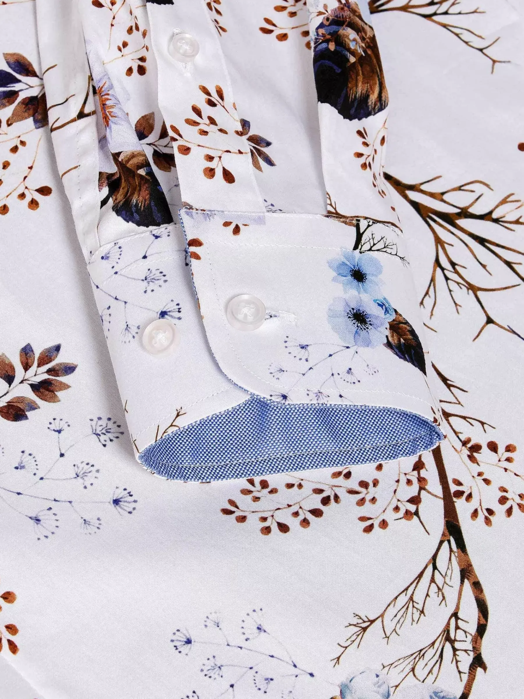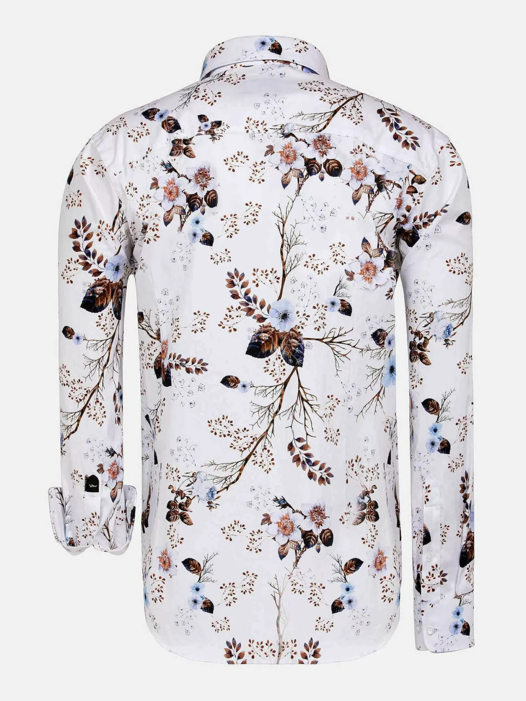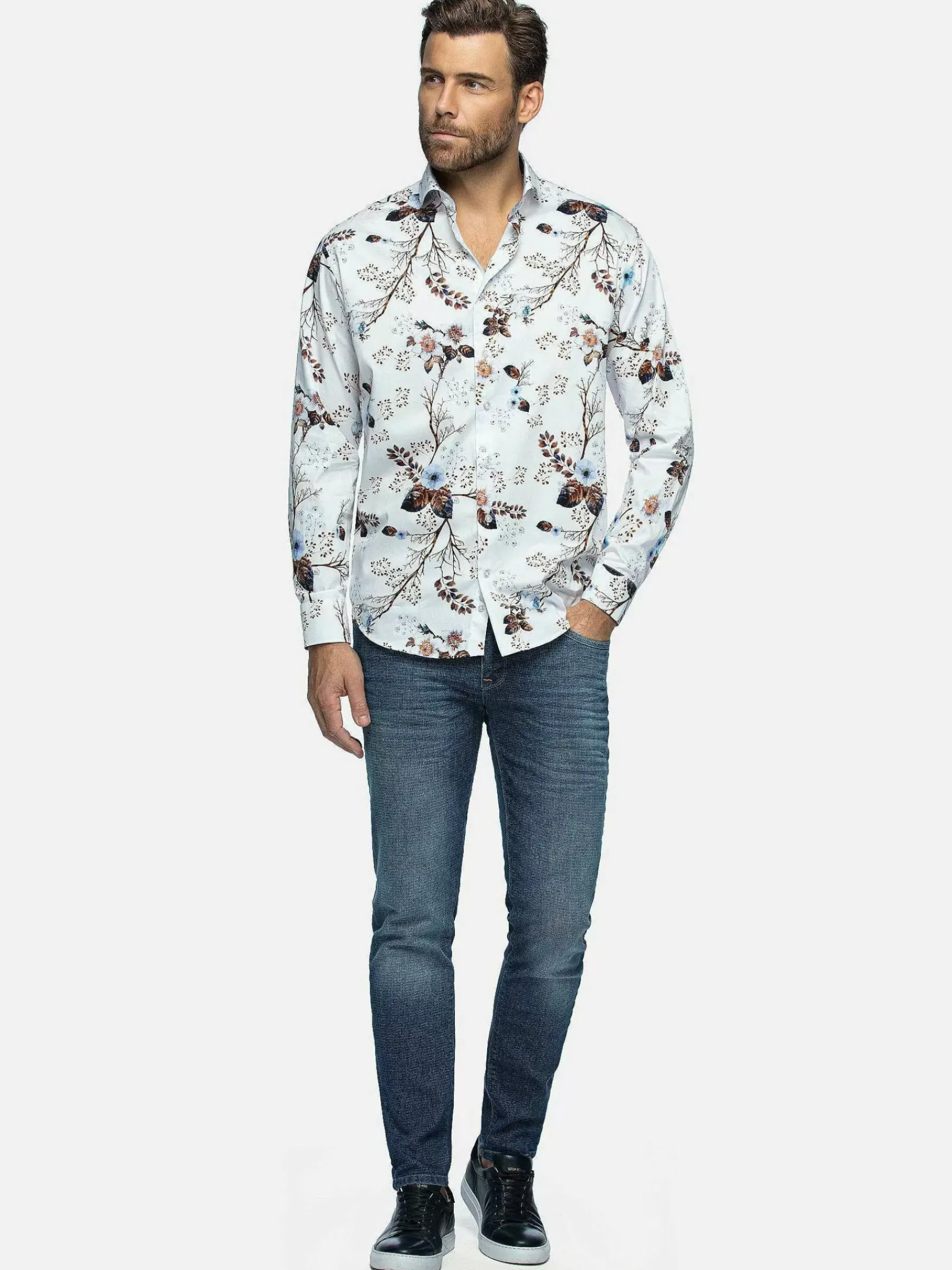 Prachtig Wit Overhemd Met Een Patroon Van Kleurige Bloemen. Het Overhemd Heeft Daardoor Een Artistieke Uitstraling. Staat Mooi Op Een Effen Jeans Of Chino, Eventueel Met Een Bijpassend Colbert. Het Overhemd Loopt Van Ondereren Licht Rond Af.