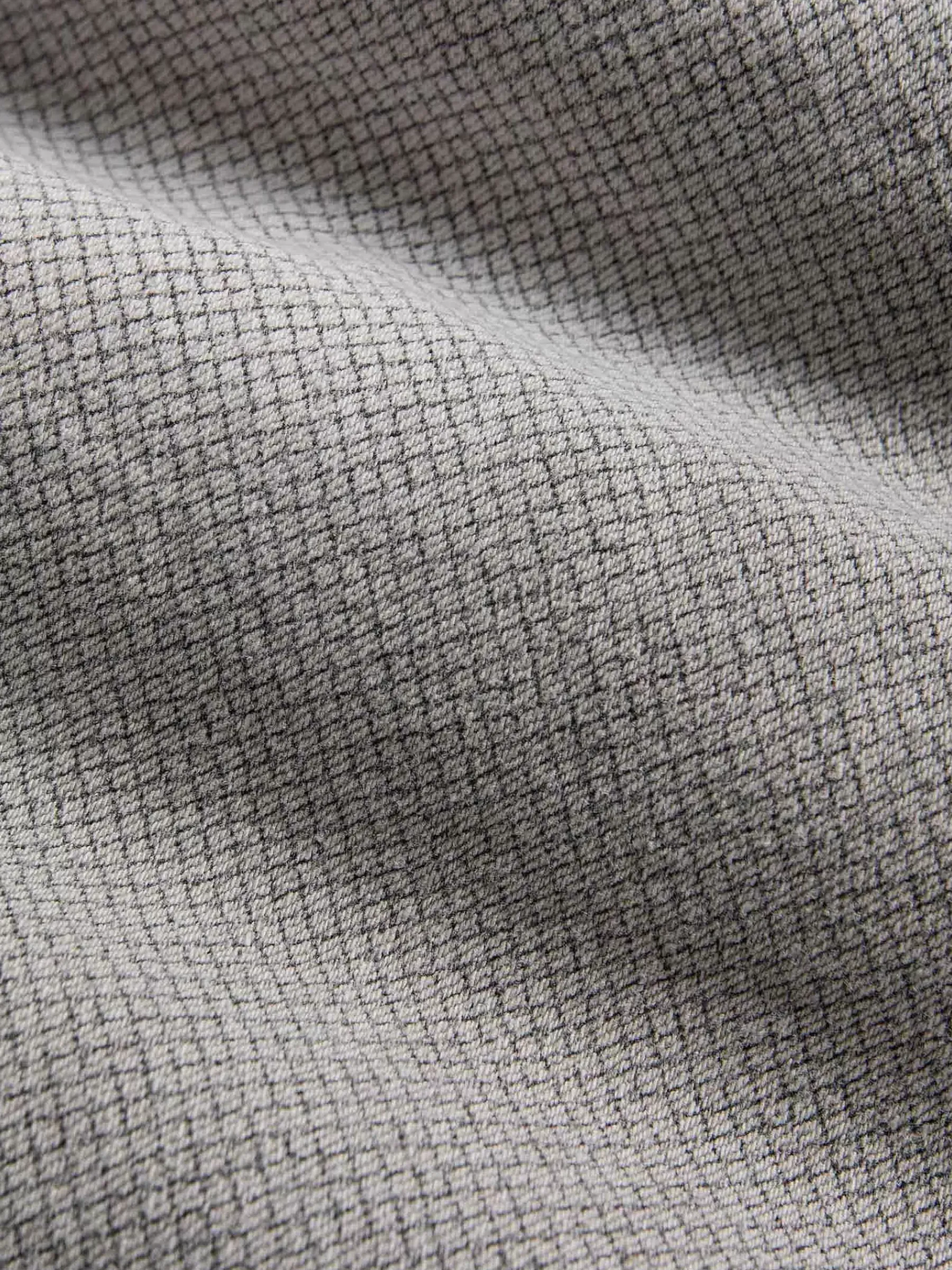 Grijze Korte Broek Met Knoopsluiting. De Broek Heeft Een Heel Fijn Stippenpatroon En Is Met Zwarte Garen Mooi Afgewerkt. Ideaal Voor De Zomerse Dagen Met Een T-Shirt Of ‘S Avonds Met Een Overhemd.