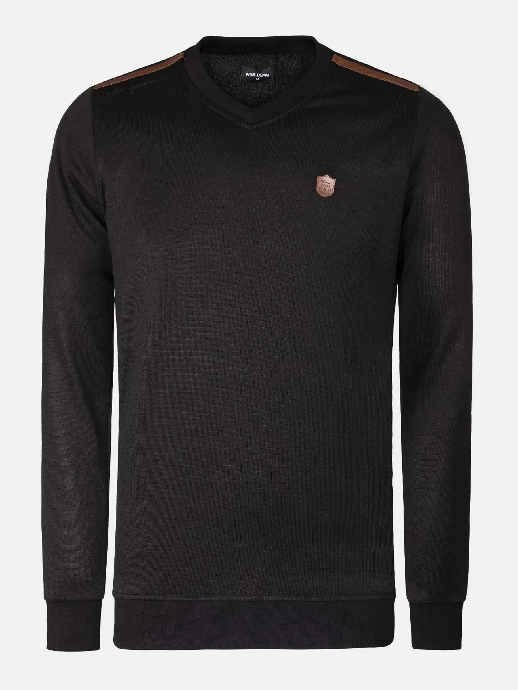 Zwarte Trui Met V-Hals. De Trui Voelt Lekker Zacht Aan En Is Afgewerkt Met Verschillende Details. Op De Schouders Zijn Bruine Elementen Gestikt En De Trui Heeft Linksonder Een Bruin Embleem. Door De Neutrale Kleur Is Deze Trui Makkelijk Te Combineren.