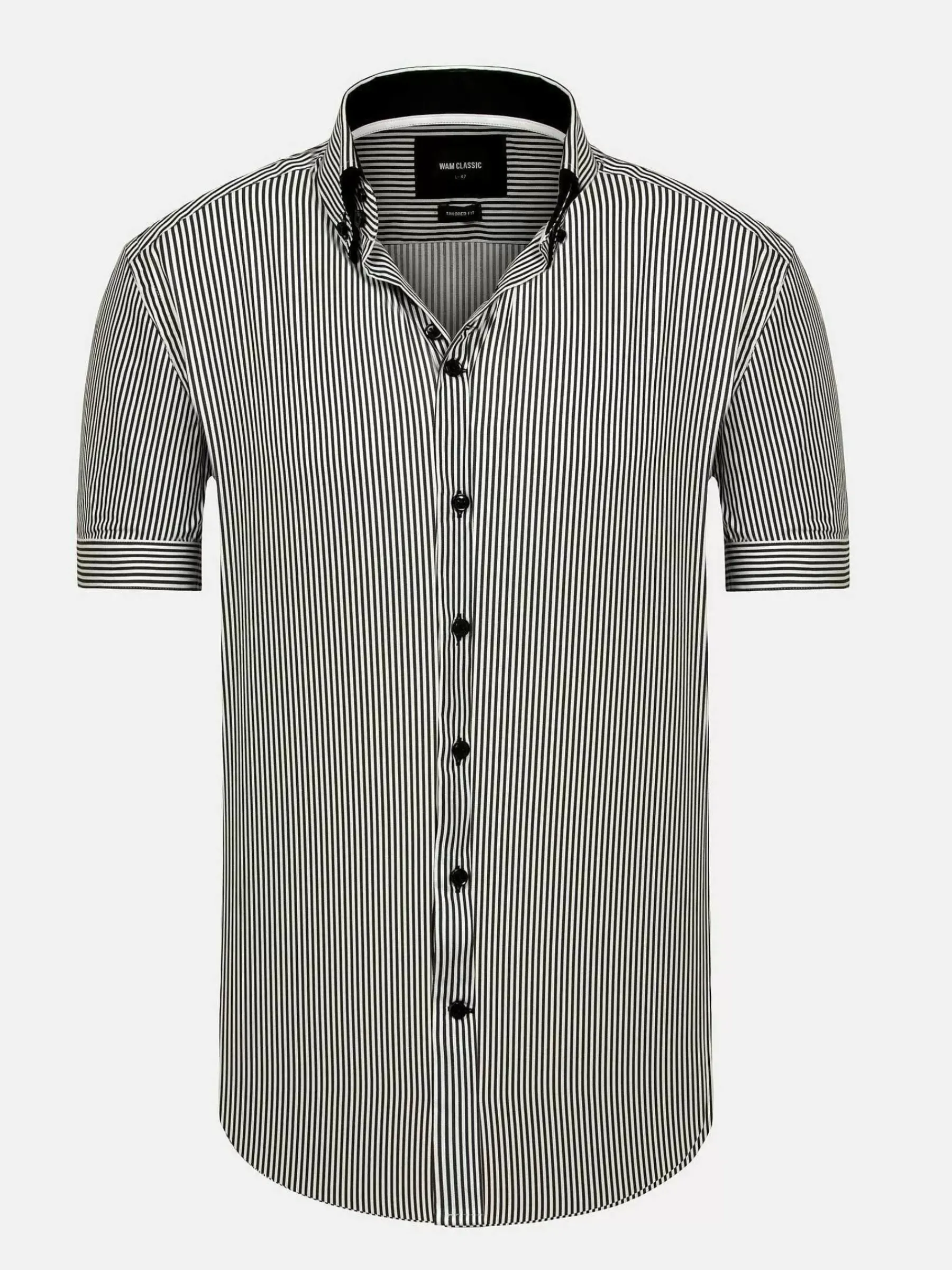 Aire Tailored Fit Black Overhemd .Met Een Gestroomlijnd Trailpatroon, Button-Down Ontwerp, Korte Mouwen, Knoopmanchetsluiting En Getailleerde Pasvorm. Combineer Moeiteloos Comfort En Verfijning Met Deze Essentiële Garderobe.