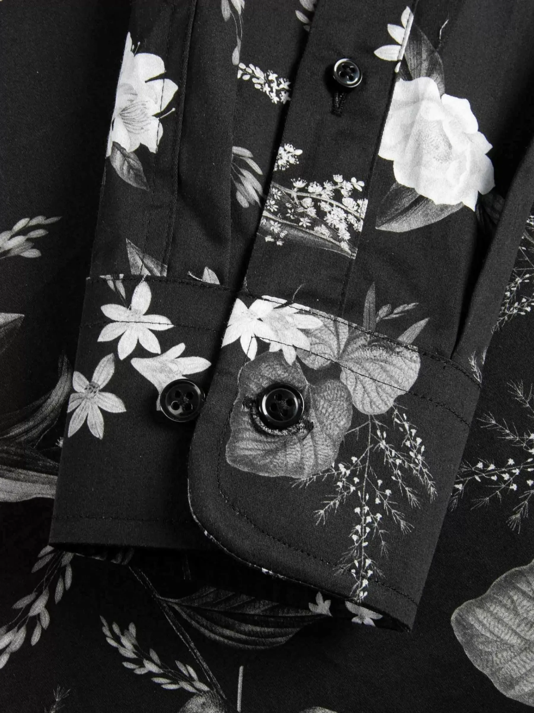 Duik In De Prachtige Wereld Van Mode Met Ons Floral Black Long Sleeve Shirt. Dompel Jezelf Onder In De Ingewikkelde Patronen En Luxe Stoffen Die Elegantie Herdefiniëren. Dit Overhemd Is Gemaakt Voor Mensen Die Van Verfijning Houden En Is Meer Dan Kleding; Het Is Een Statement. Verhoog Je Garderobe Naar Nieuwe Stijlhoogten.