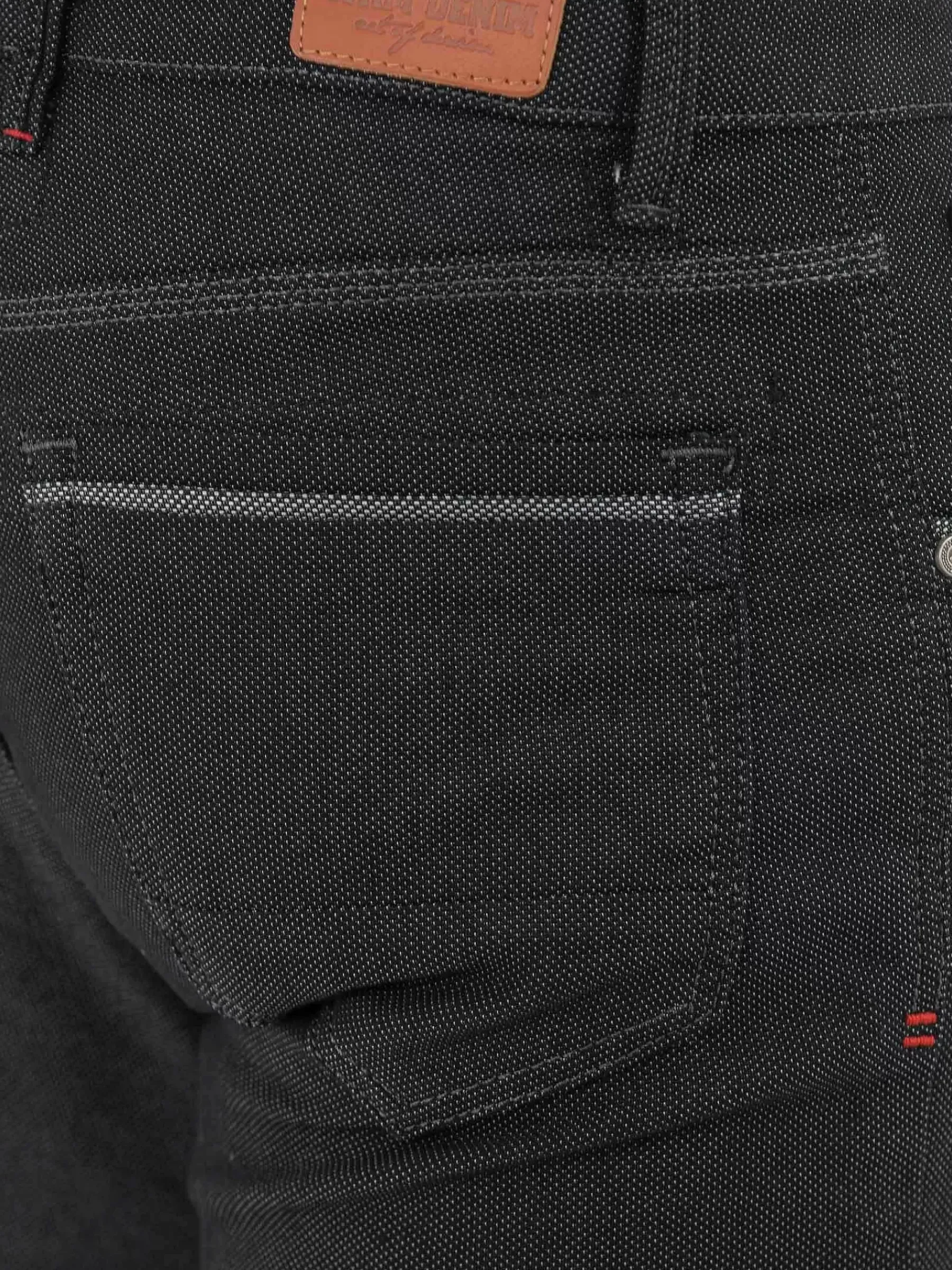 Fraaie, Modieuze Jeans In Het Zwart Met Een Heel Fijn Wit Stippenpatroon. De Broekspijpen Lopen Smal Af. Afgewerkt Met Twee Grijze Strepen Op De Achterzakken. Boven De Rechter Achterzak Is Een Merkembleem Bevestigd.