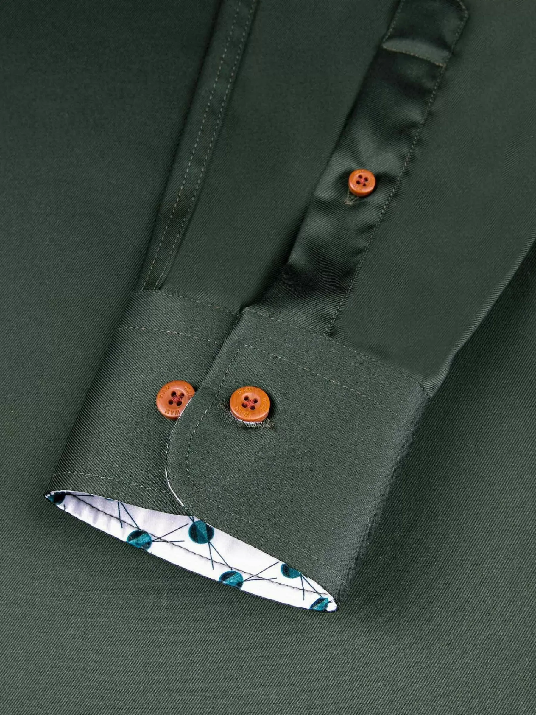 Duik In De Wereld Van Ongeevenaarde Verfijning Met Ons Effen Donkergroene Overhemd Met Lange Mouwen. Ervaar Tijdloze Stijl En Comfort, Zorgvuldig Vervaardigd Met Een Cut-Away Kraag Voor Een Exquise Touch. Verhoog Je Garderobe Vandaag Nog En Omarm De Essentie Van Verfijnde Mode.