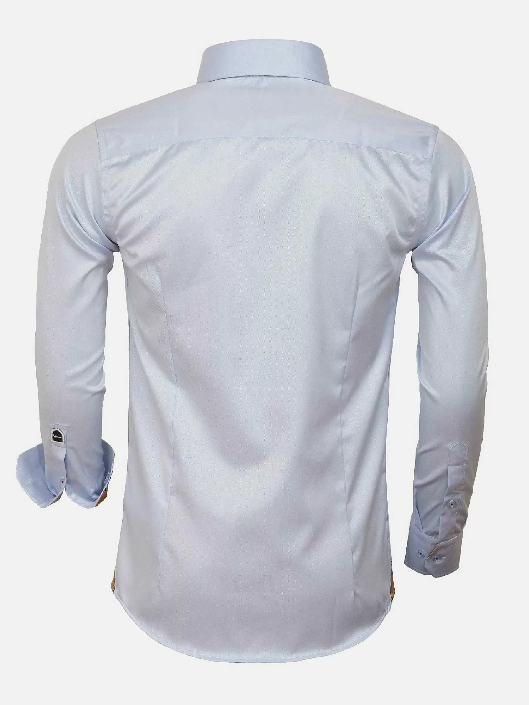Lichtblauw Overhemd Met Een Dubbele Boord. Het Overhemd Heeft Een Mooie Glans En Is Afgewerkt Met Bruine Manchetten En Bruine Belijning Langs De Kraag En Knoopsluiting. Is Prachtig Te Combineren Met Een Pantalon En Colbert.