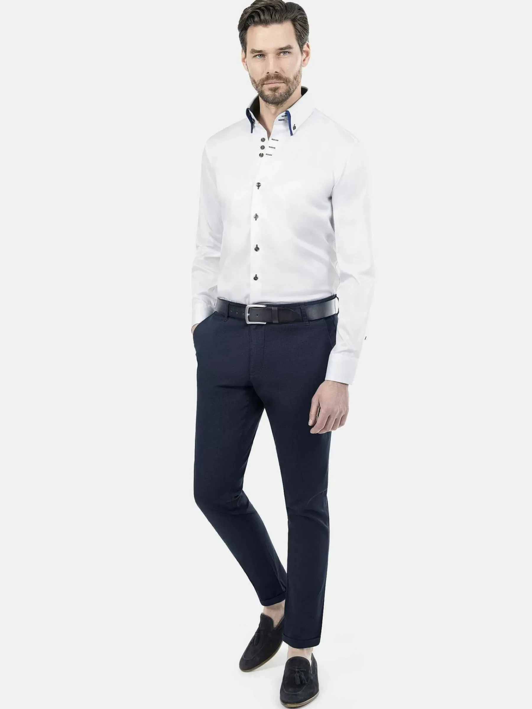 Wit Overhemd Met Een Mooie Glans. Het Overhemd Is Gedetailleerd Afgewerkt Met Extra Knopen In De Hals En Manchetten In De Kleurencombinatie Grijs En Royal Blue. Van Onderen Loopt Het Overhemd Rond Af.