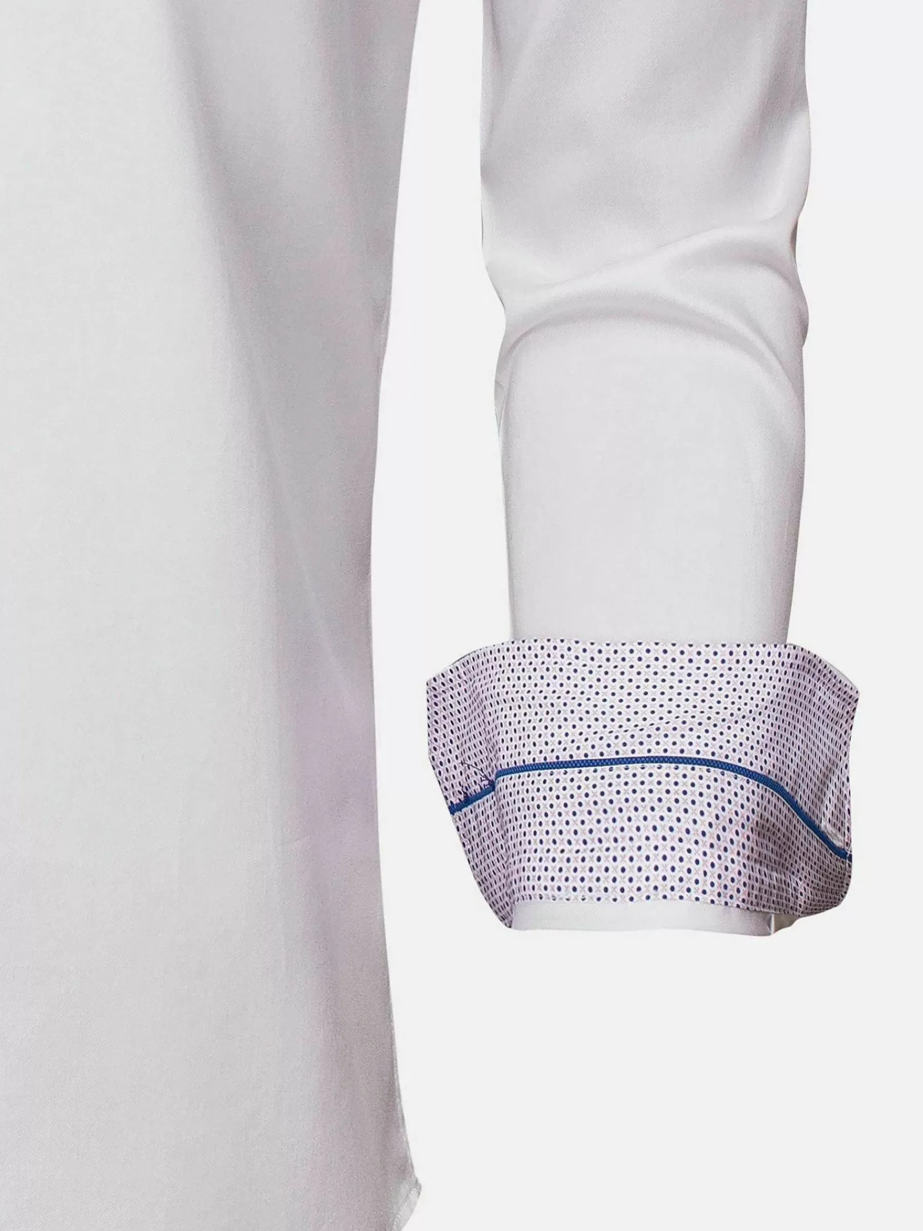 Wit Getailleerd Overhemd Met Een Mooie, Subtiele Blauwe Belijning Langs De Knoopsluiting. Dit Model Heeft Met Een Stippenpatroon Aan De Binnenkant Van De Kraag En Manchet Een Opvallend Design.