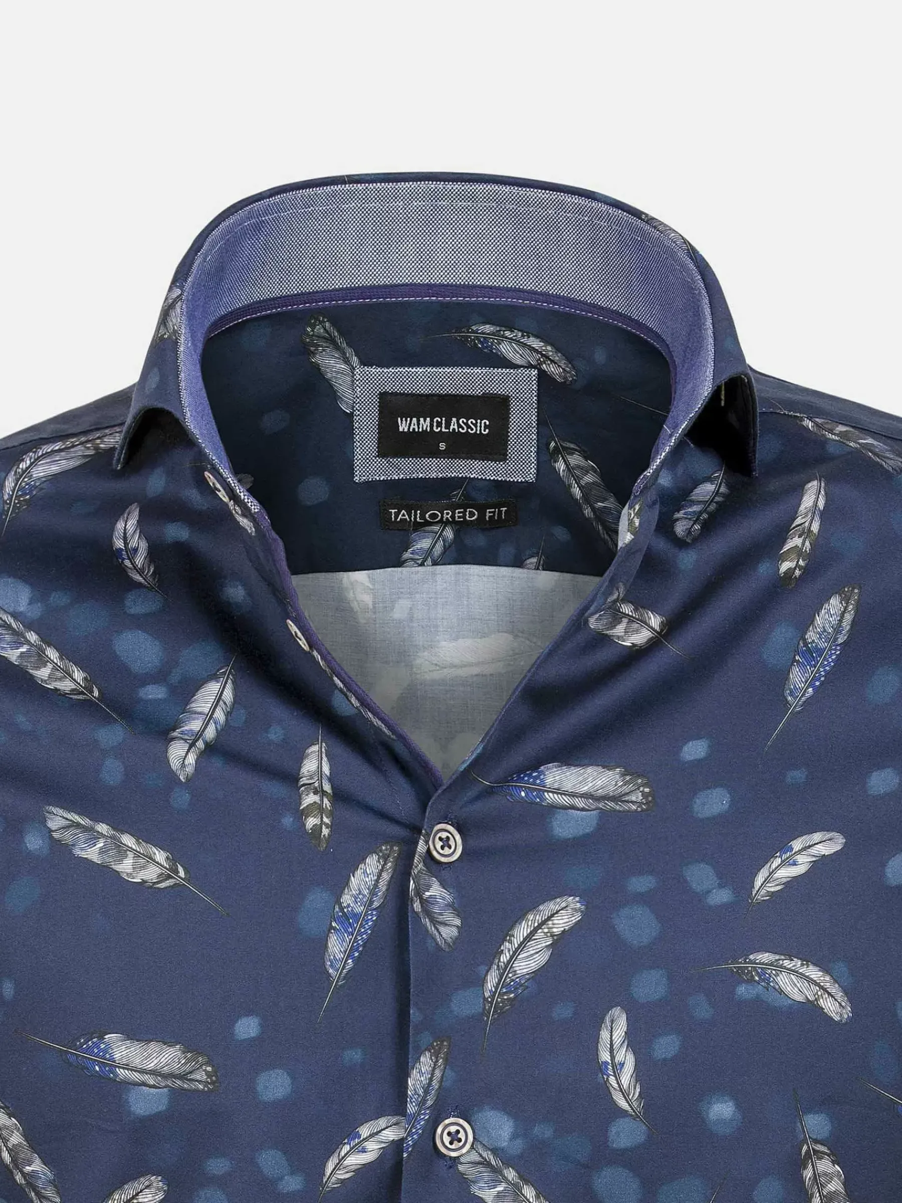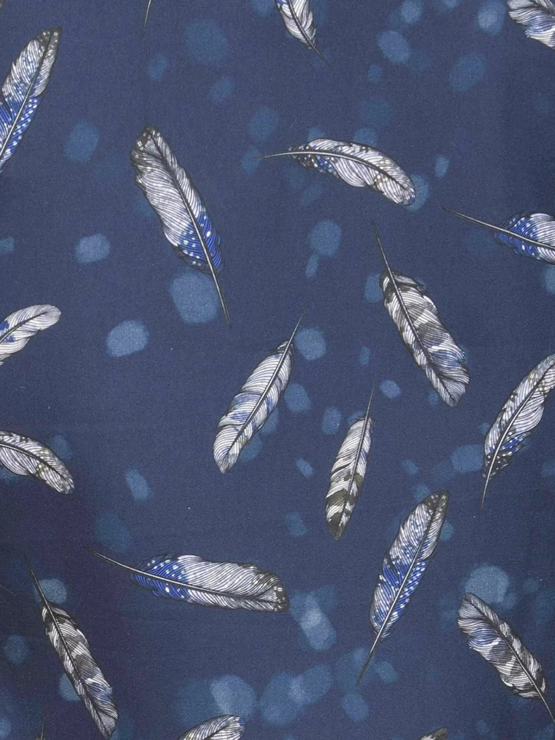Navy Kleurig Overhemd Met Een Print Van Veren In De Kleuren Zwart, Wit, Grijs En Donkerblauw. De Knopen Zijn Wit En Lichtbruin Van Kleur En De Onderkant Loopt Iets Rond Af.