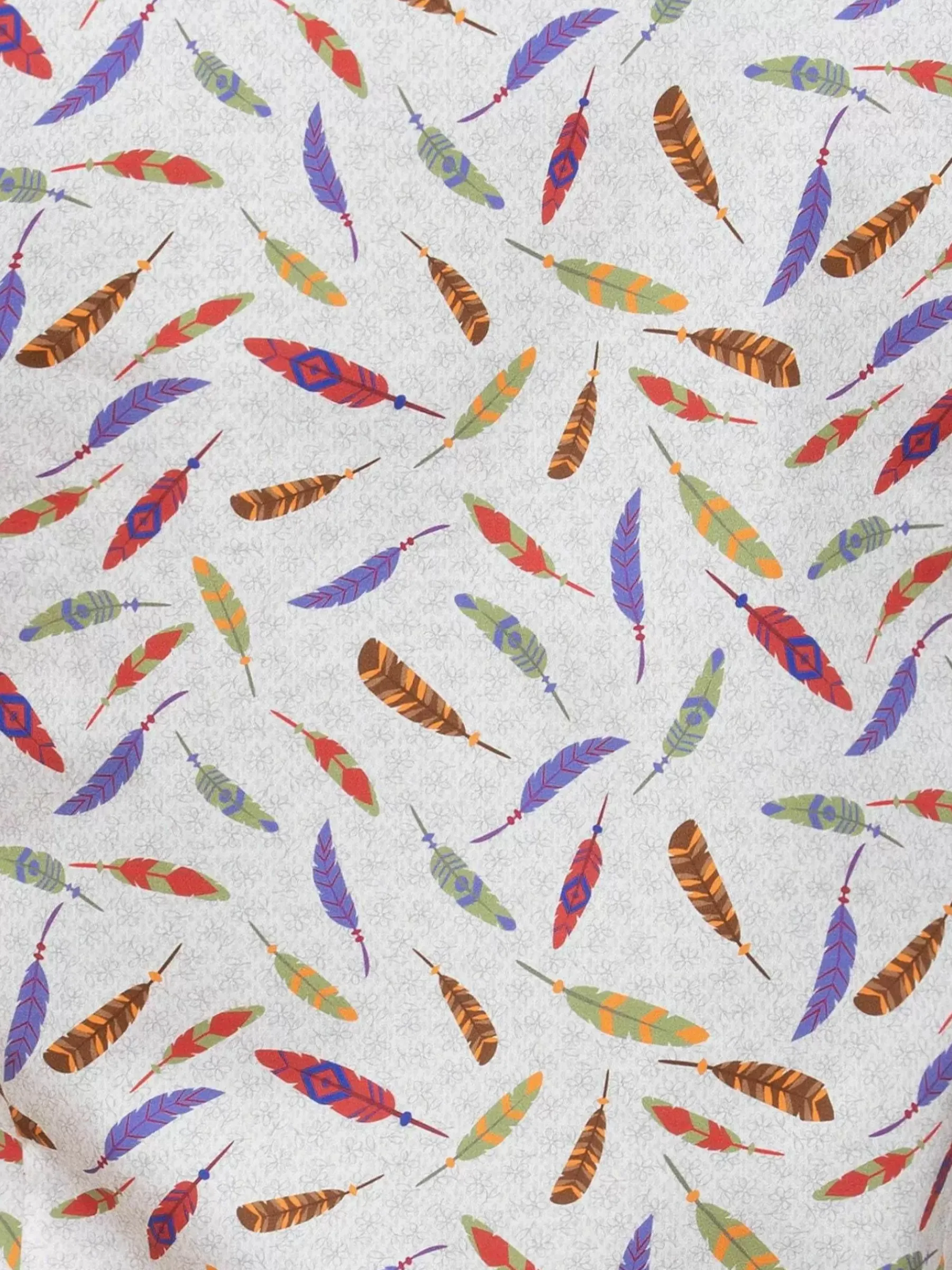 Beige Overhemd Met Een Patroon Van Vogelveren In Beige, Blauw En Groen. Loopt Rond Van Onderen En Heeft Witte Ronde Knopen. Staat Leuk Bij Een Broek En Jeans.