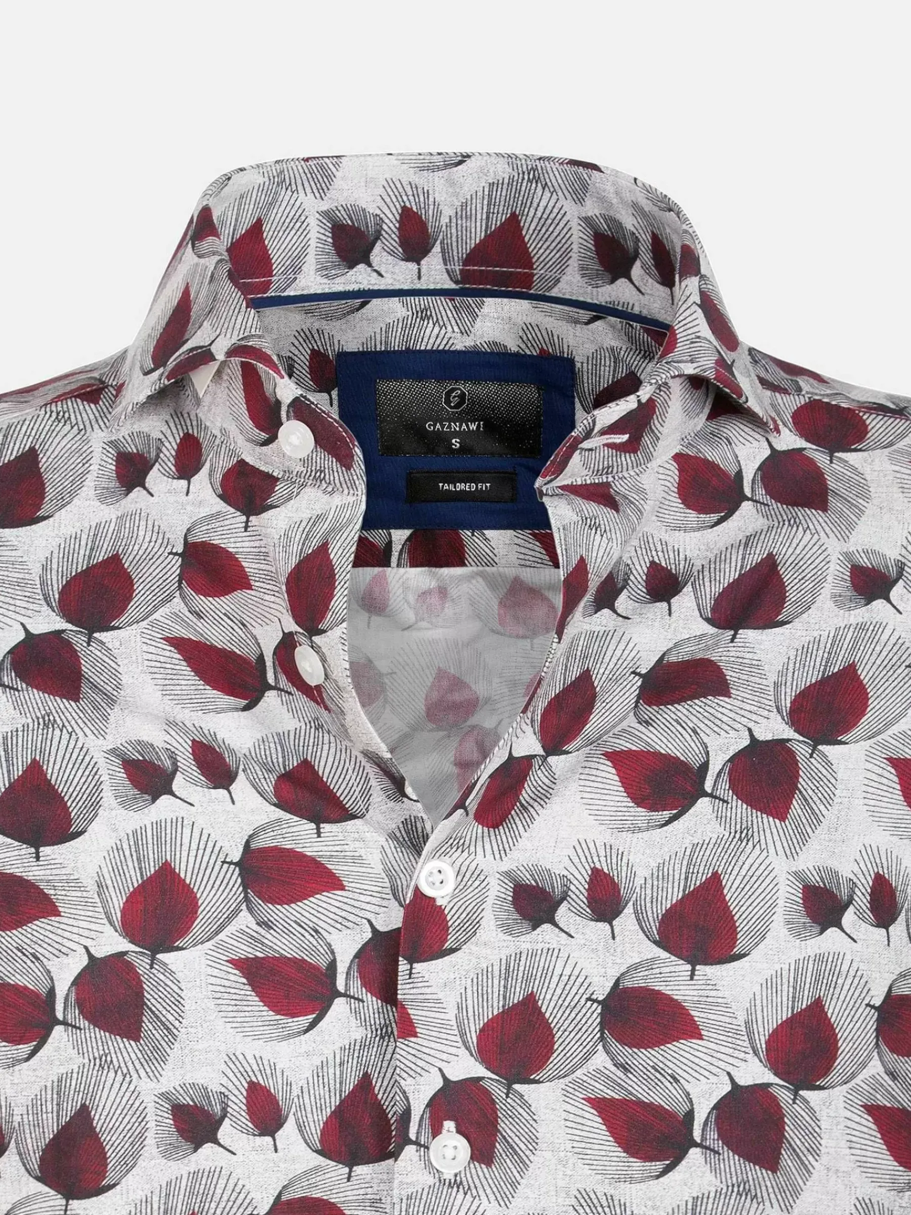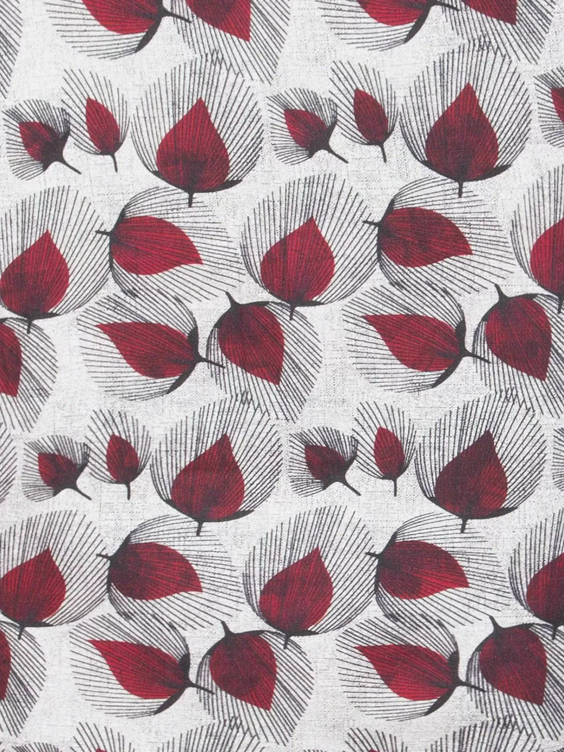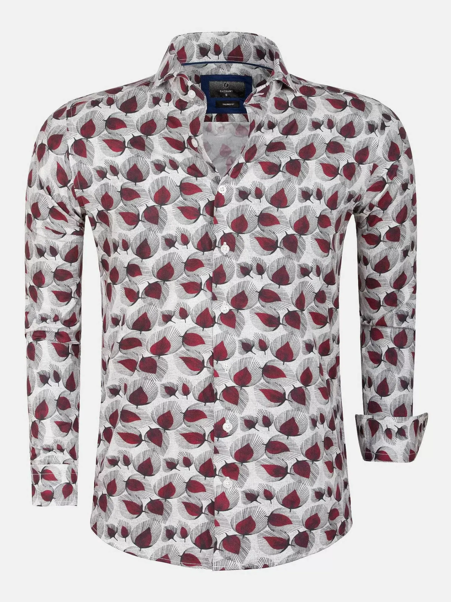 Overhemd Met Bordeauxrode Bladeren Op Een Gebroken Witte Ondergrond. Dit Model Loopt Van Onderen Rond Af. Het Overhemd Heeft Lange Mouwen En Een Knoopsluiting Met Witte, Ronde Knopen.