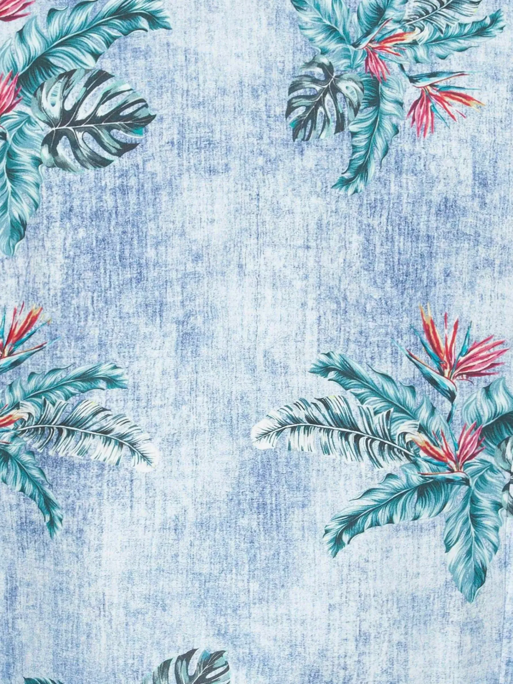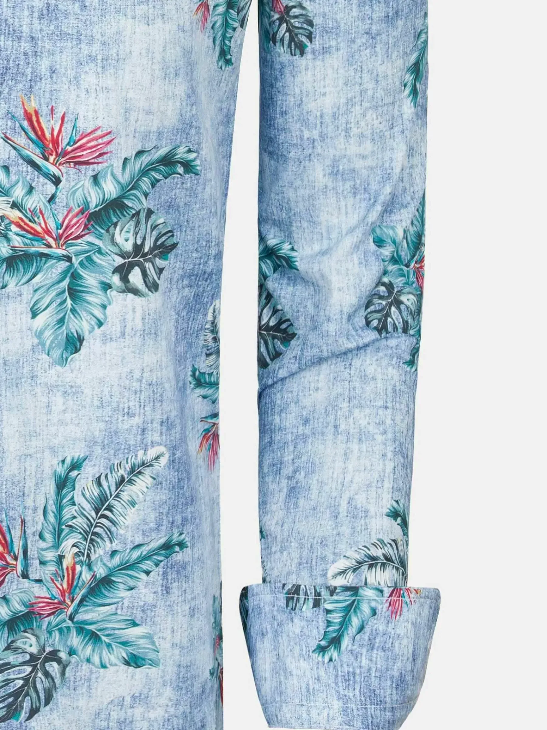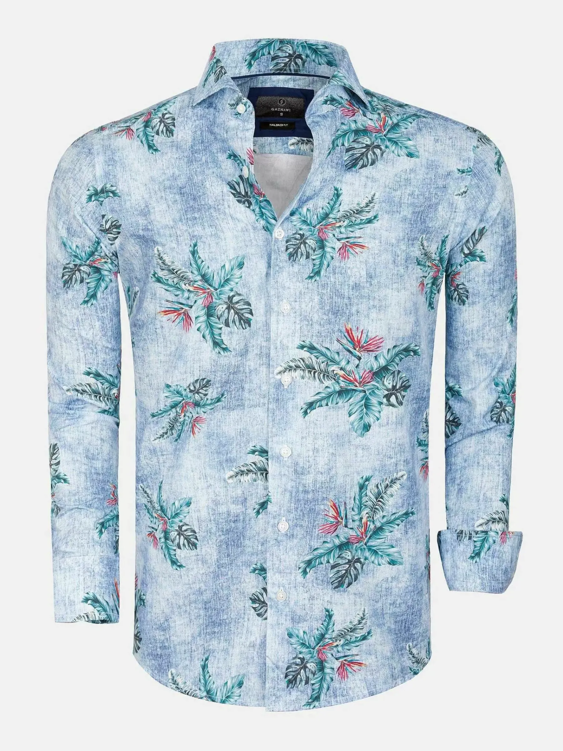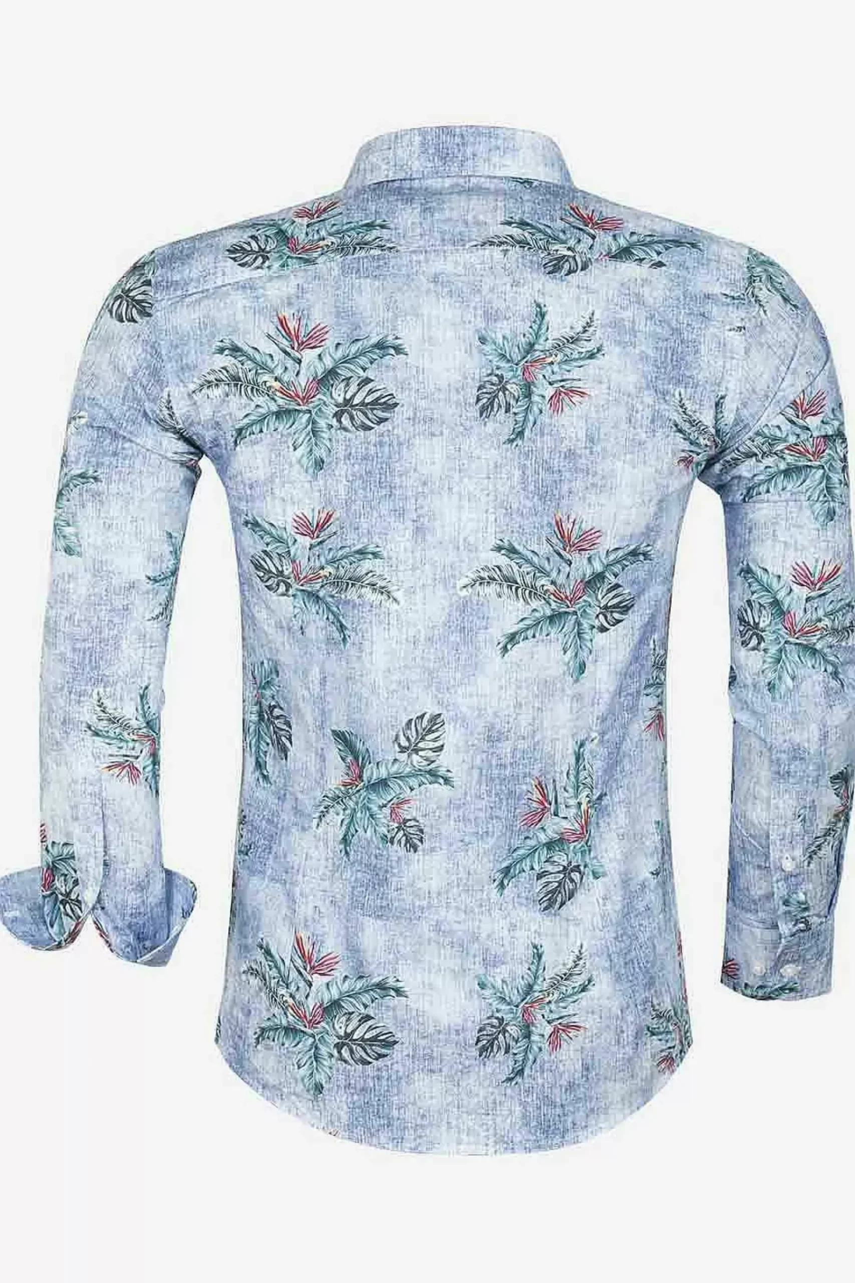 Overhemd Met Opvallende Kleurencombinatie. Het Bladpatroon Heeft Een Mooie Groene Kleur En Subtiele, Donkerrode Elementen. Dit Overhemd Met Een Dominante Blauwe Kleur Is Zowel Formeel Als Casual Te Dragen.