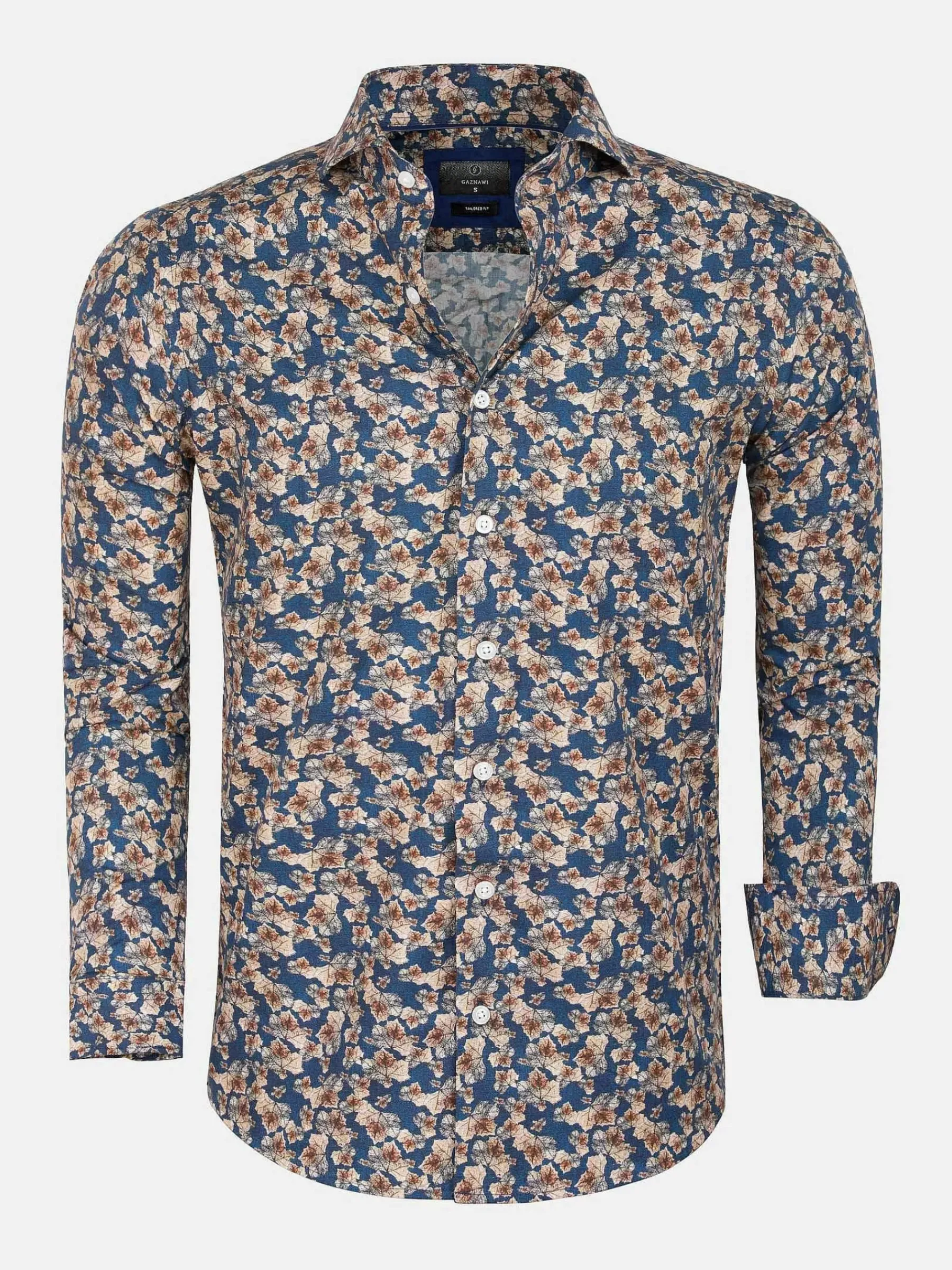Overhemd Met Een Prachtig Print Van Bruin En Beige Op Een Navy Kleurige Achtergrond. Het Overhemd Loopt Van Onderen Rond Af En Is Heel Mooi Te Combineren Met Verschillende Jeans, Een Pantalon Of Met Een Colbert.