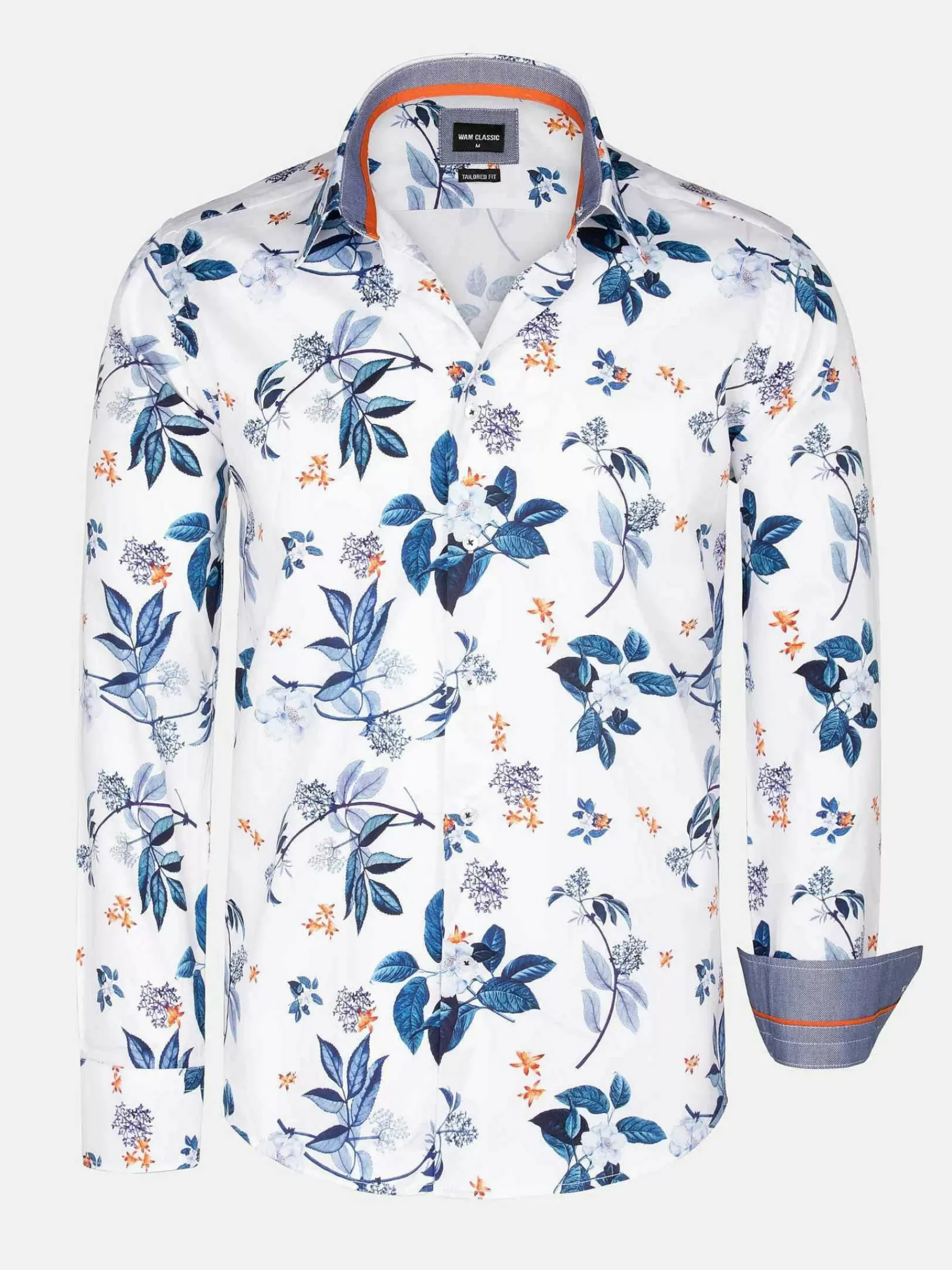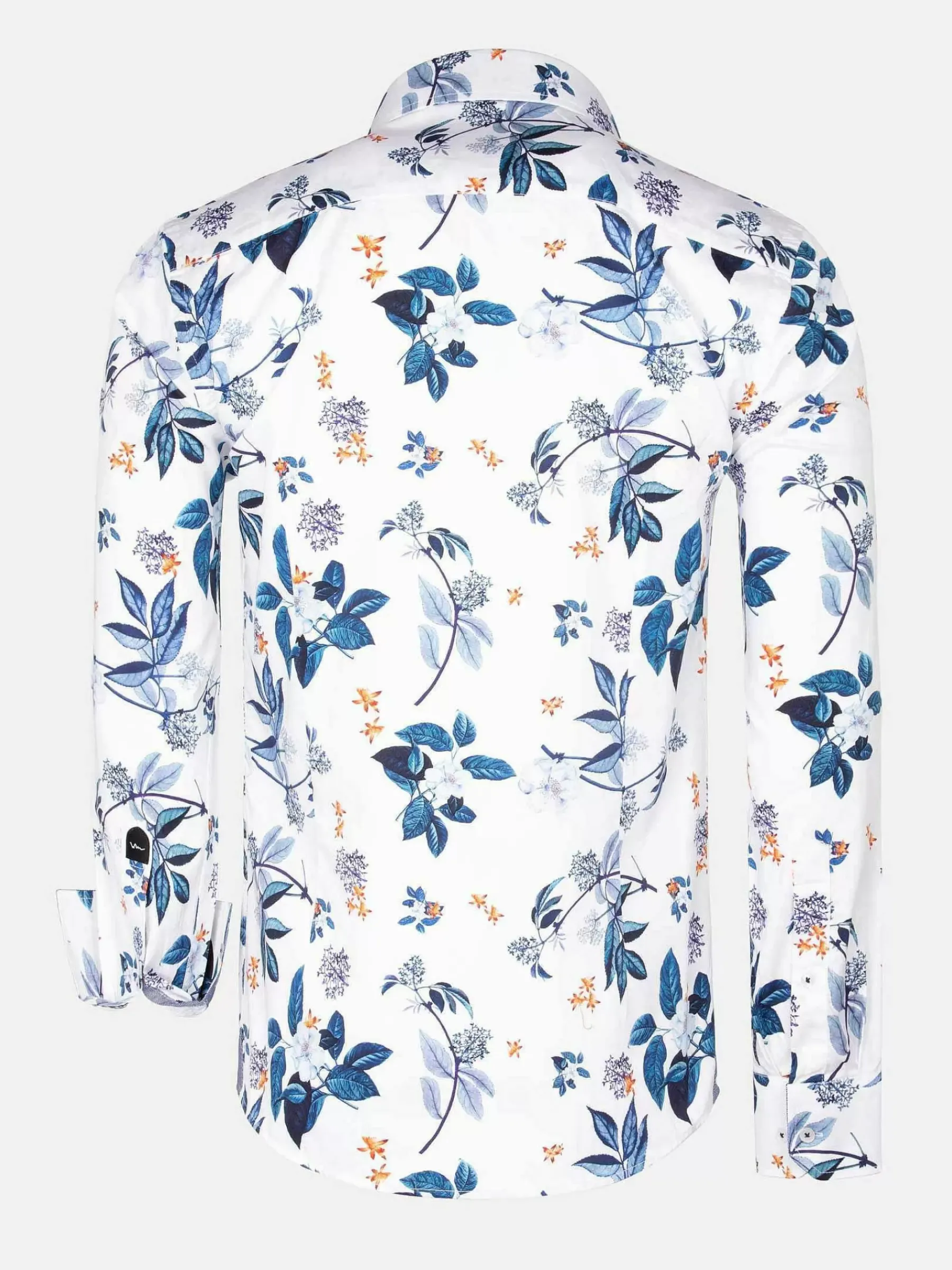 Wit Overhemd Met Bladprint. De Heldere, Mooie Blauwe Kleur Van Het Print Is Een Ware Eyecatcher. De Binnenkant Van De Kraag En Manchet Heeft Een Kleurencombinatie Van Grijsblauw En Oranje.
