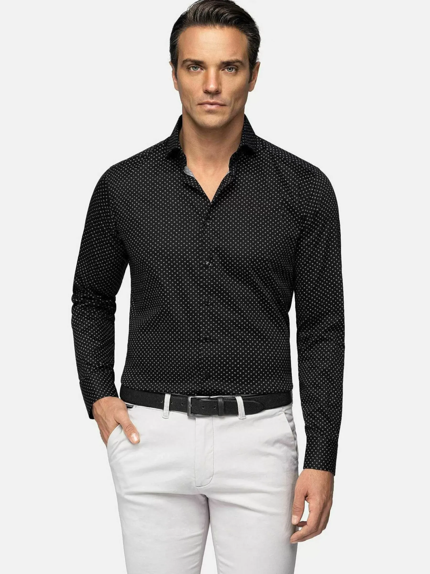 Prachtig Zwart Overhemd, Een Tijdloos Kledingstuk Waar U Steeds Weer Naar Teruggrijpt. Perfect Voor Een Zowel Chique Als Casual Outfit. Dit Model Heeft Een Cutaway Kraag En Loopt Van Onderen Licht Rond Af. Sluit Perfect Om Het Lichaam.