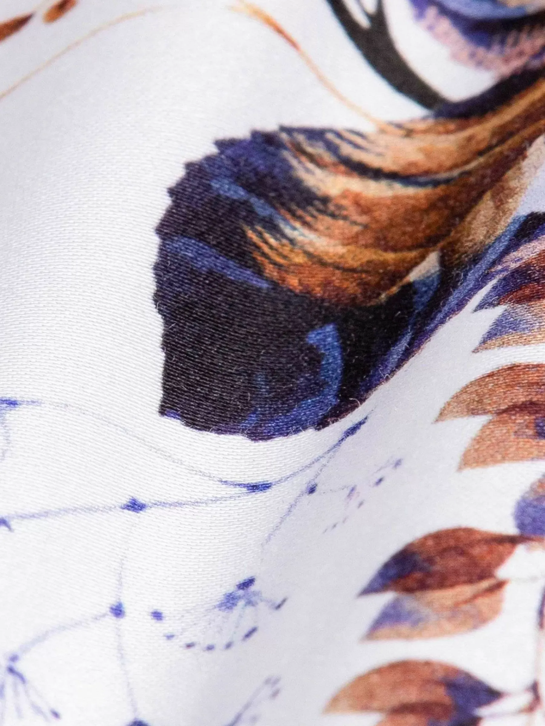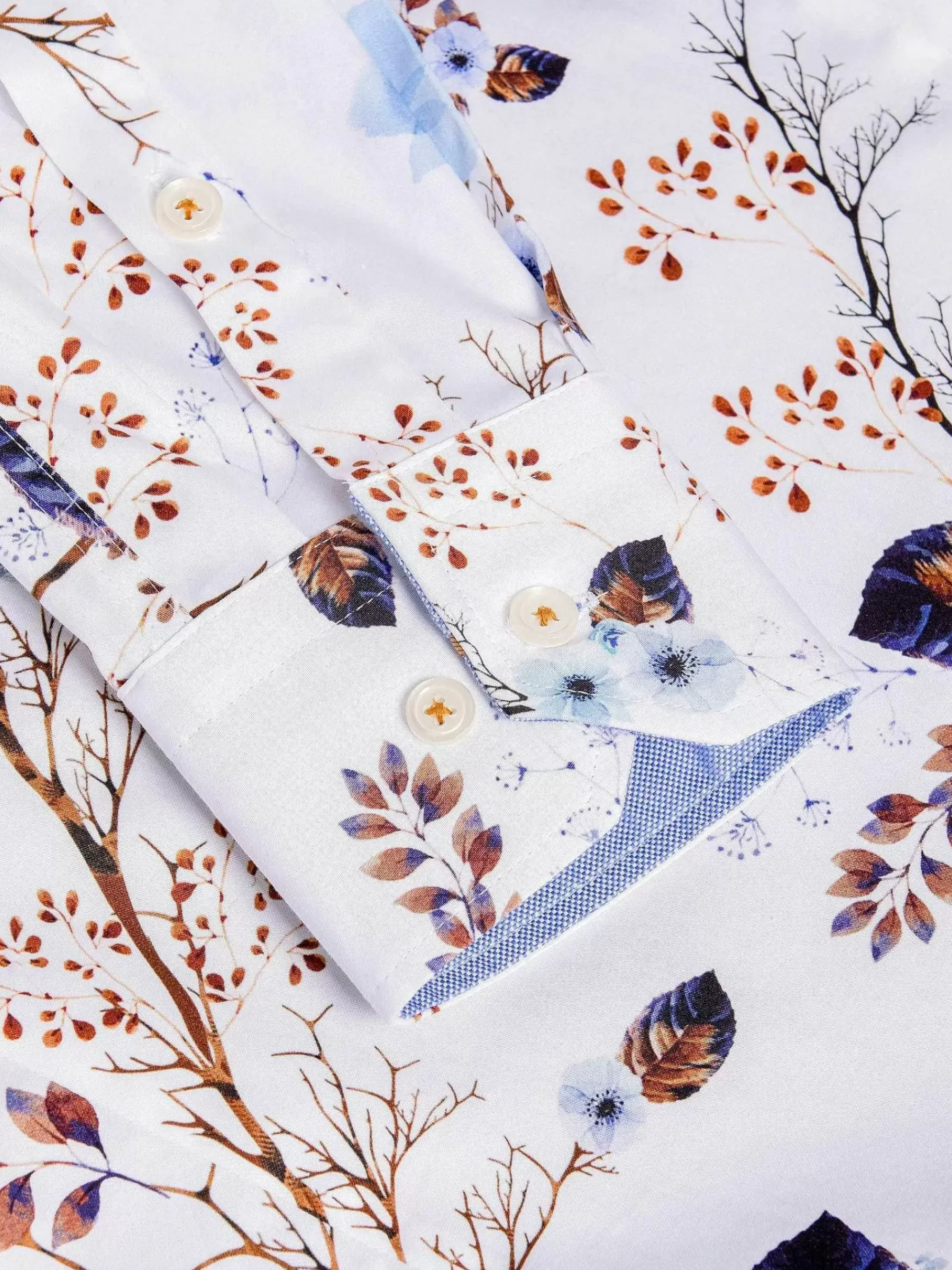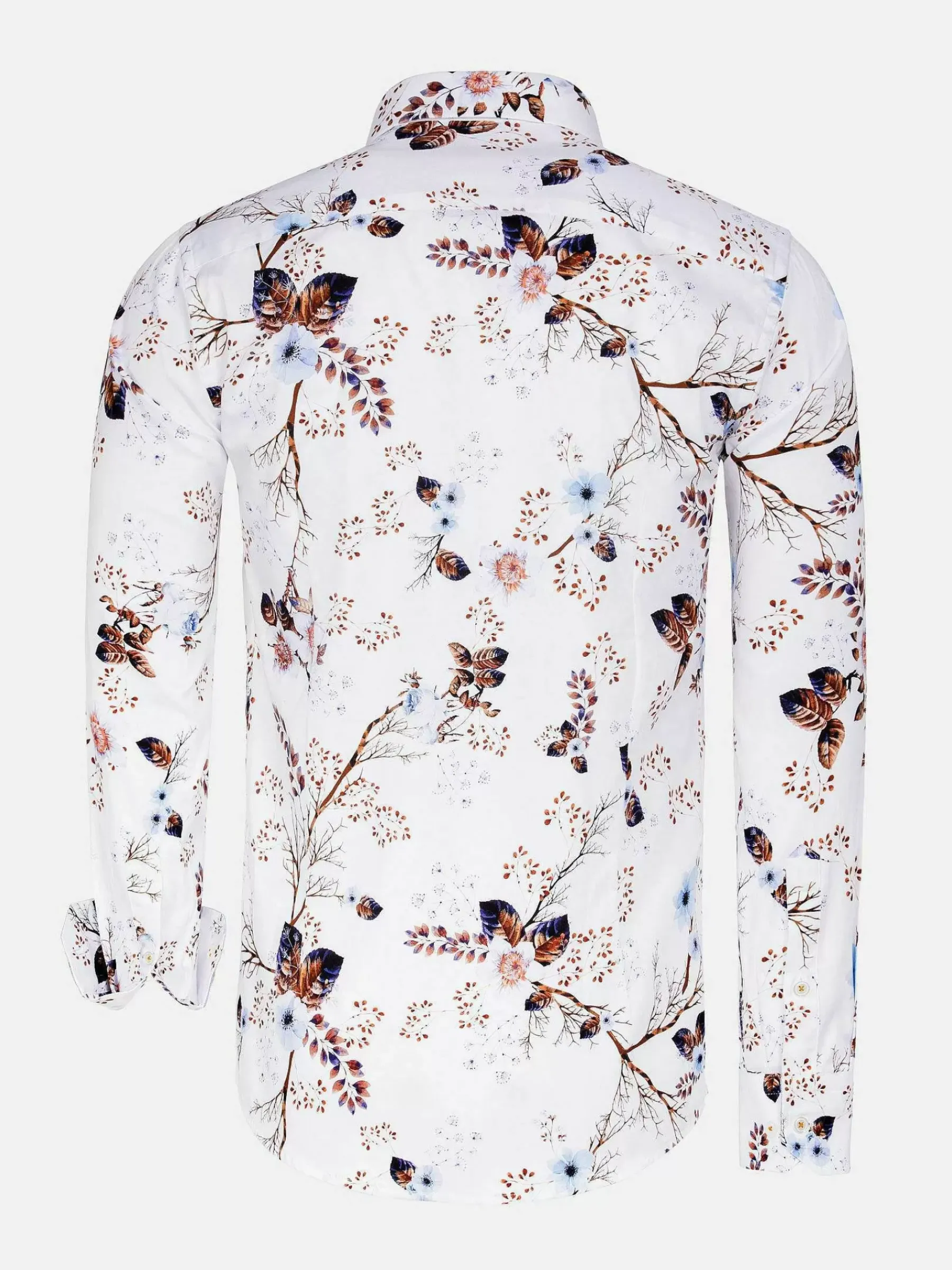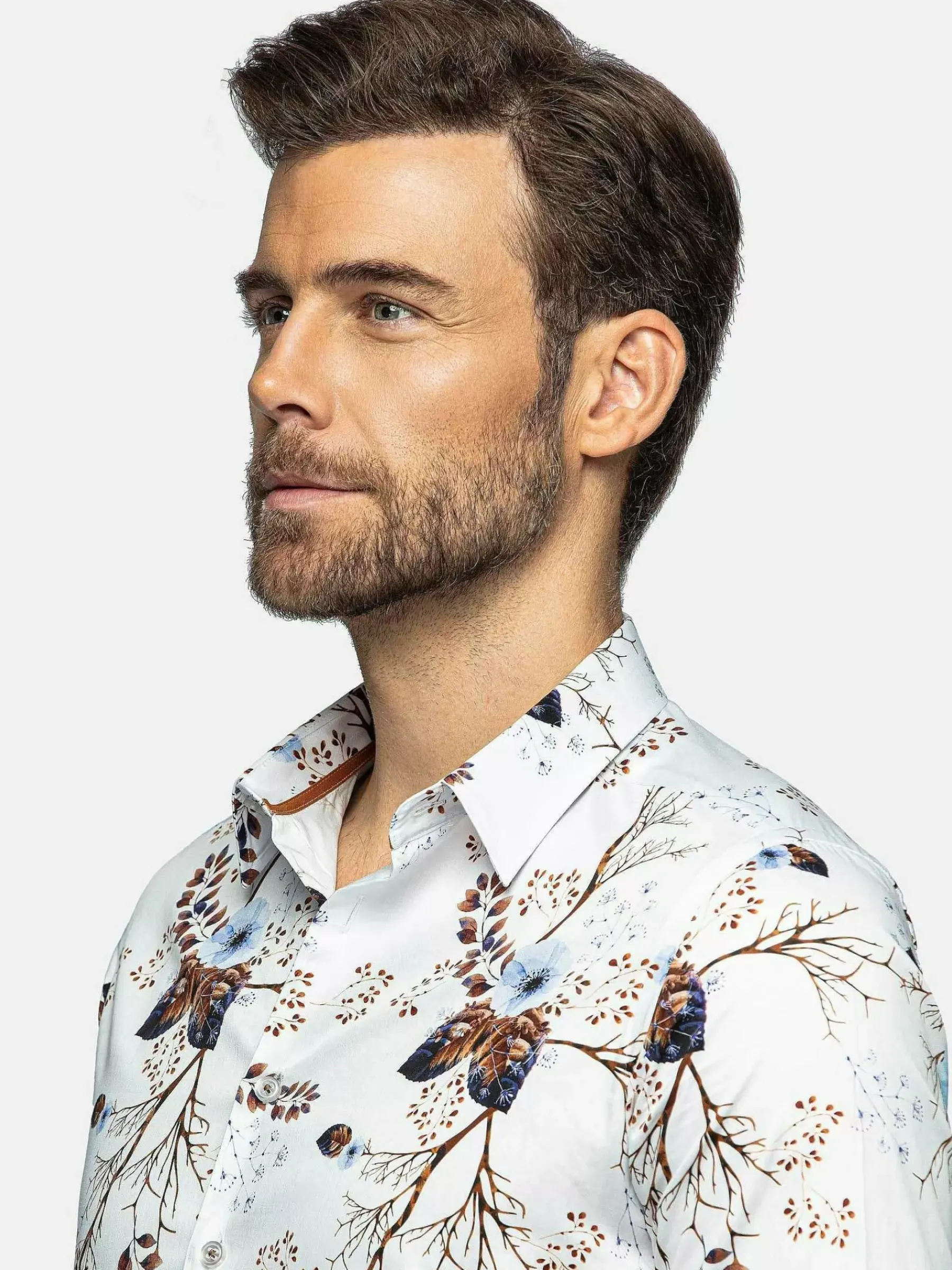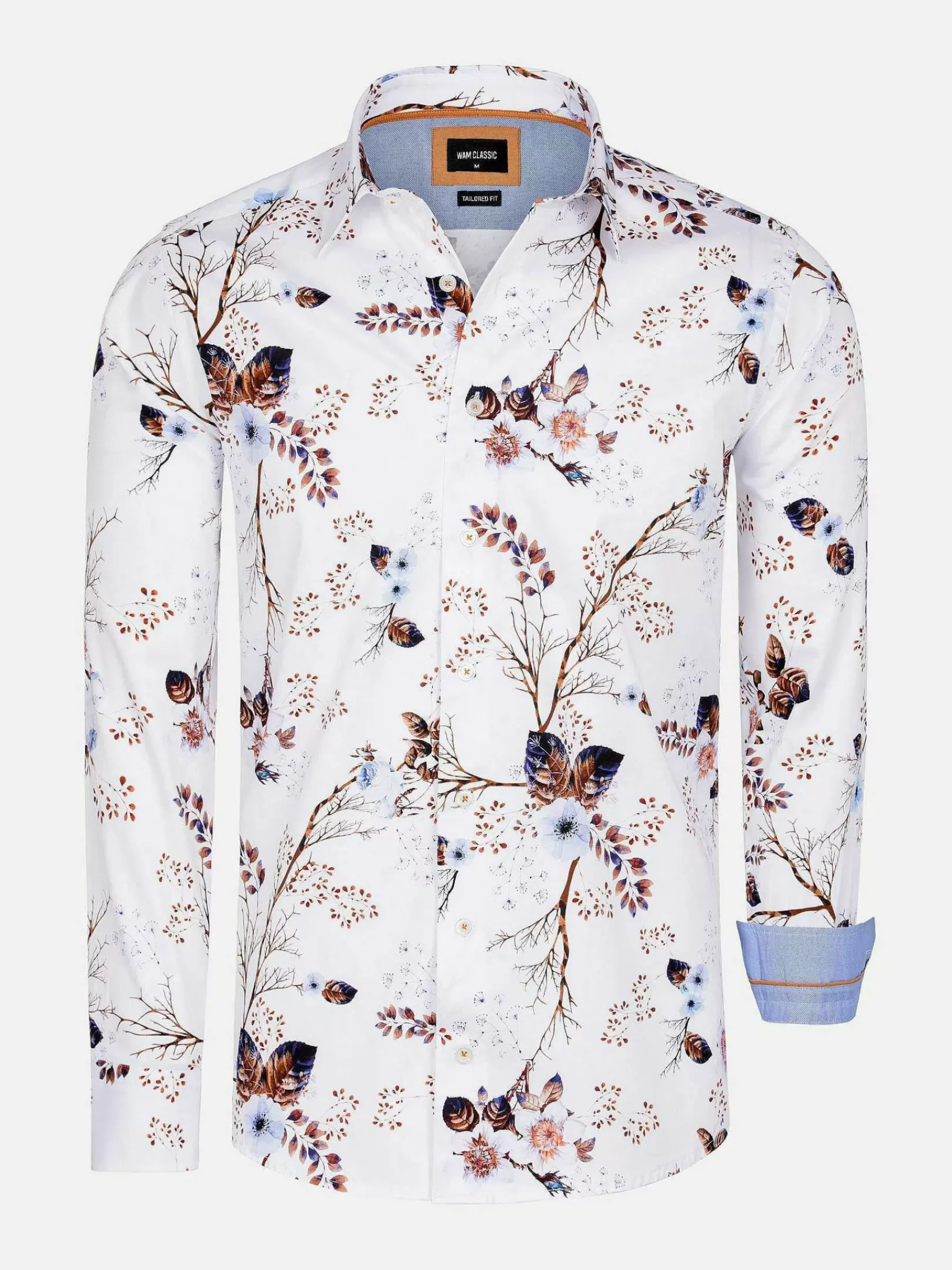 Wit Overhemd Met Een Mooie Decoratie Van Lichtbruin En Blauw. Een Overhemd Die In Het Oog Sprint En Elke Outfit Een Boost Geeft. Kan Zowel Op Een Pantalon Als Op Een Jeans Gedragen Worden.
