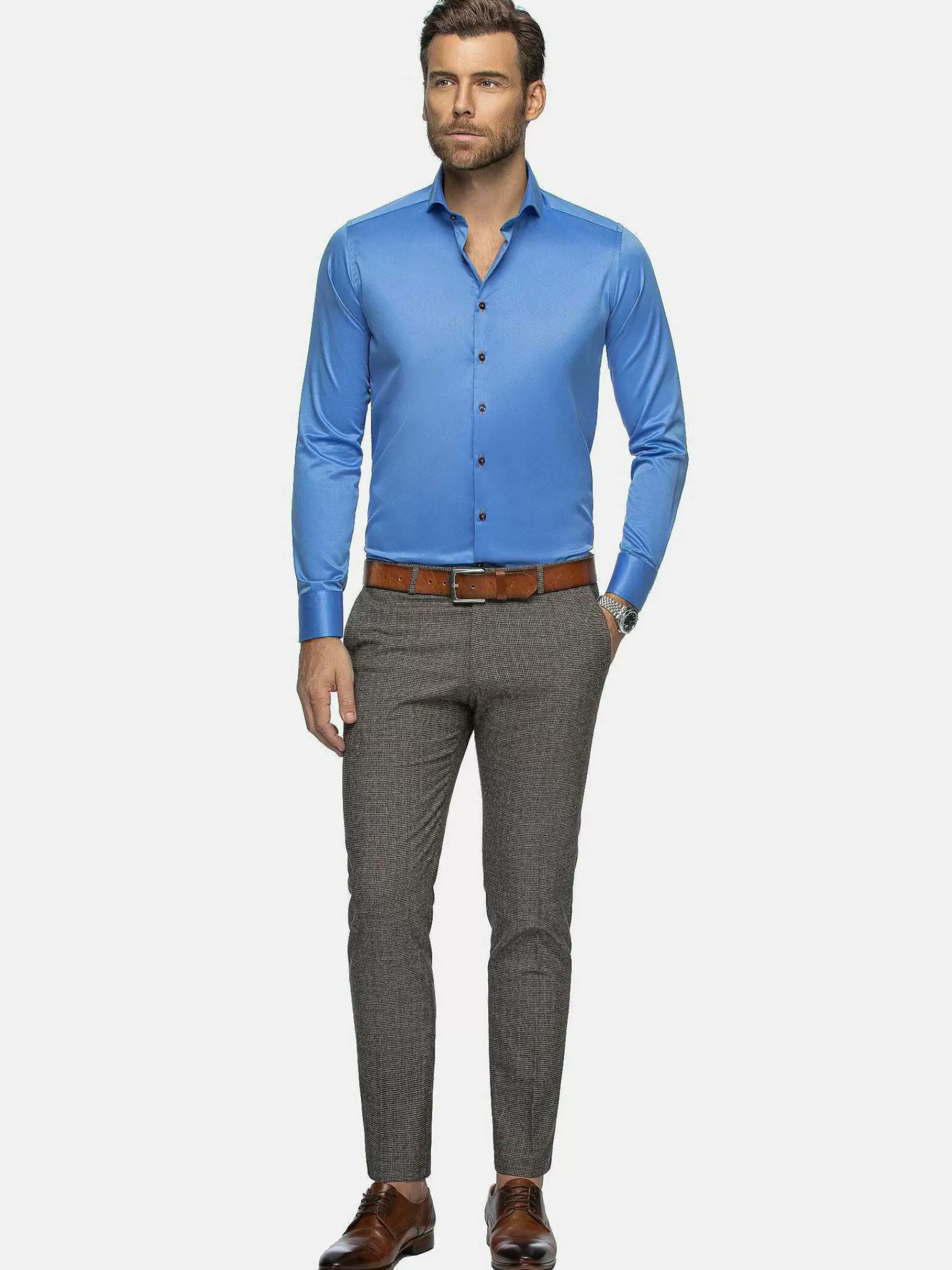 Overhemd In Een Opvallend Mooie Kleur Blauw. Het Overhemd Heeft Een Chique Uitstraling En Is Mooi Afgewerkt Met Details In De Kleur Beige. Ideaal Overhemd Voor Een Strakke, Zakelijke Outfit. Staat Mooi Met Een Colbert En Uw Favoriete Stropdas.