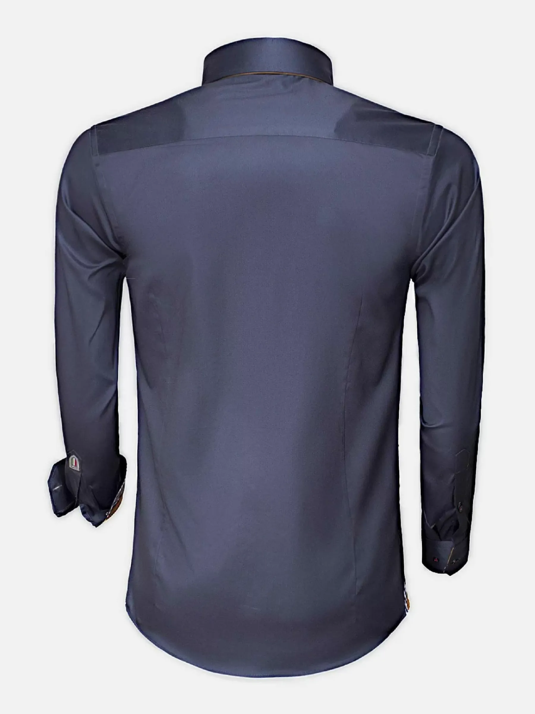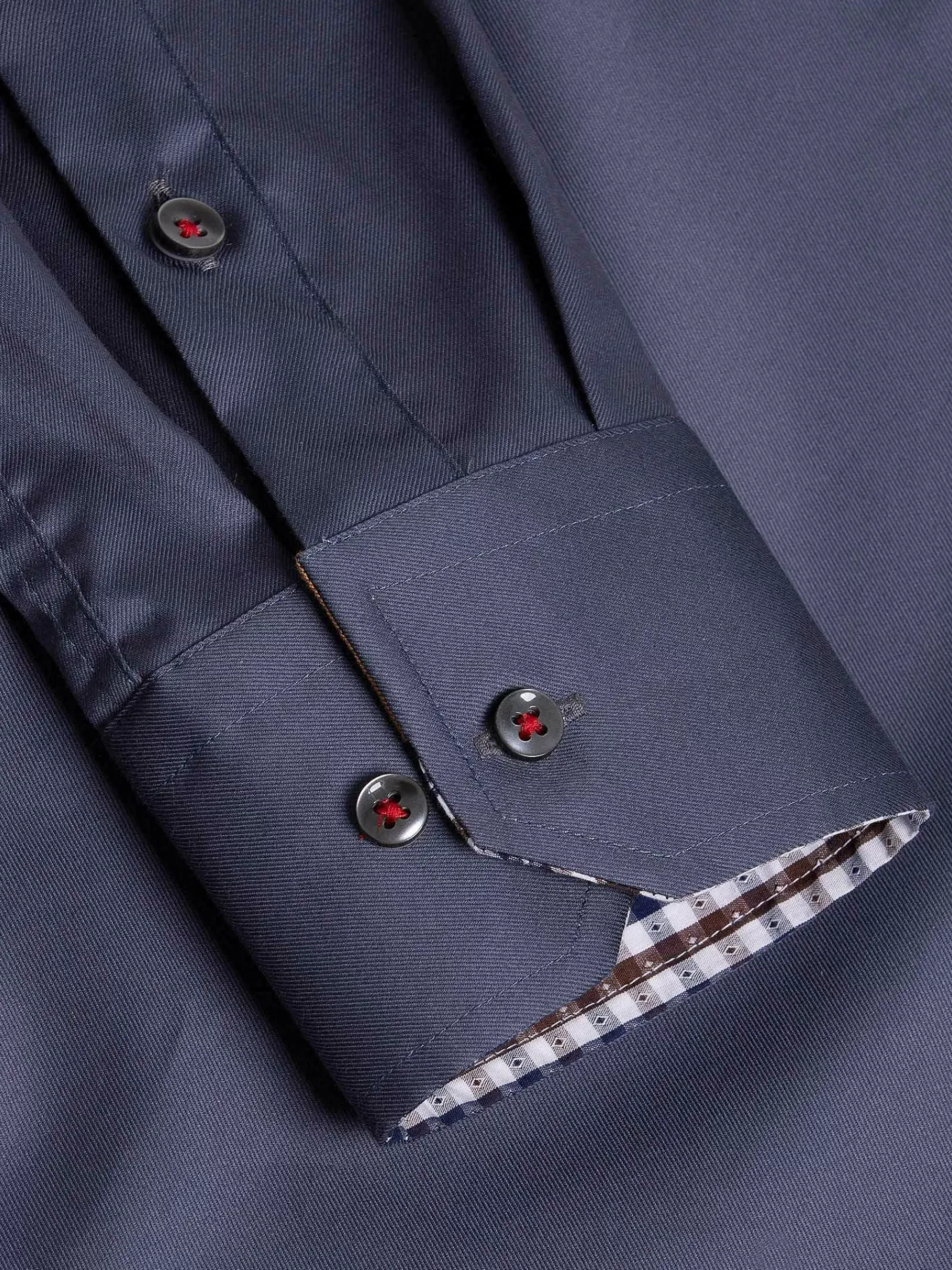 Antraciet Overhemd Met Dubbele Kraag Met Drie Knopen. Het Overhemd Heeft Een Mooie Glans En Diverse Details. Aan De Binnenkant Van De Kraag En Manchetten Zit Een Mooi Stippenpatroon.