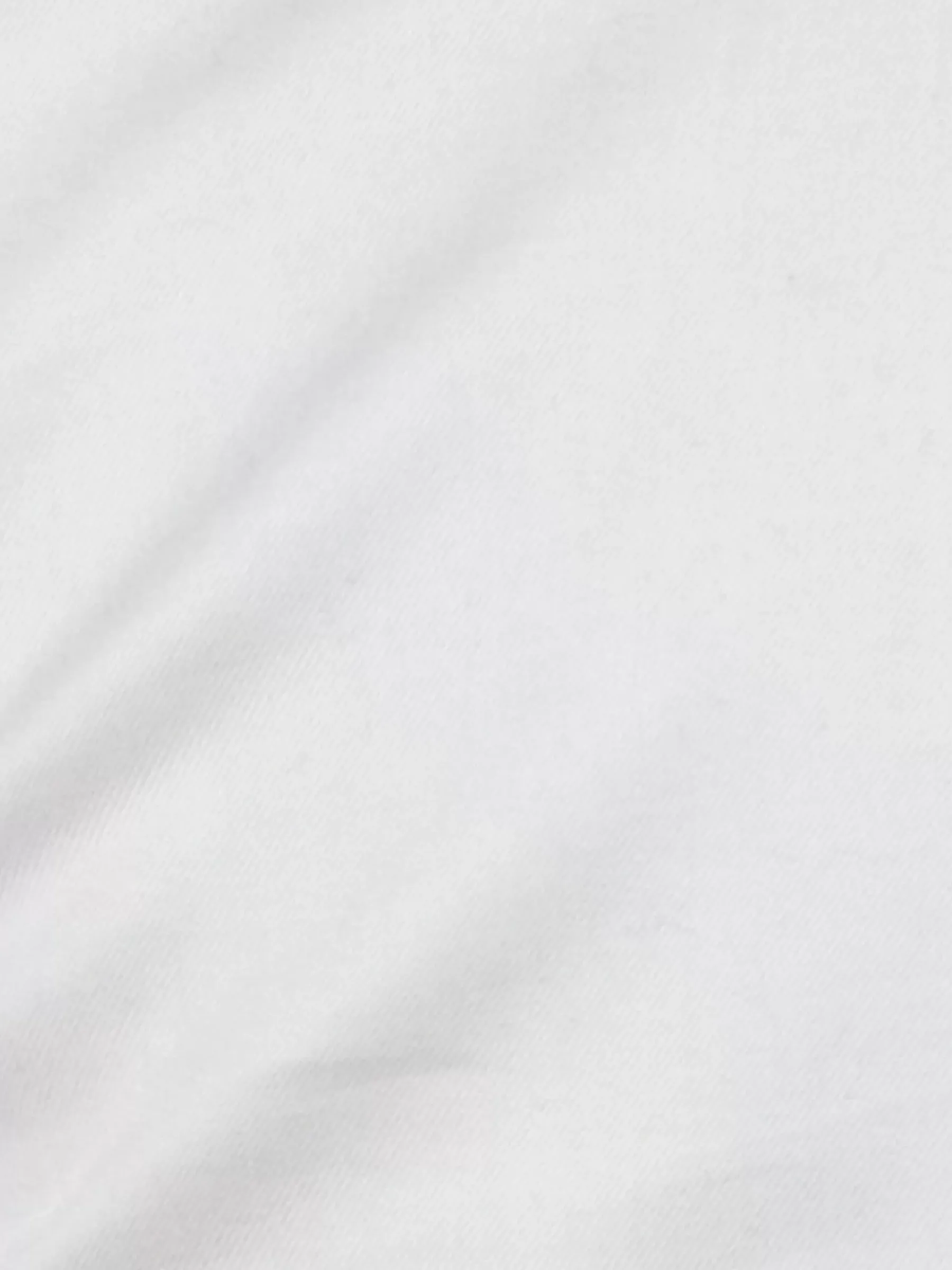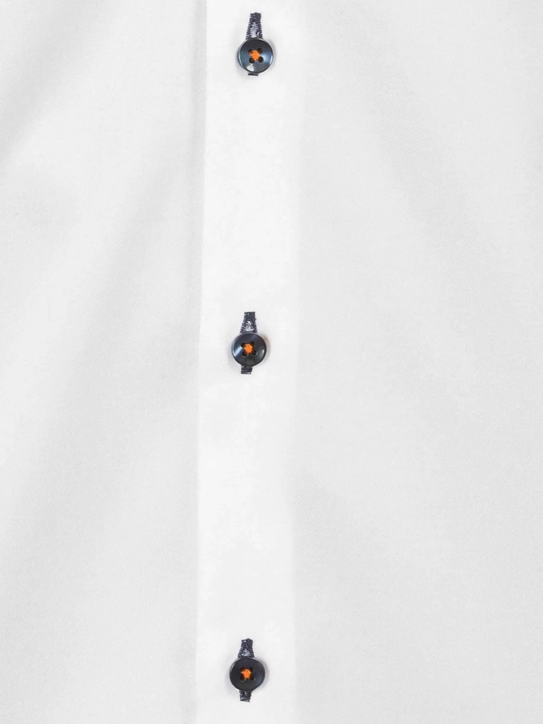 Wit Overhemd Met Een Mooie Glans. Het Overhemd Is Gedetailleerd Afgewerkt Met Extra Knopen In De Hals En Manchetten In De Kleurencombinatie Grijs En Royal Blue. Van Onderen Loopt Het Overhemd Rond Af.
