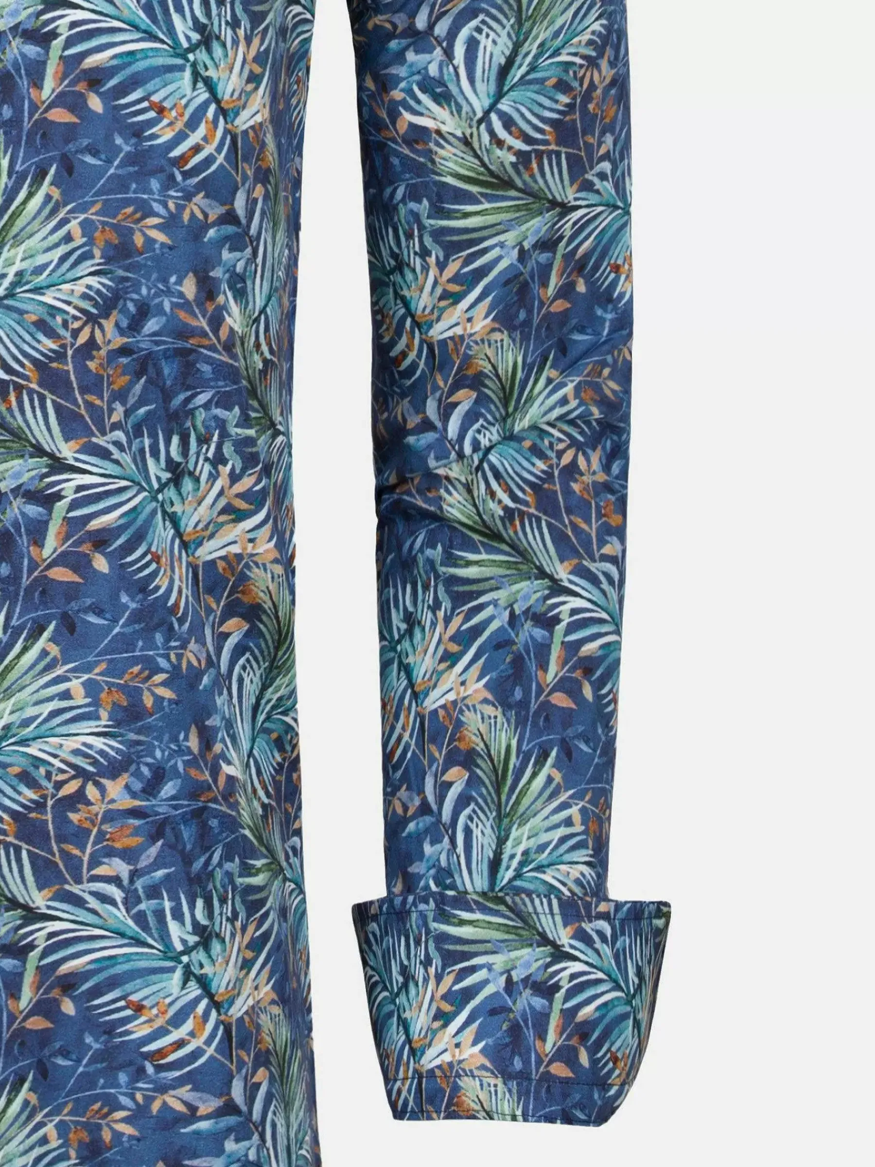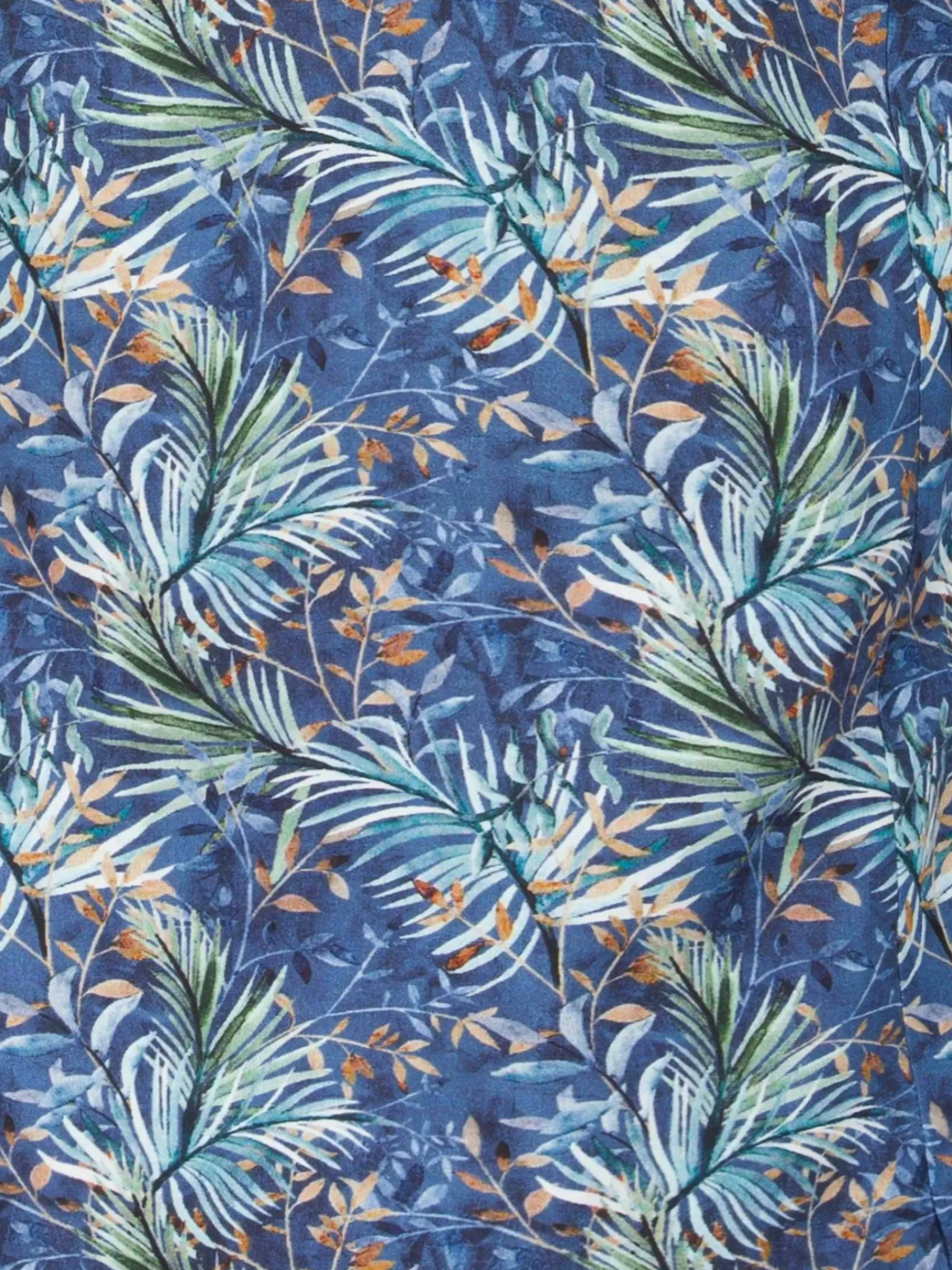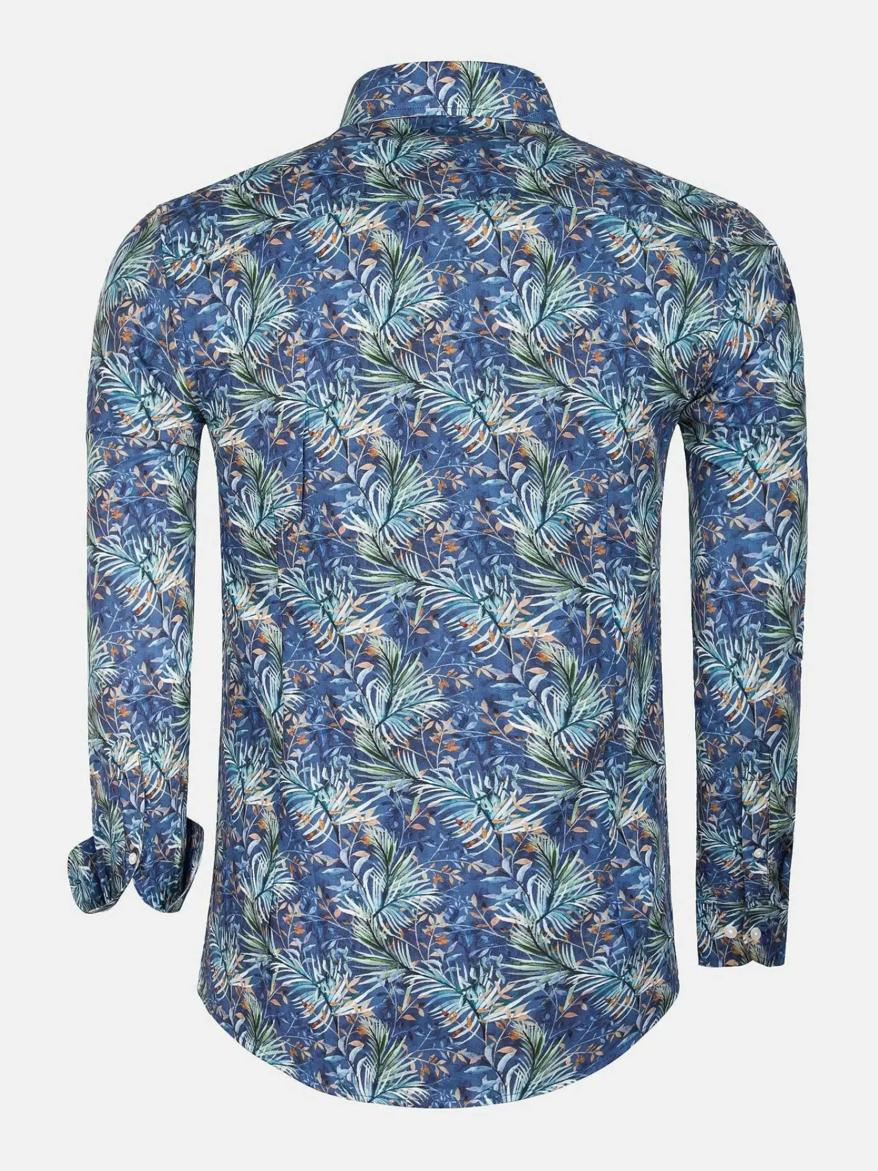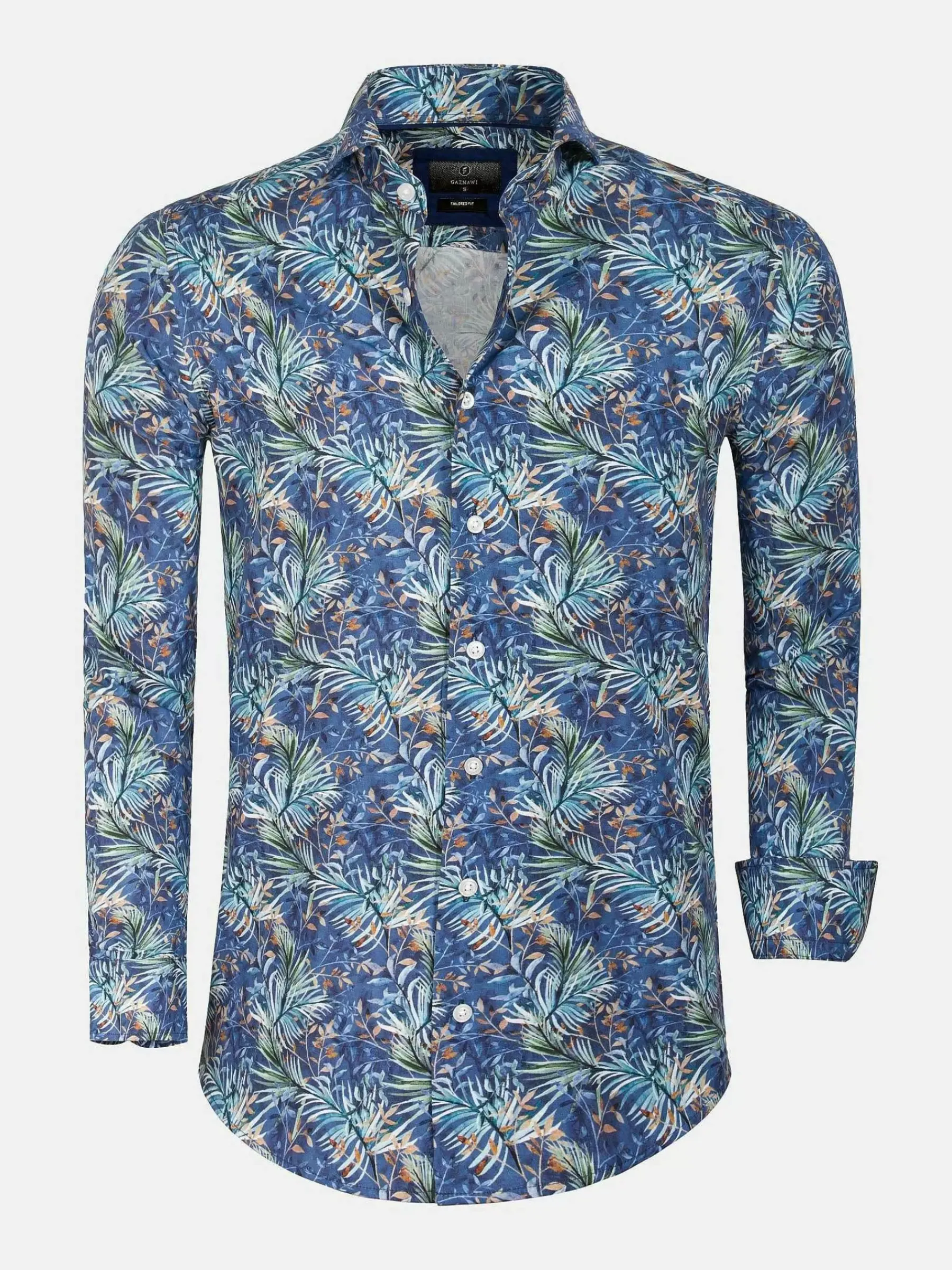 Blauw Overhemd Met Een Kleurig Bladprint. Het Print Heeft De Kleuren Groen, Blauw En Beige. Het Overhemd Loopt Van Onderen Rond Af En Staat Mooi Op Een Effen Jeans.
