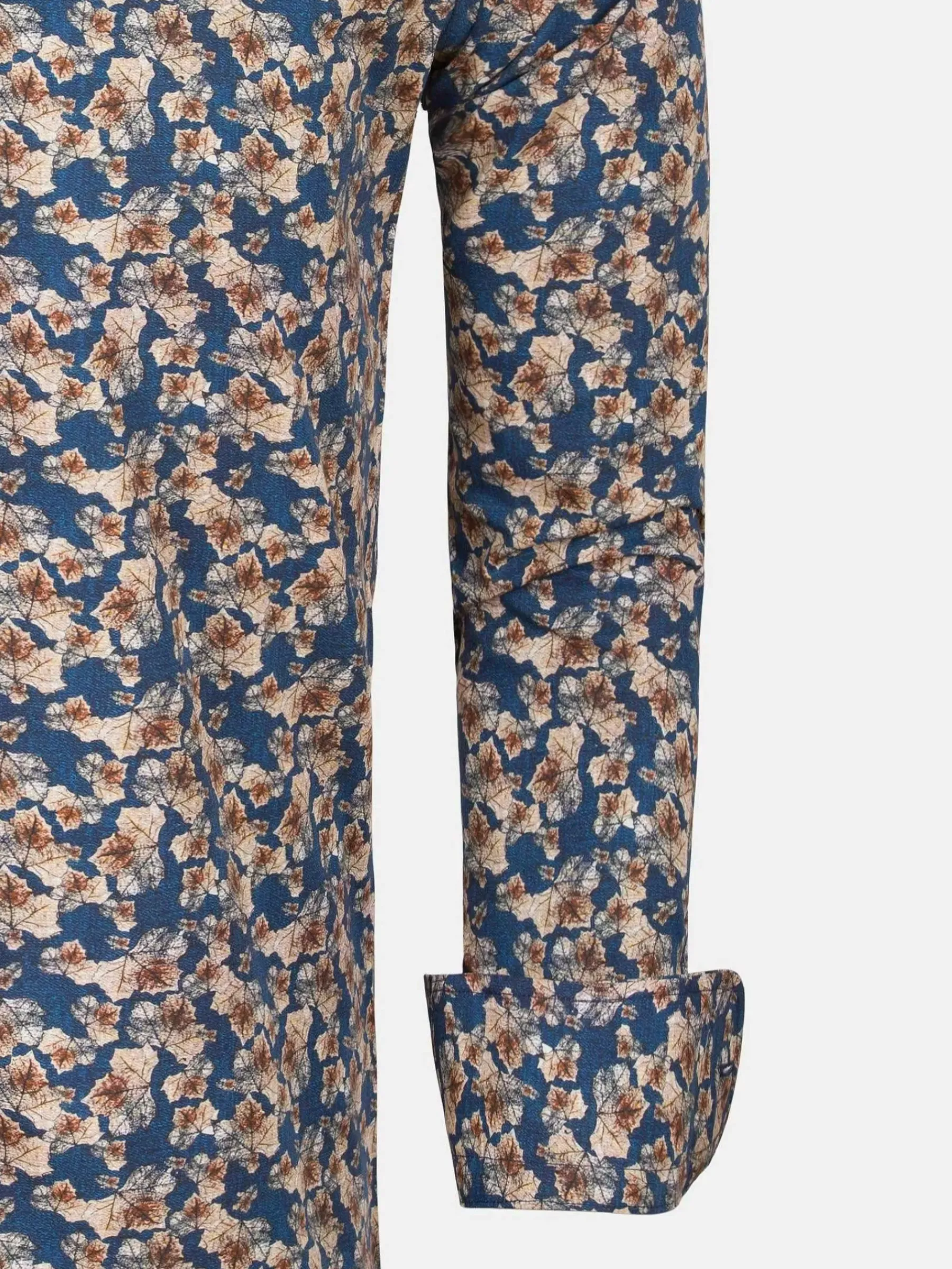 Overhemd Met Een Prachtig Print Van Bruin En Beige Op Een Navy Kleurige Achtergrond. Het Overhemd Loopt Van Onderen Rond Af En Is Heel Mooi Te Combineren Met Verschillende Jeans, Een Pantalon Of Met Een Colbert.