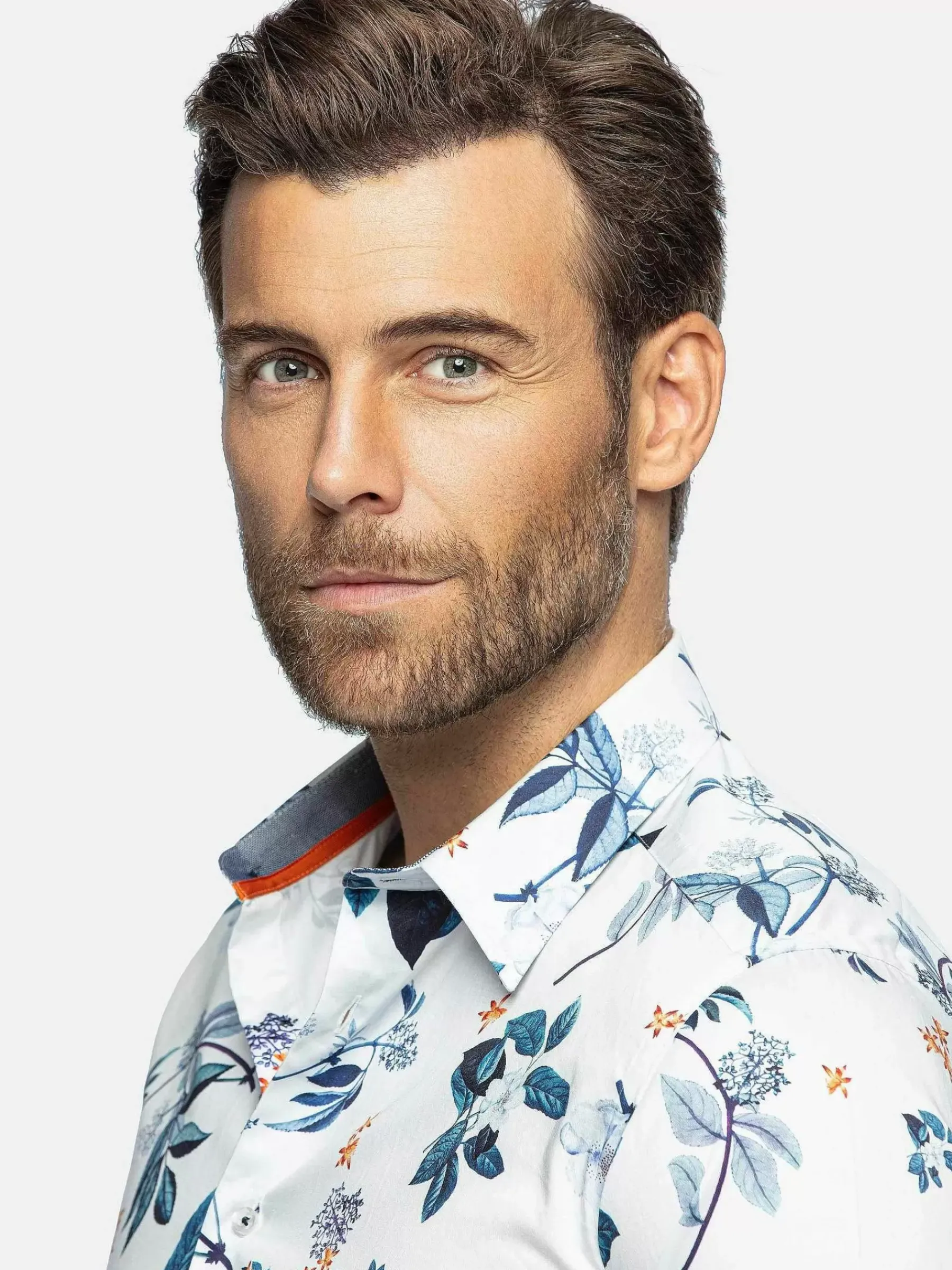Wit Overhemd Met Bladprint. De Heldere, Mooie Blauwe Kleur Van Het Print Is Een Ware Eyecatcher. De Binnenkant Van De Kraag En Manchet Heeft Een Kleurencombinatie Van Grijsblauw En Oranje.