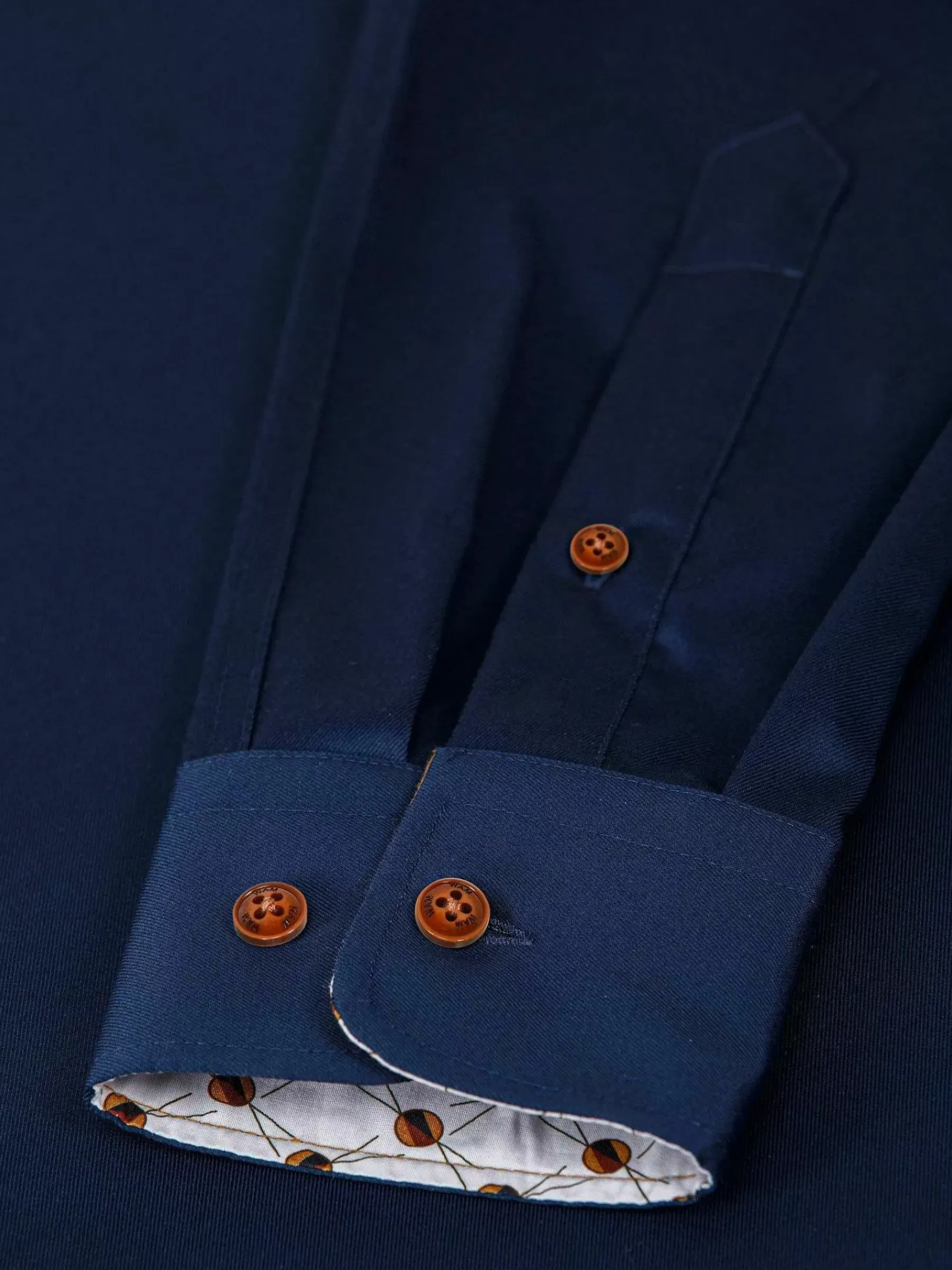 Donkerblauw Overhemd Met Cognac Kleurige Knopen En Doorlopende Bies. Het Overhemd Heeft Een Mooie Glans En Verschillende Details. De Binnenkant Van De Kraag En Manchet Heeft Een Fraai Patroon Van Stippen.