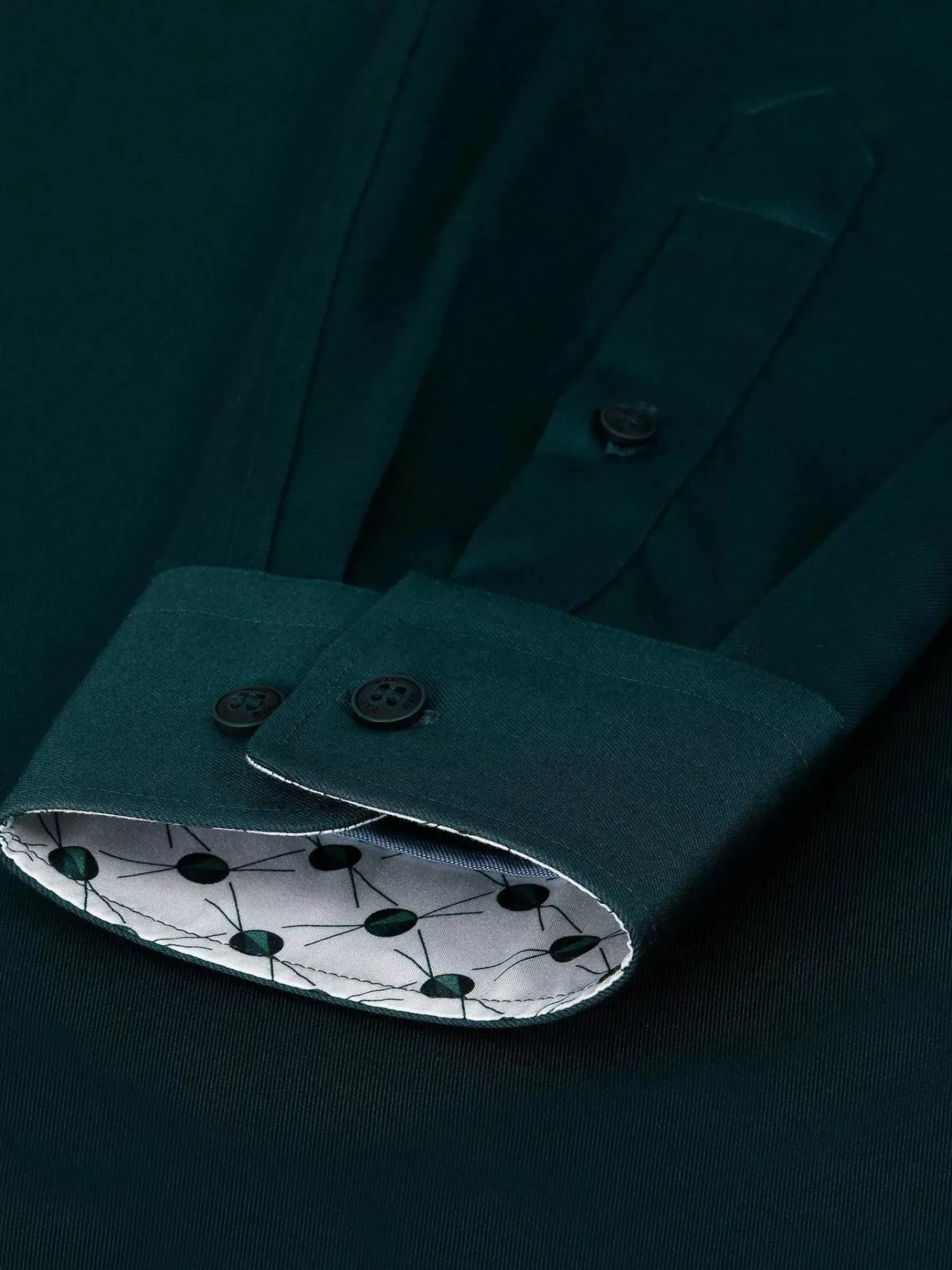 Petrol Overhemd Met Cognackleurige Knopen En Doorlopende Bies. Het Overhemd Heeft Een Mooie Glans En Verschillende Details. De Binnenkant Van De Kraag En Manchet Heeft Een Leuk Stippenpatroon.