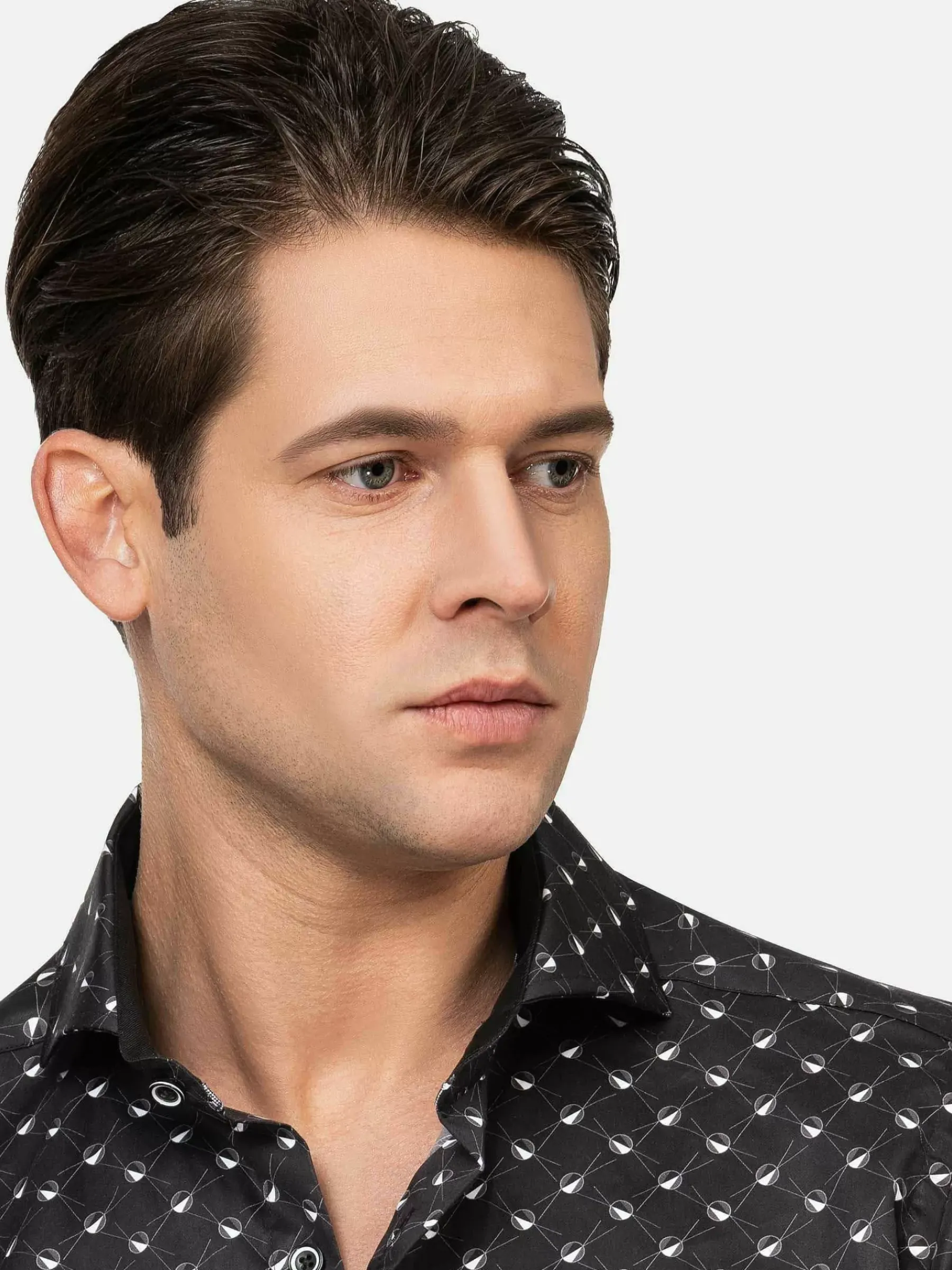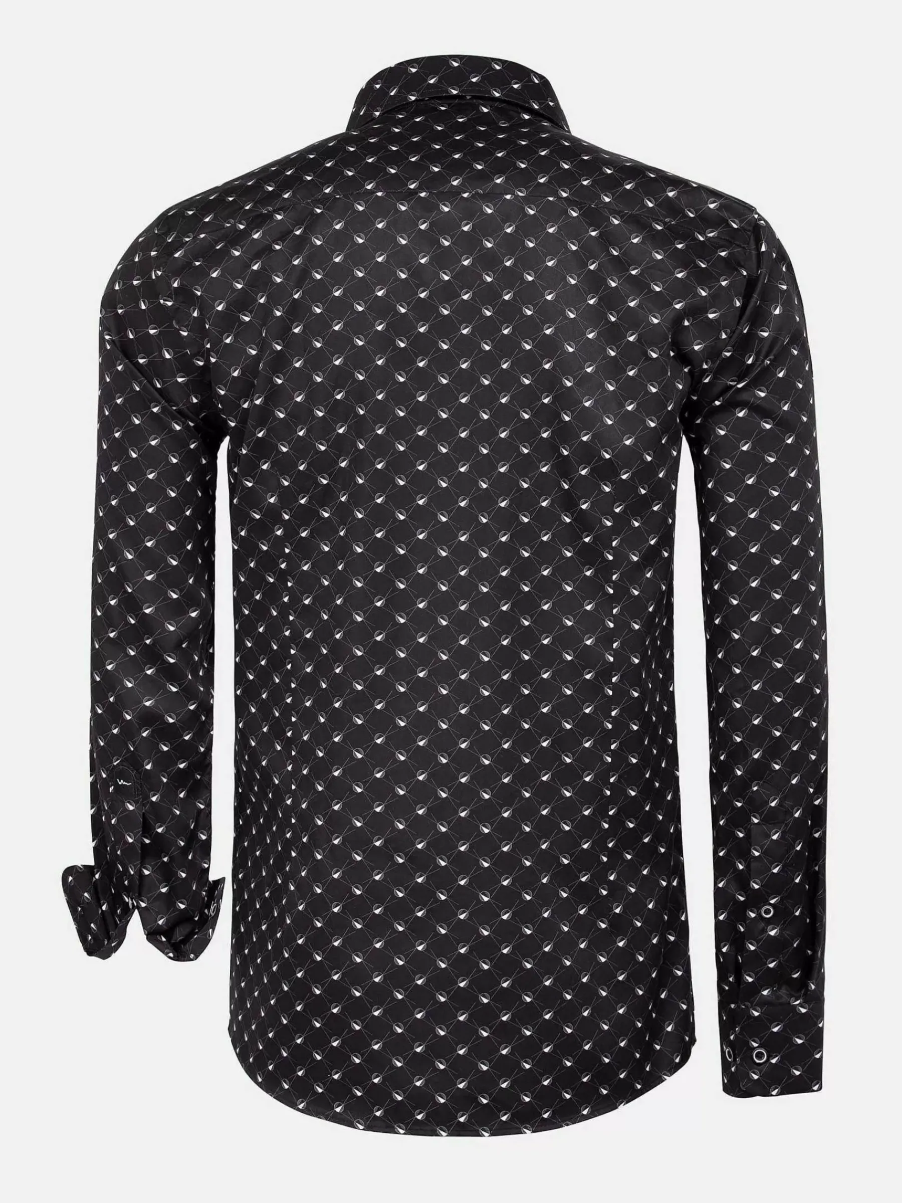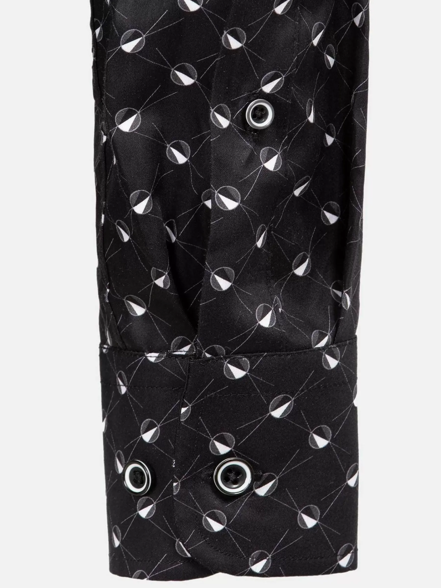 Zwart Overhemd Met Witte Stippenpatroon. Dit Model Heeft Lange Mouwen, Een Knoopsluiting En Mooie Ronde Knopen. De Manchetten Zijn Effen Zwart Gekleurd En Geven Een Mooie Uitstraling Wanneer Ze Worden Omgeslagen.