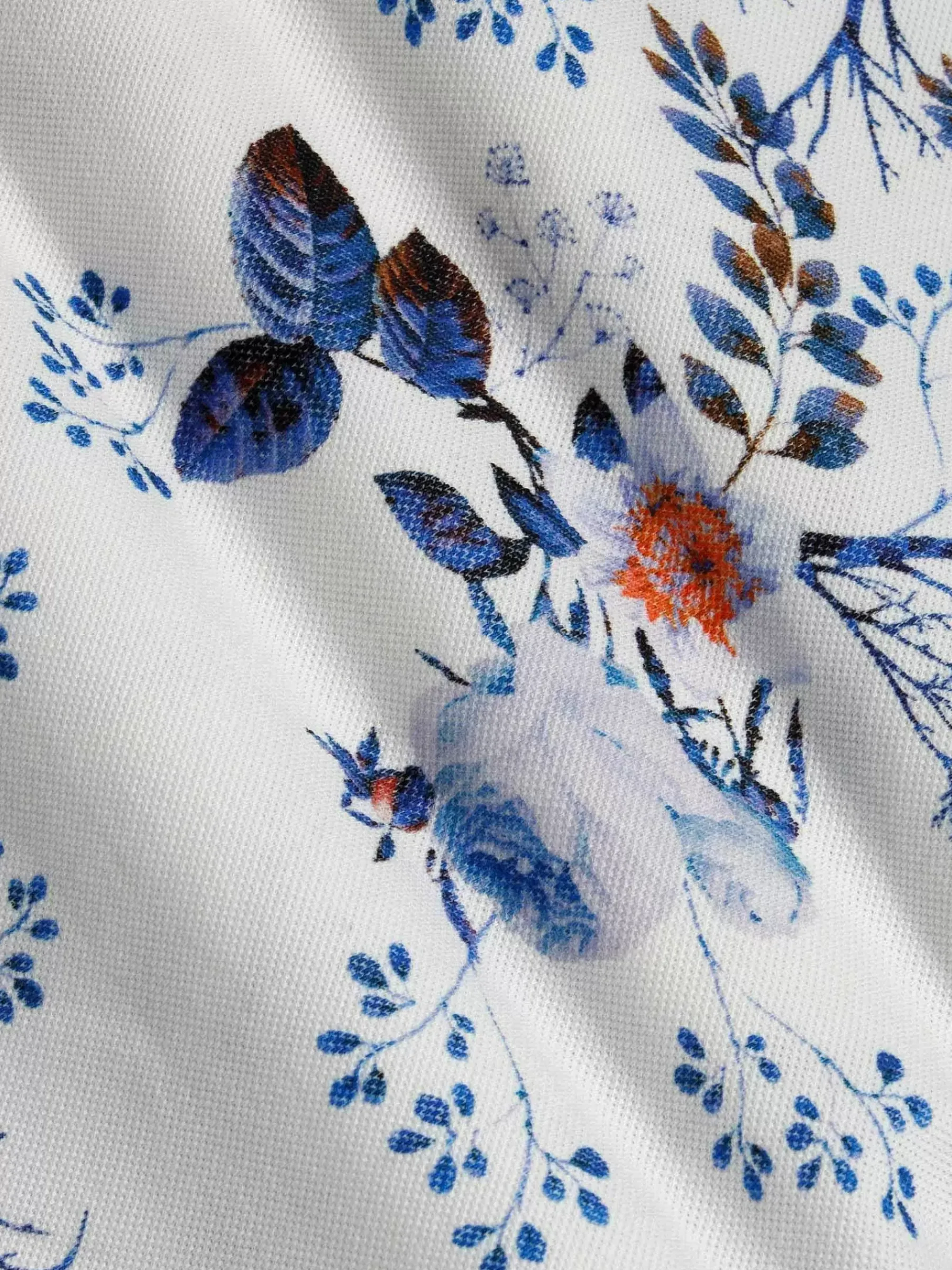 Bosco White Polo: Een Mix Van Tijdloze Elegantie En Moderne Stijl. Met Een Klassieke Polo Hals, Ingewikkelde Bloemenprints Op Een Witte Achtergrond En Twee Chique Kleurencombinaties Biedt Hij Veelzijdigheid Voor Elke Gelegenheid. Met Geribde Boorden En Een Slim-Fit Ontwerp, Zorgt Het Voor Zowel Comfort Als Verfijning.