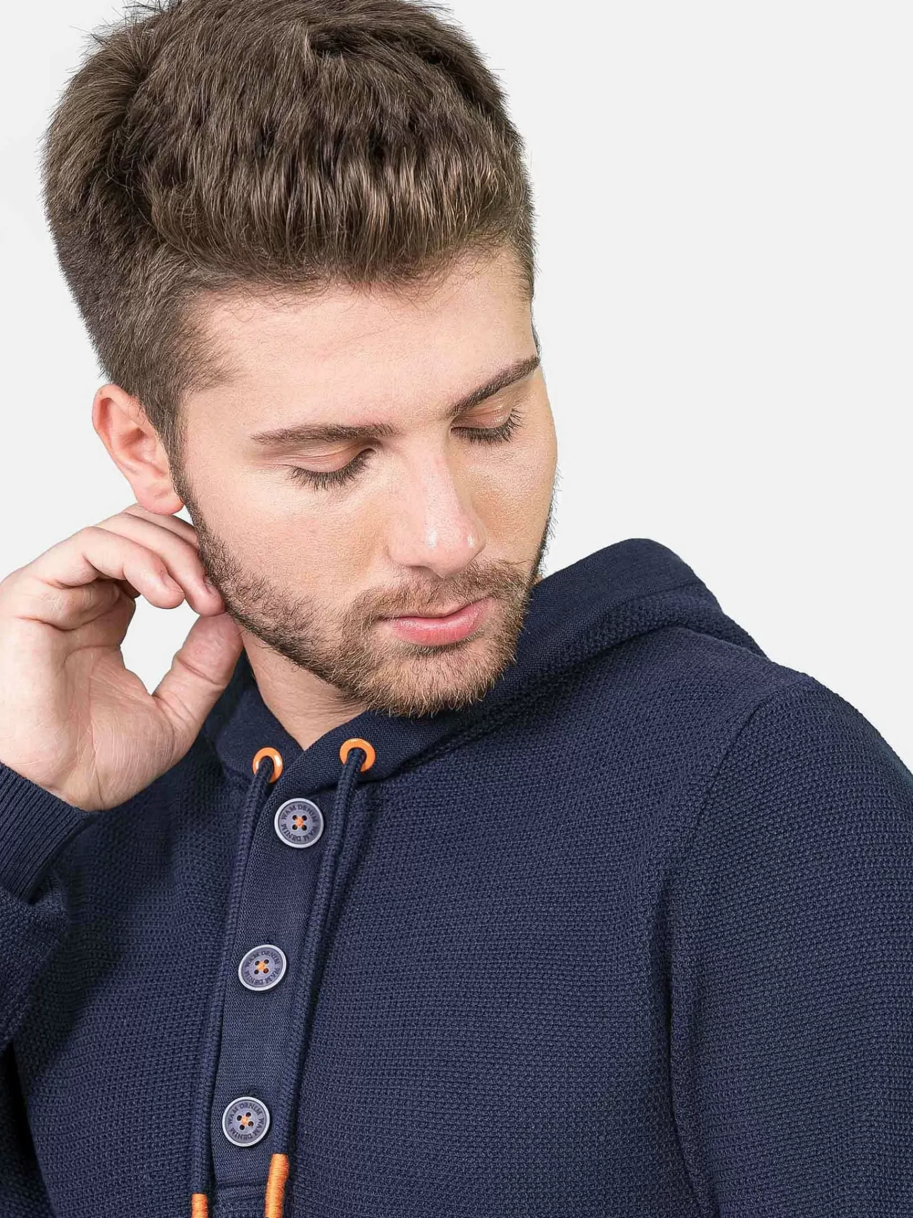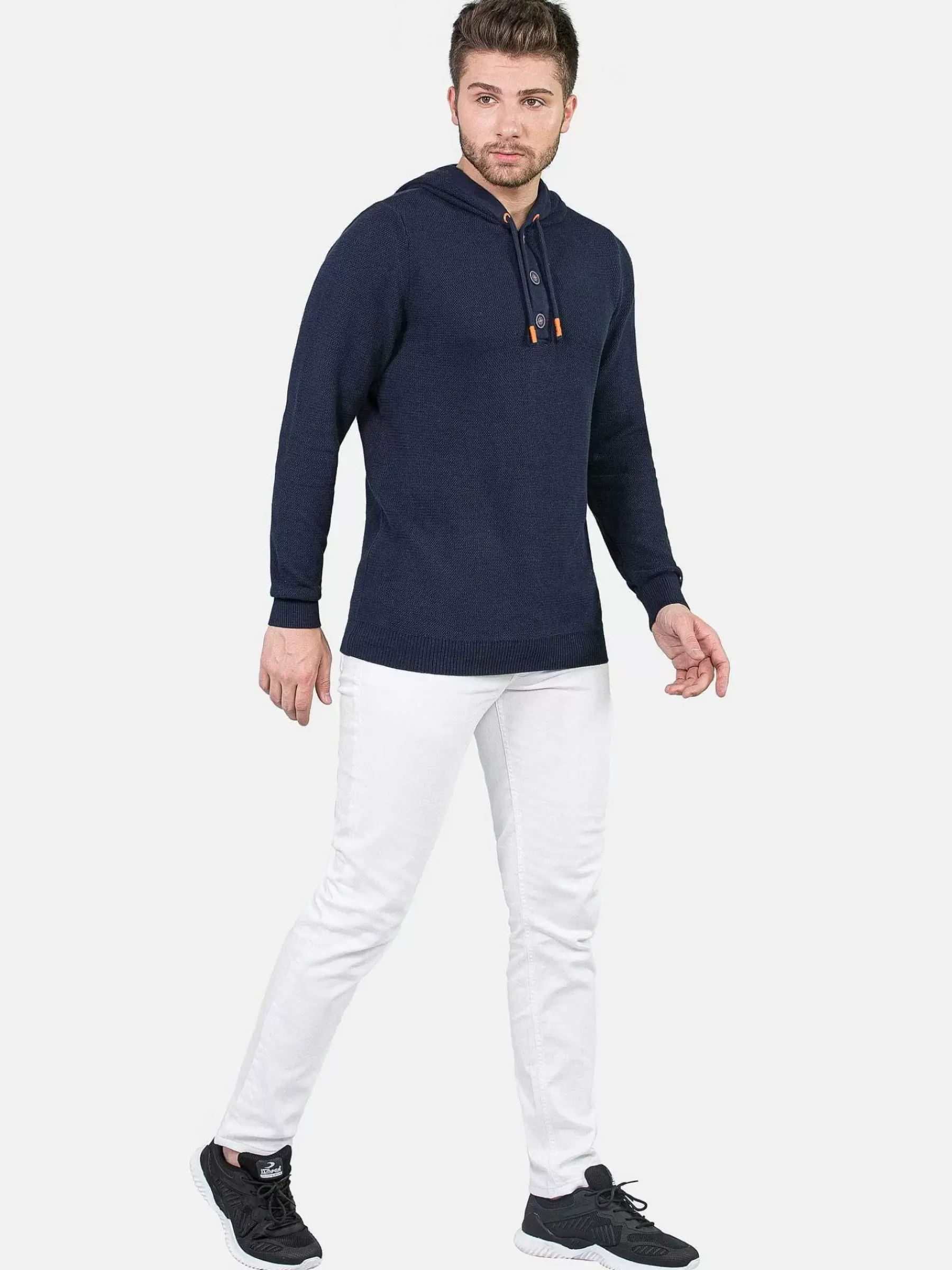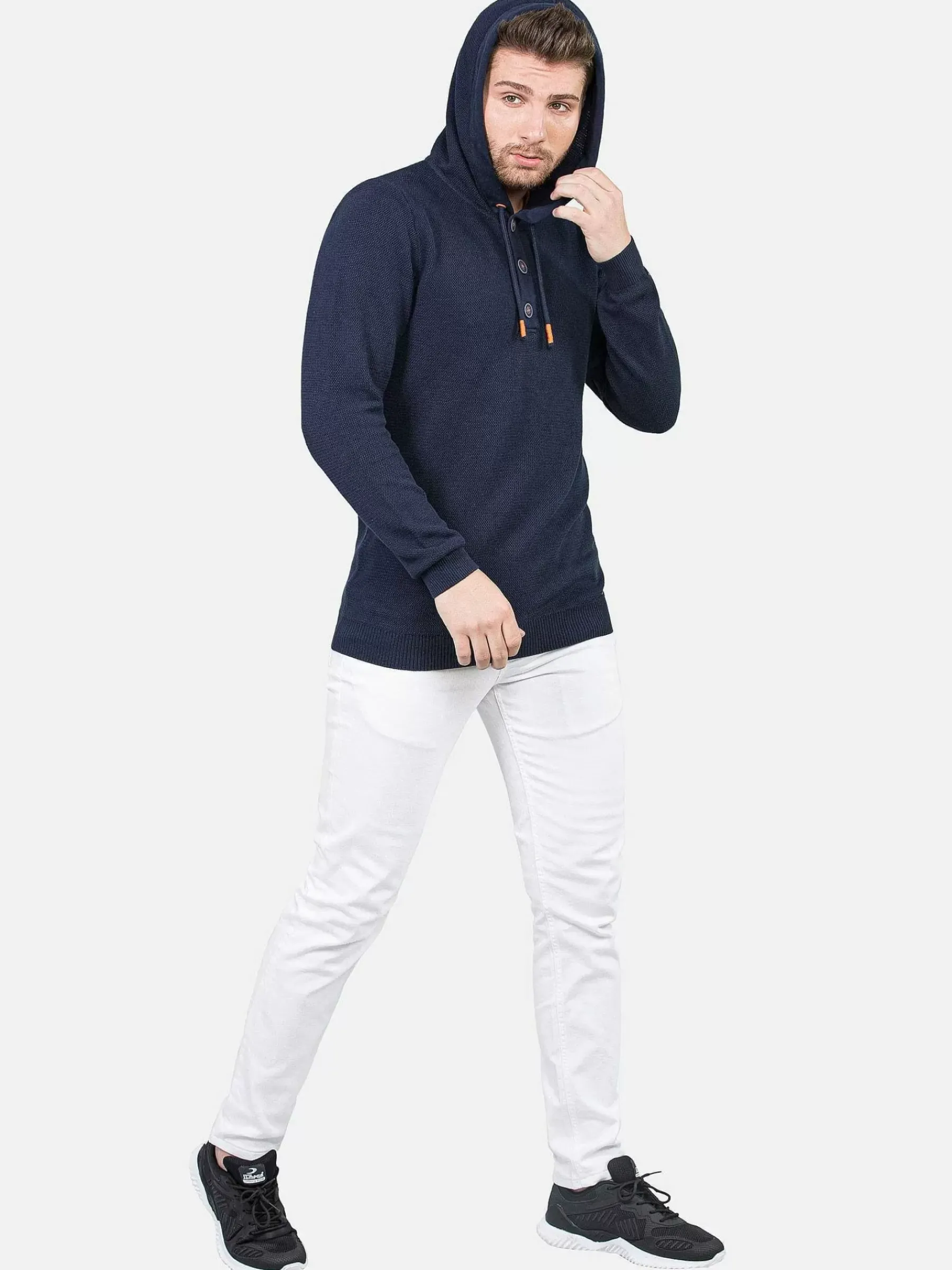 Navy Sweater Met Capuchon. In De Capuchon Zijn Koorden Verwerkt Met Een Oranje Veterstift. De Grote, Mooie Knopen Zijn Donkerblauw Met Een Witte Omlijning En Oranje Stiksels. Op De Linkermouw Zit Een Klein Embleem.