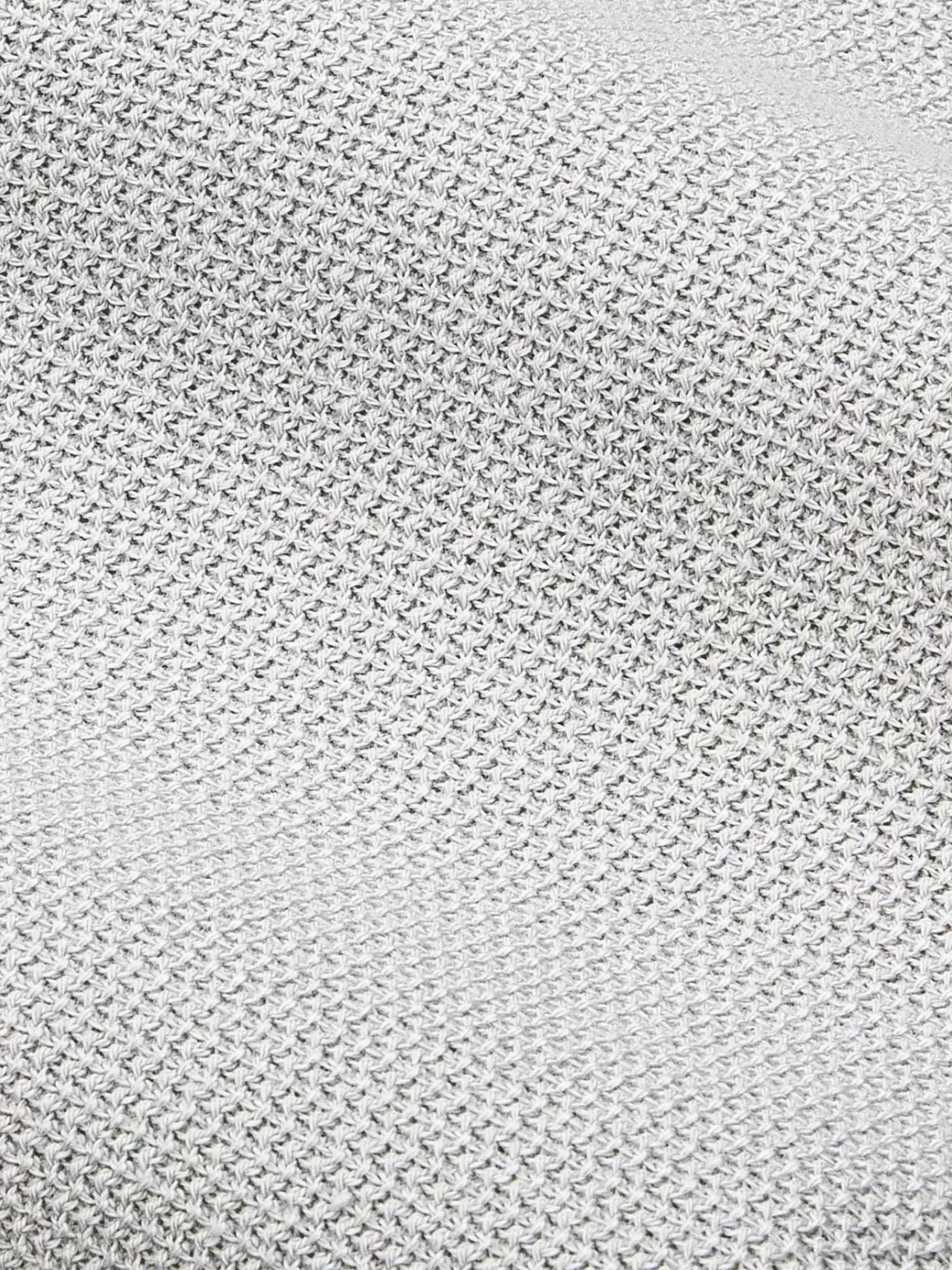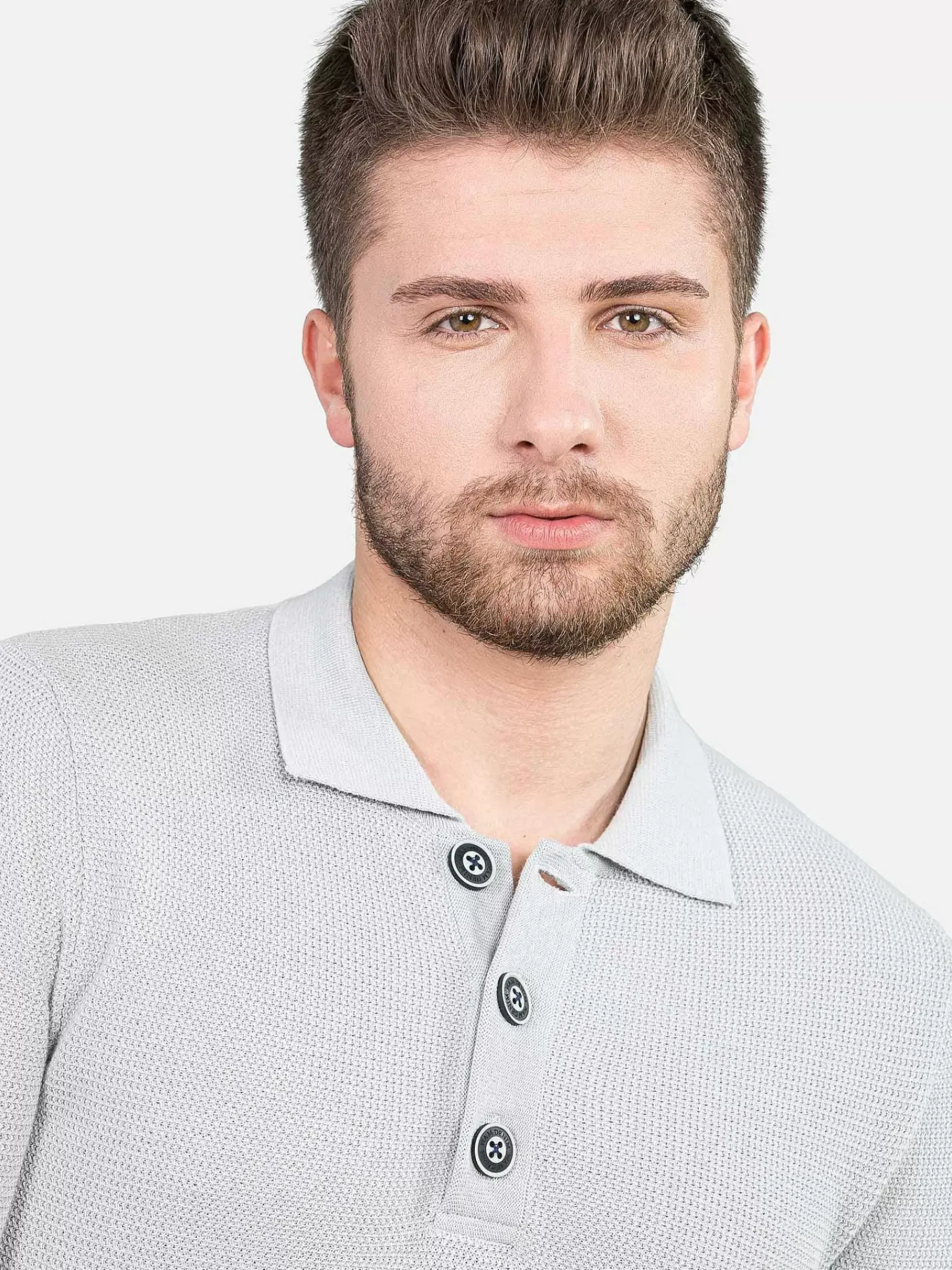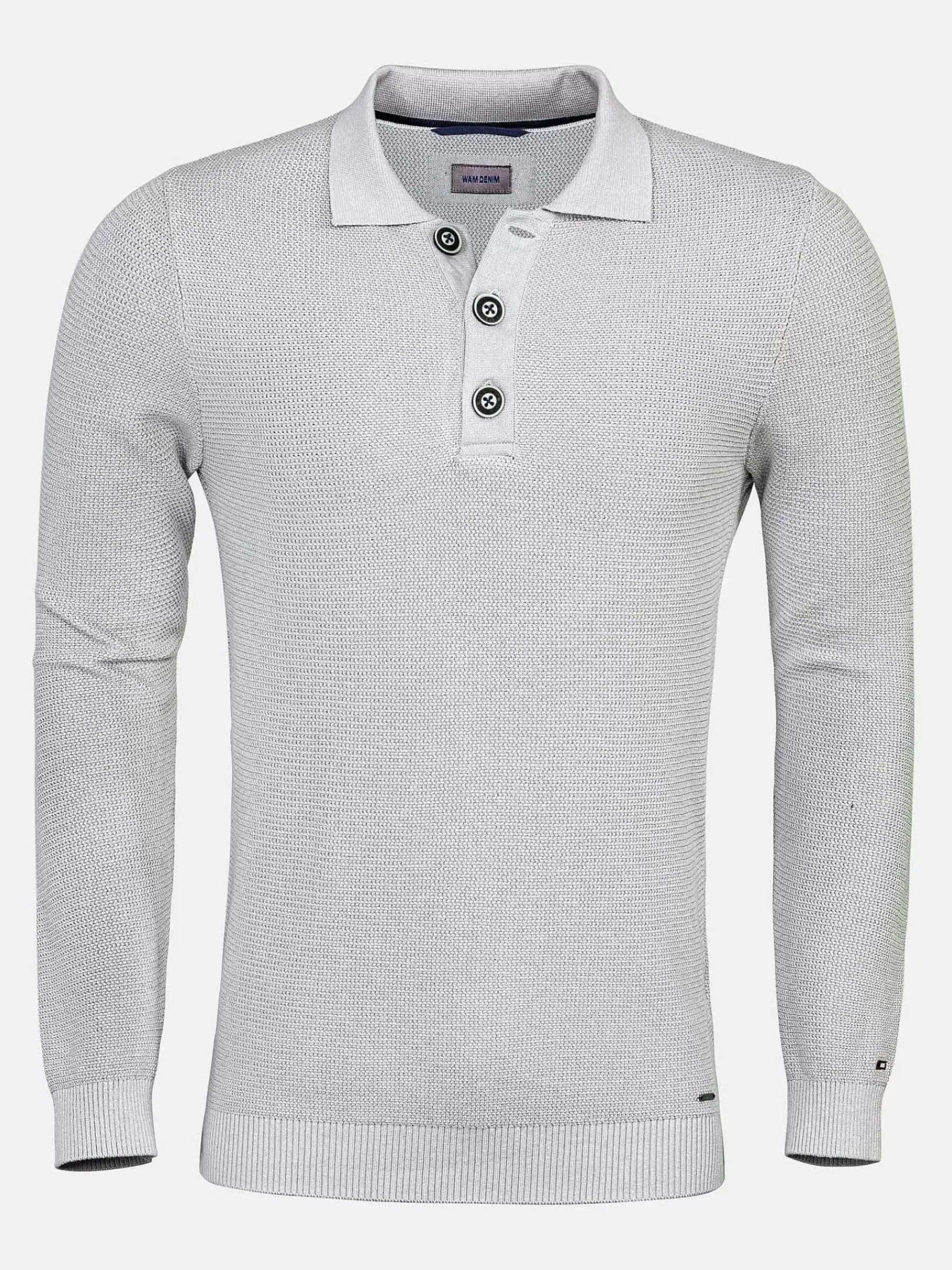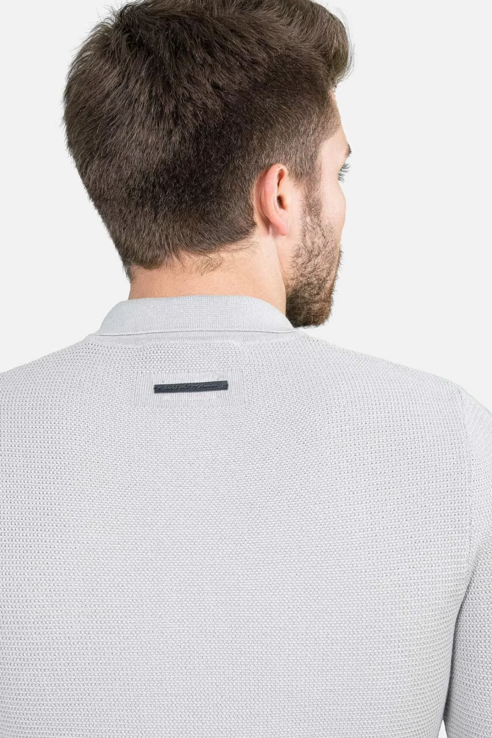 Grijze Sweater Met Geribde Mouwen. Dit Model Heeft Een Knoopsluiting Met Zwarte Stiksels. Op De Linkermouw Zit Een Klein Embleem Gestikt. Door De Neutrale Kleur Is Deze Sweater Met Praktisch Alles Te Combineren.