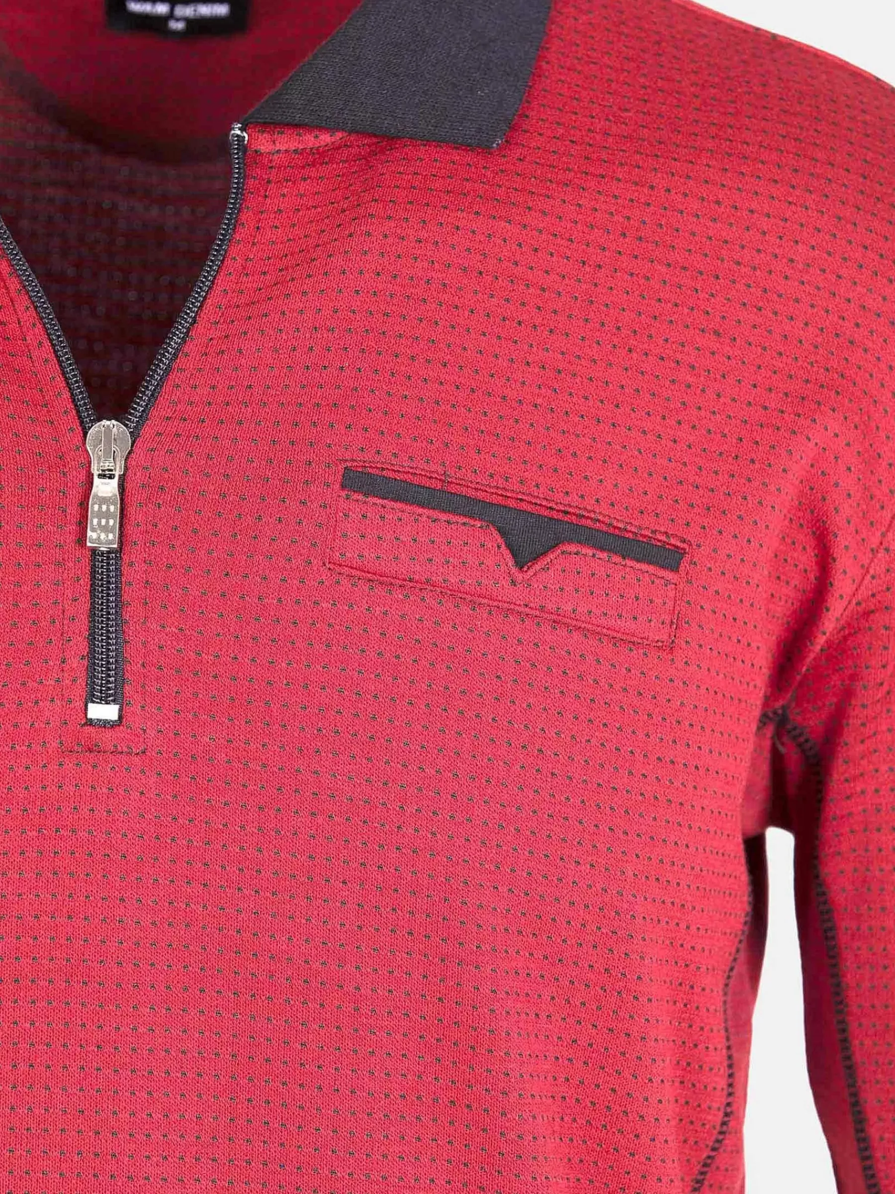 Rode Sweater Met Zwarte Kraag. Dit Model Heeft Een Heel Fijn Zwart Stippen Patroon En Een Ritssluiting In De Hals. Deze Sweater Heeft Een Elastisch Boord Aan De Onderkant Voor Een Perfecte Pasvorm.
