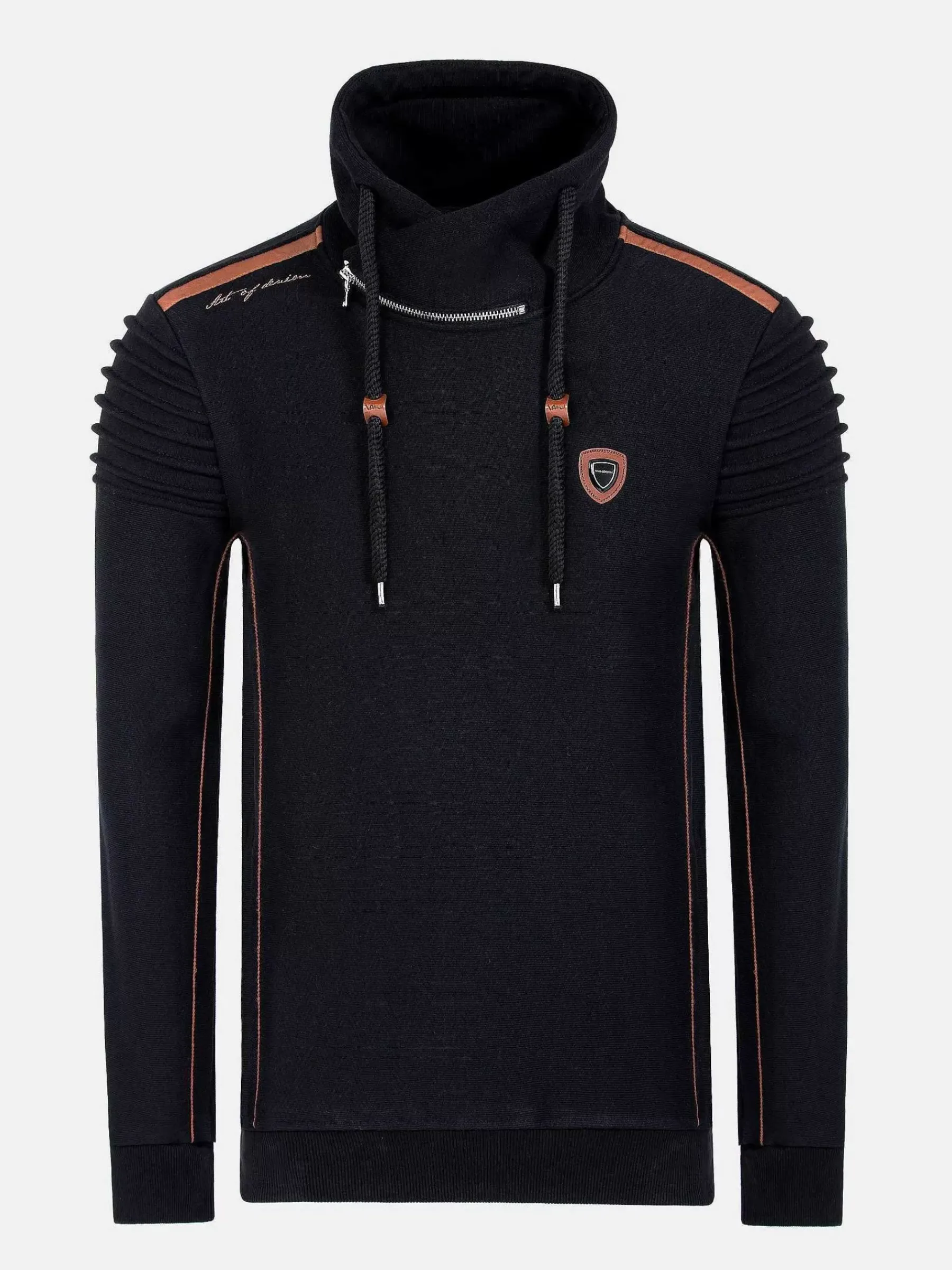 Zwarte Sweater Met Bruine Elementen, Een Opstaande Kraag, Trekkoord En Een Decoratieve Ritssluiting In De Hals. Op De Linkerborst Heeft Deze Sweater Een Merkembleem. De Elastische Zoom En Manchetten Sluiten Perfect. Een Modieuze, Warme Sweater Voor De Koude Dagen.