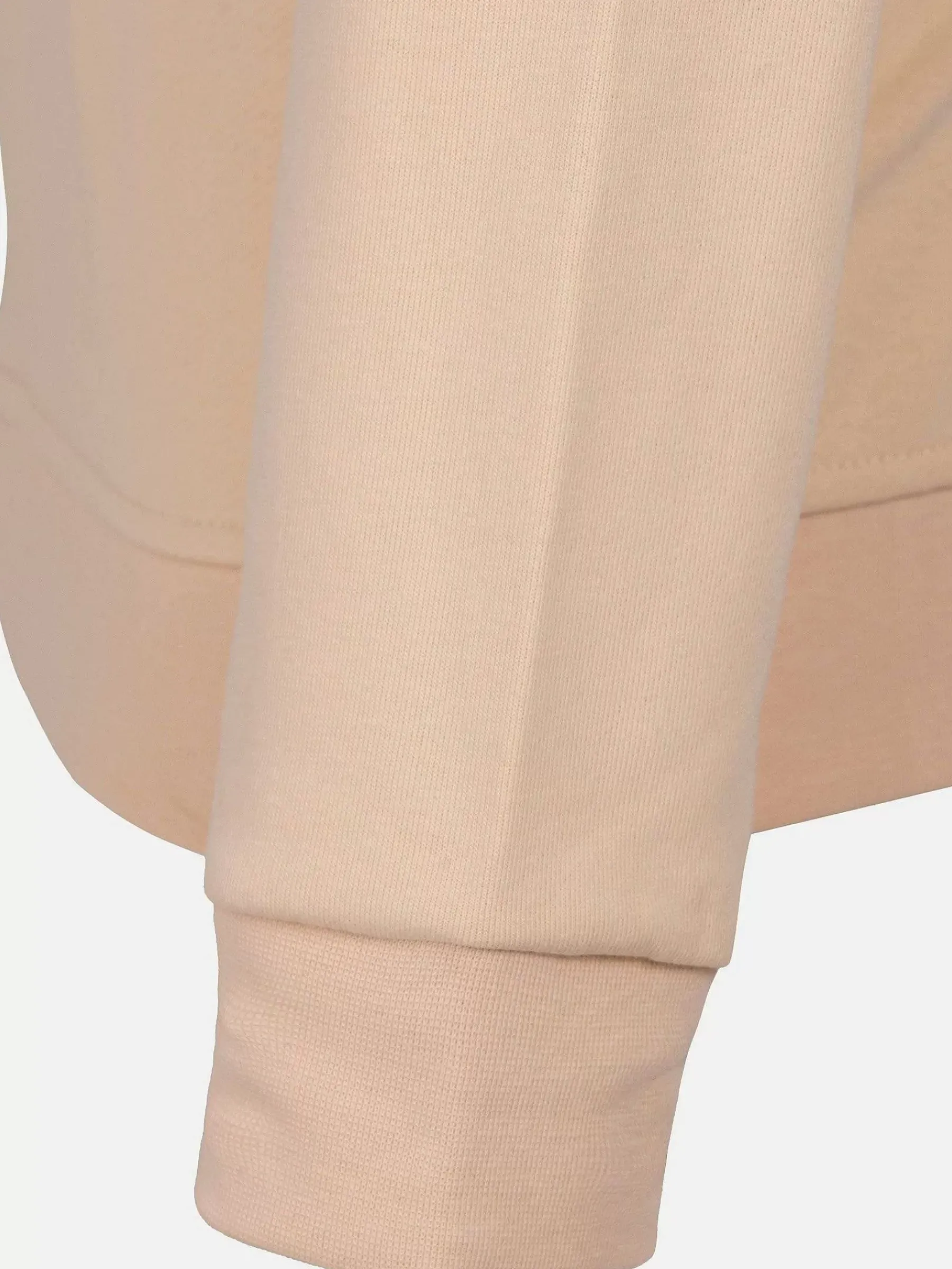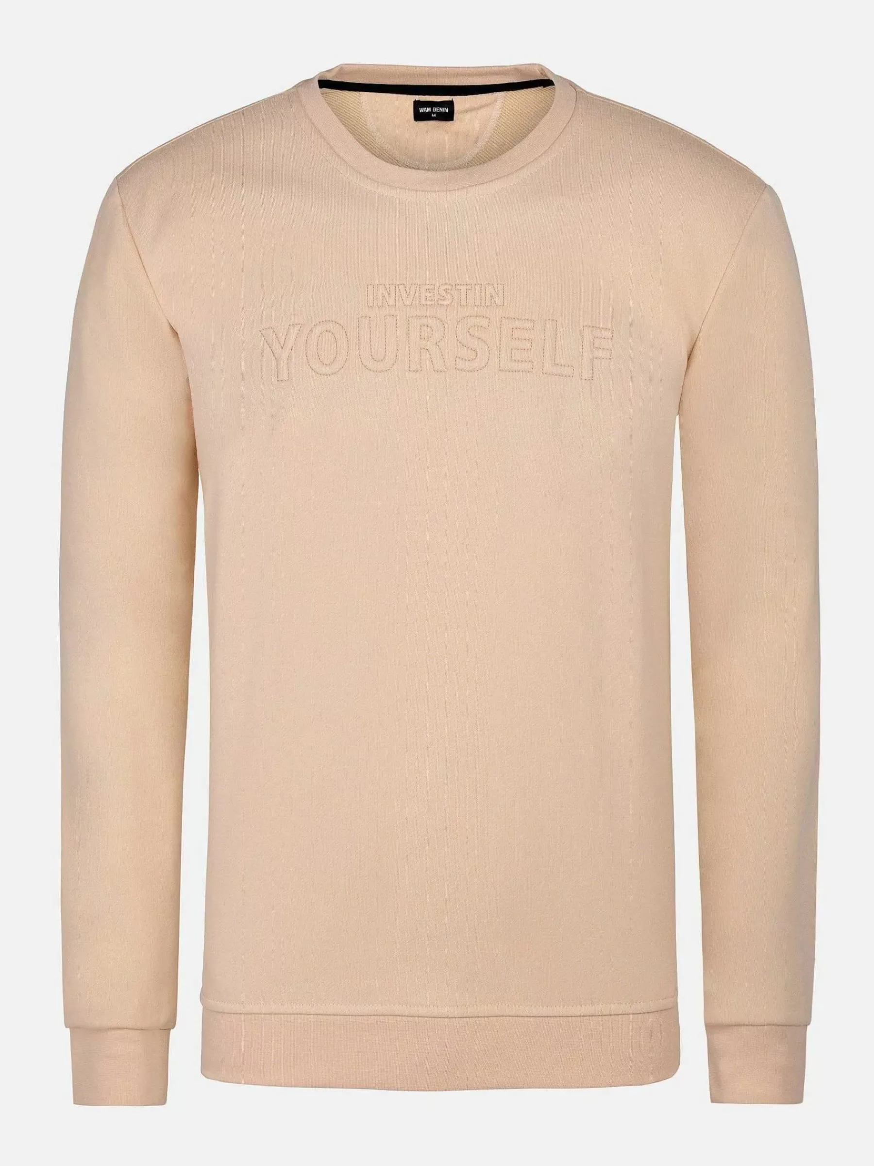 Beige Trui Met Ronde Hals. De Sweater Heeft Een Perfecte Pasvorm En Op Borsthoogte Een Tekst Print.