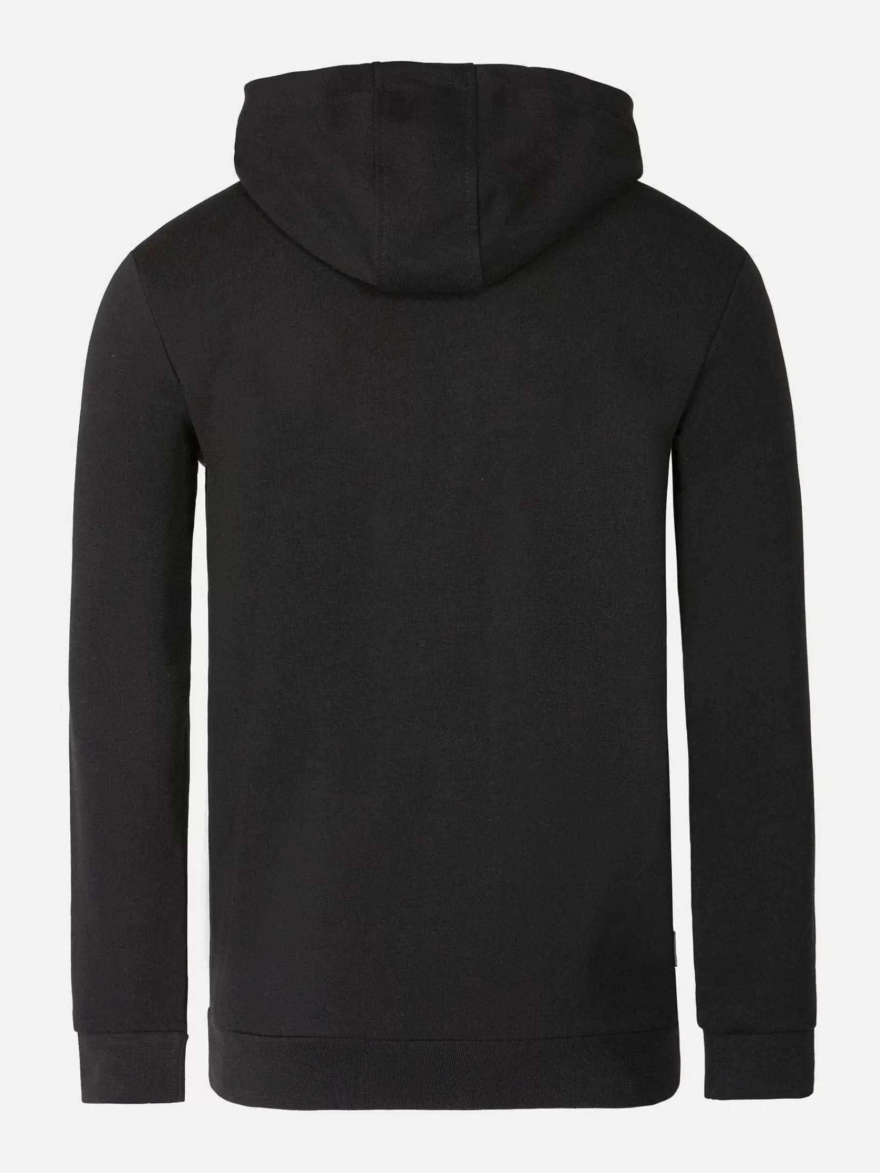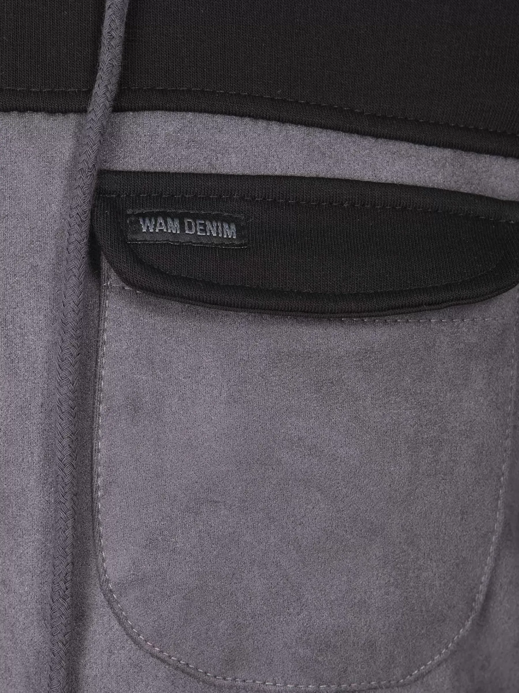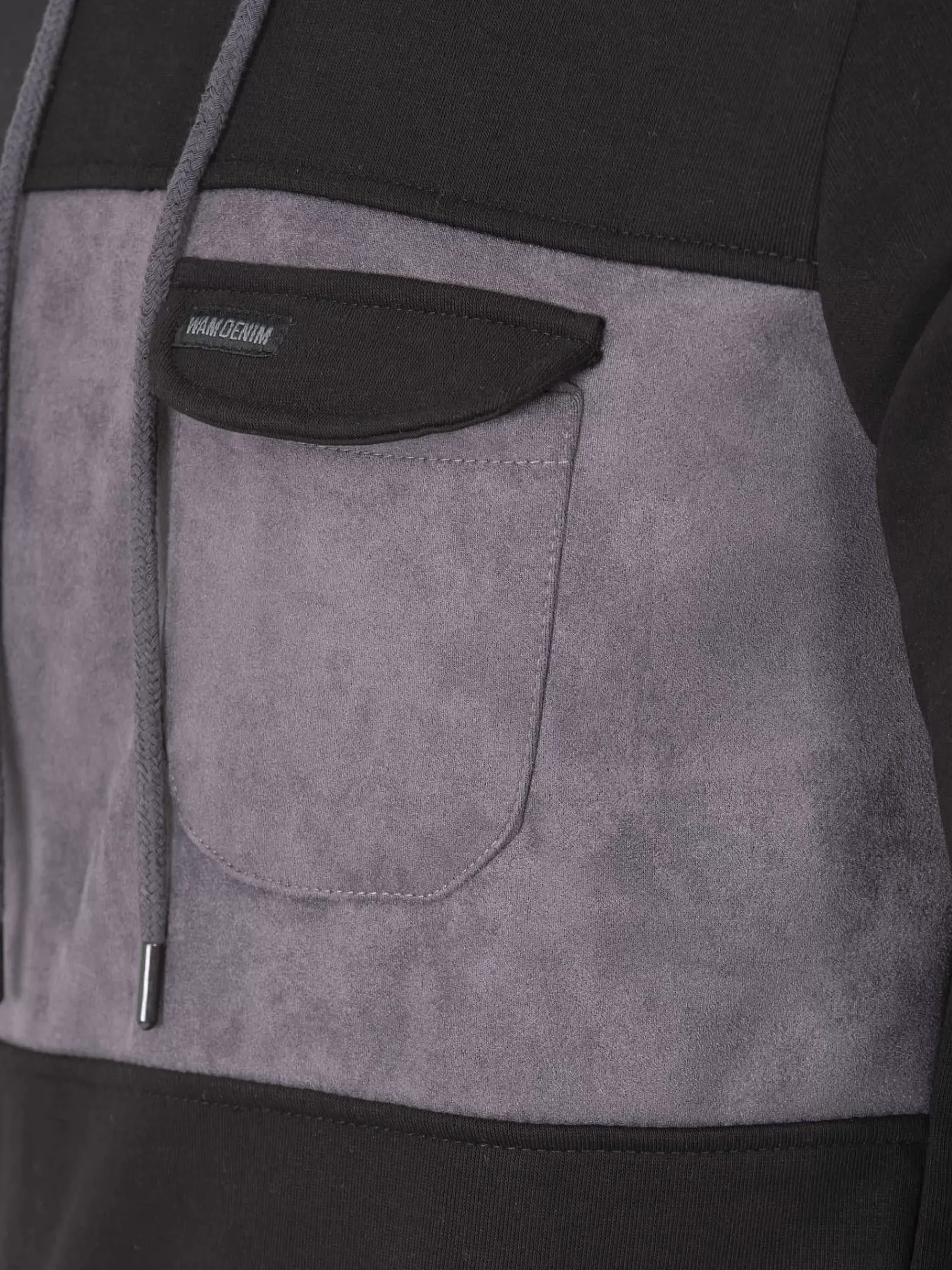 Zwarte Hoodie Met Groot Grijs Vlak Aan De Voorzijde. Op De Linkerborst Zit Een Zak Met Daarop Een Label Van Wam Denim Bevestigd. Deze Stoere Sweater Past Heel Goed Op Een Jeans Met Sneakers.