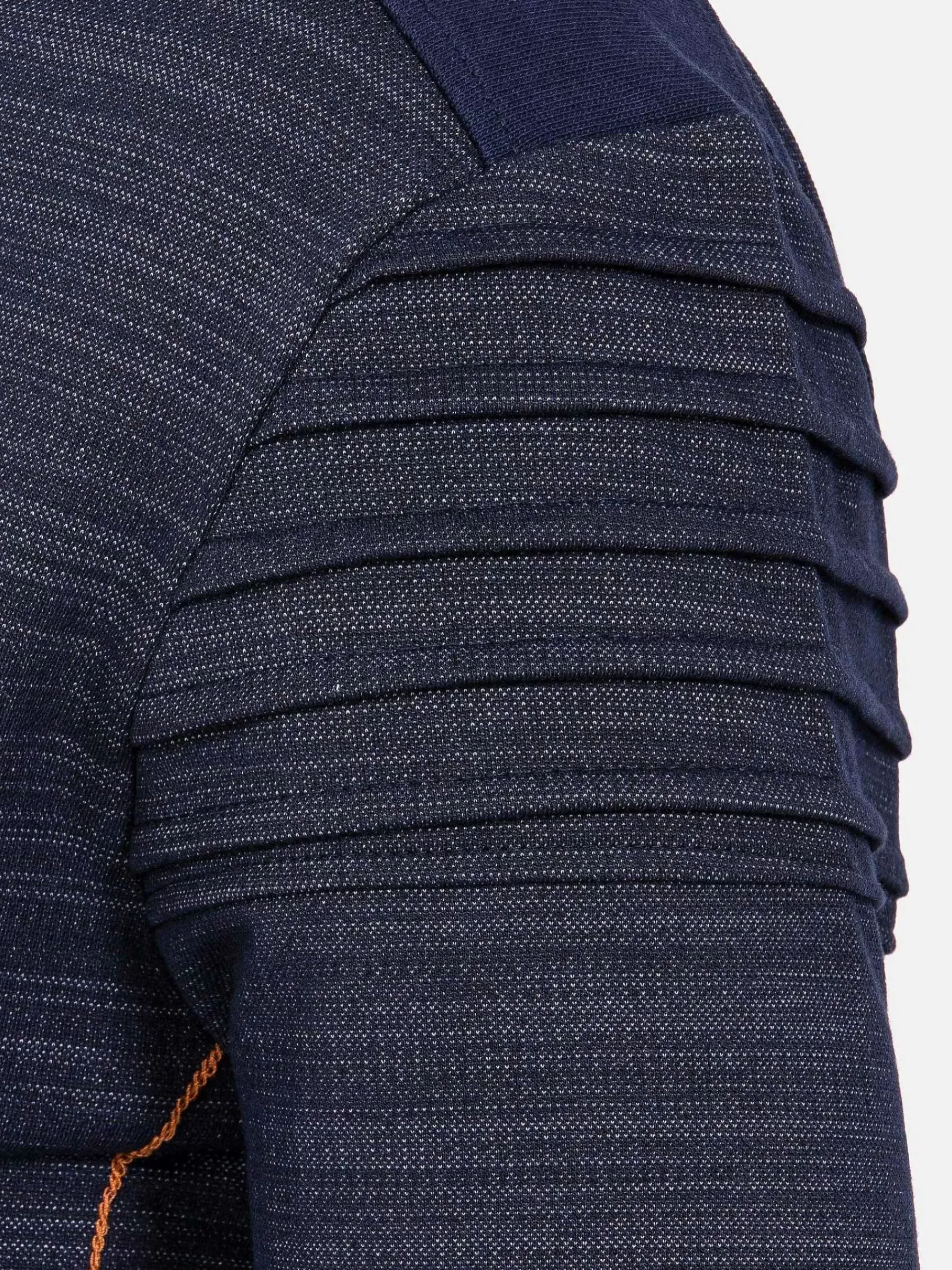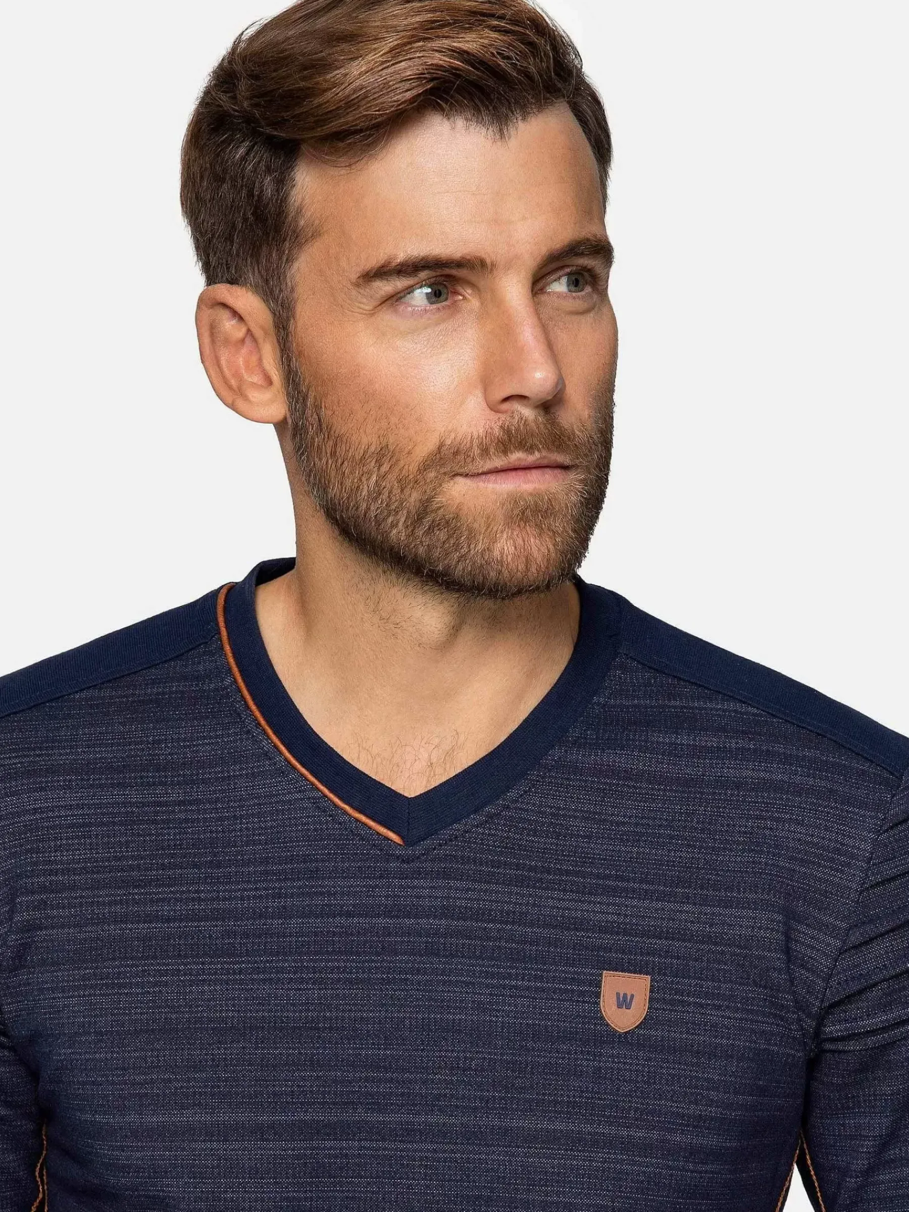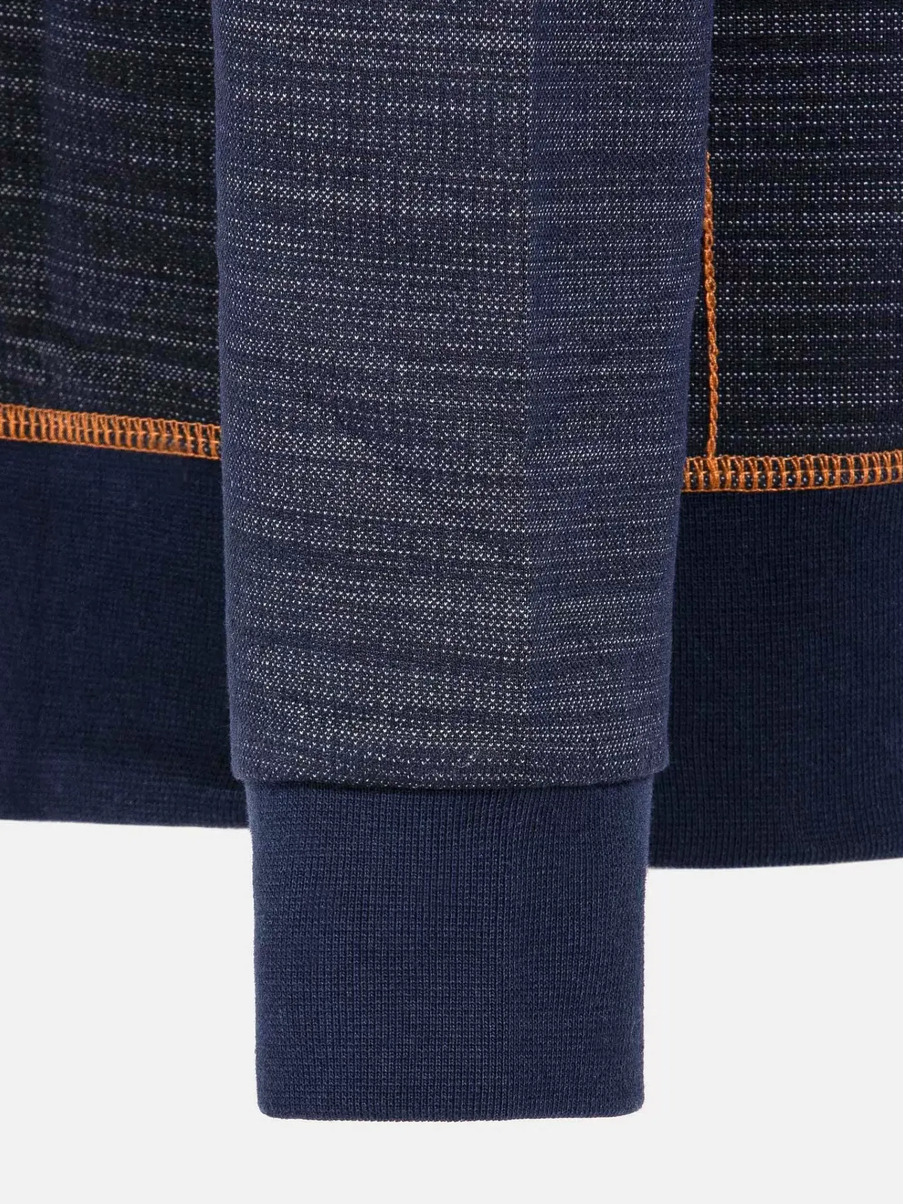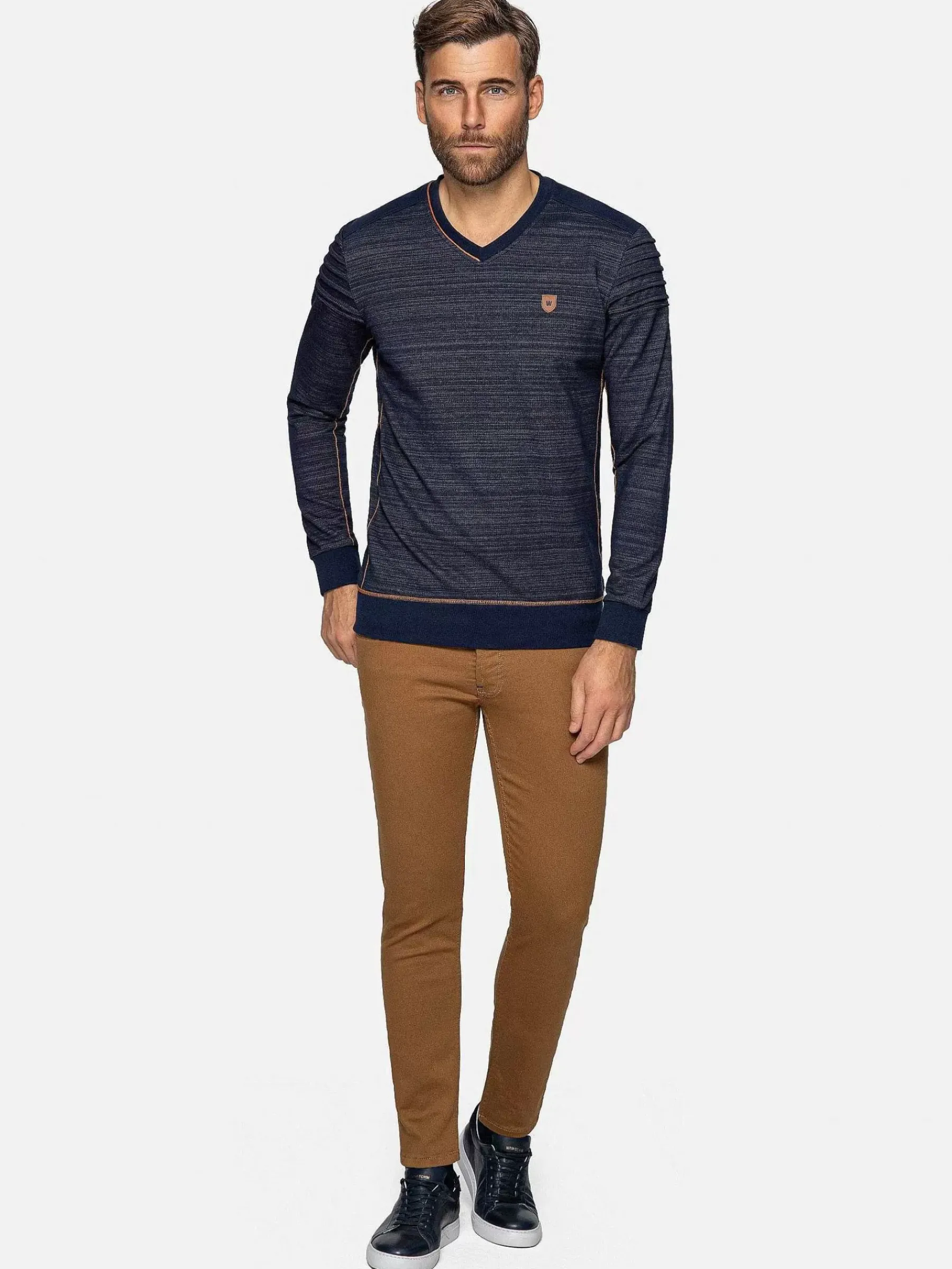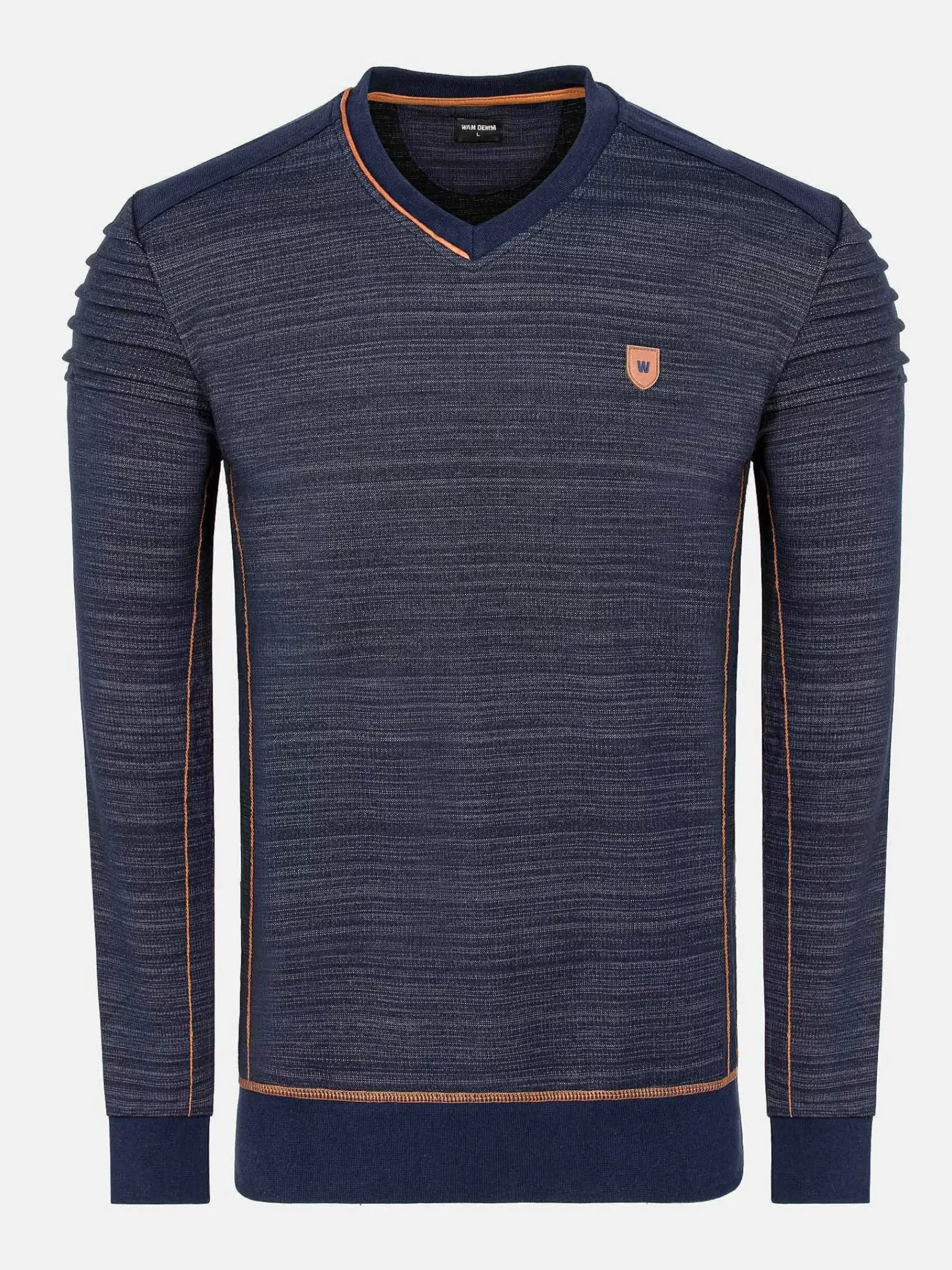 Navy Kleurige V-Hals Trui, Gemaakt Van Het Beste Katoen En Polyester Voor Comfort. Dit Model Heeft Elastiek In De Manchetten En Zoom En Is Afgewerkt Met Oranje Stiksels Rondom De Arm Voor Een Prachtig Effect. Is Makkelijk Te Combineren Voor Verschillende Outfits.