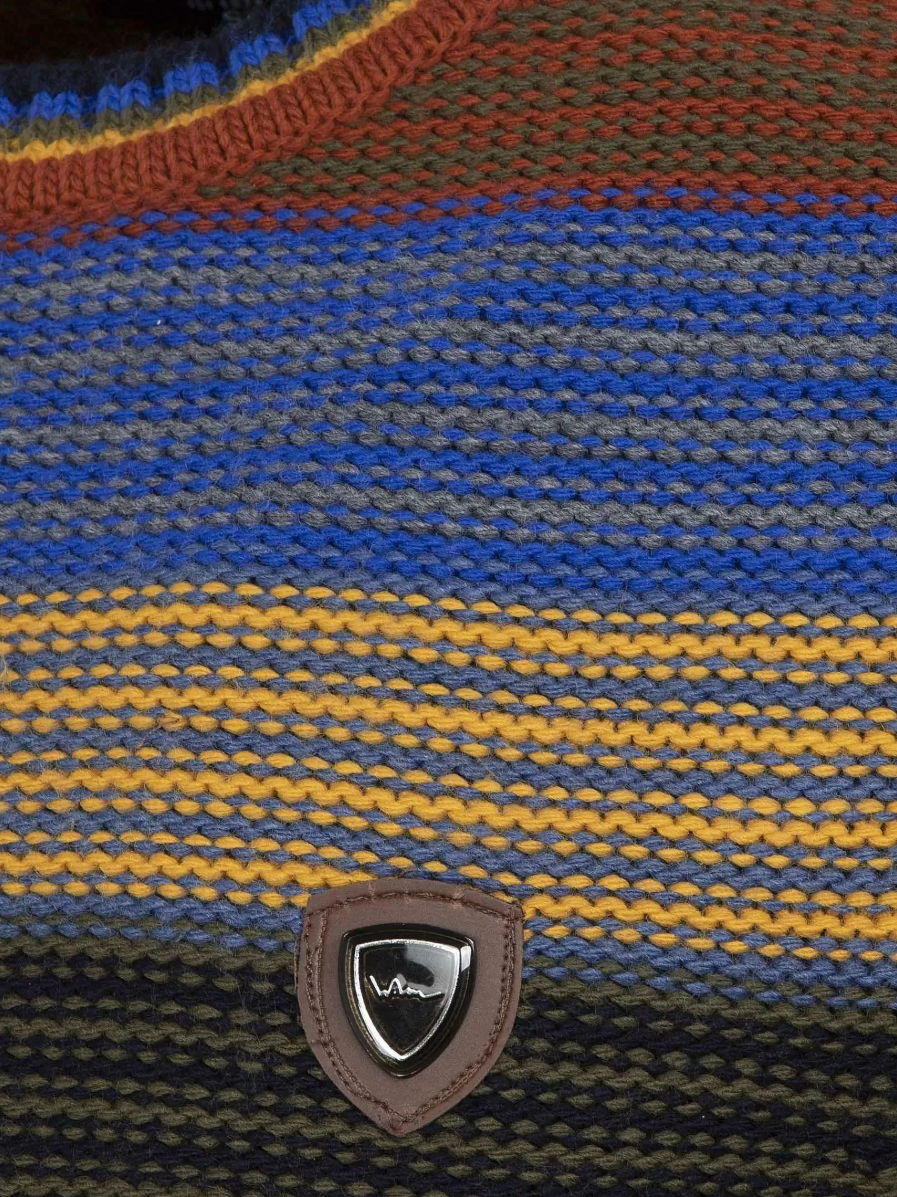 Warme, Meerkleurige Trui Met Ronde Hals. De Trui Voelt Heel Zacht Aan. Links Op De Borst Is Een Subtiel Embleem Bevestigd.