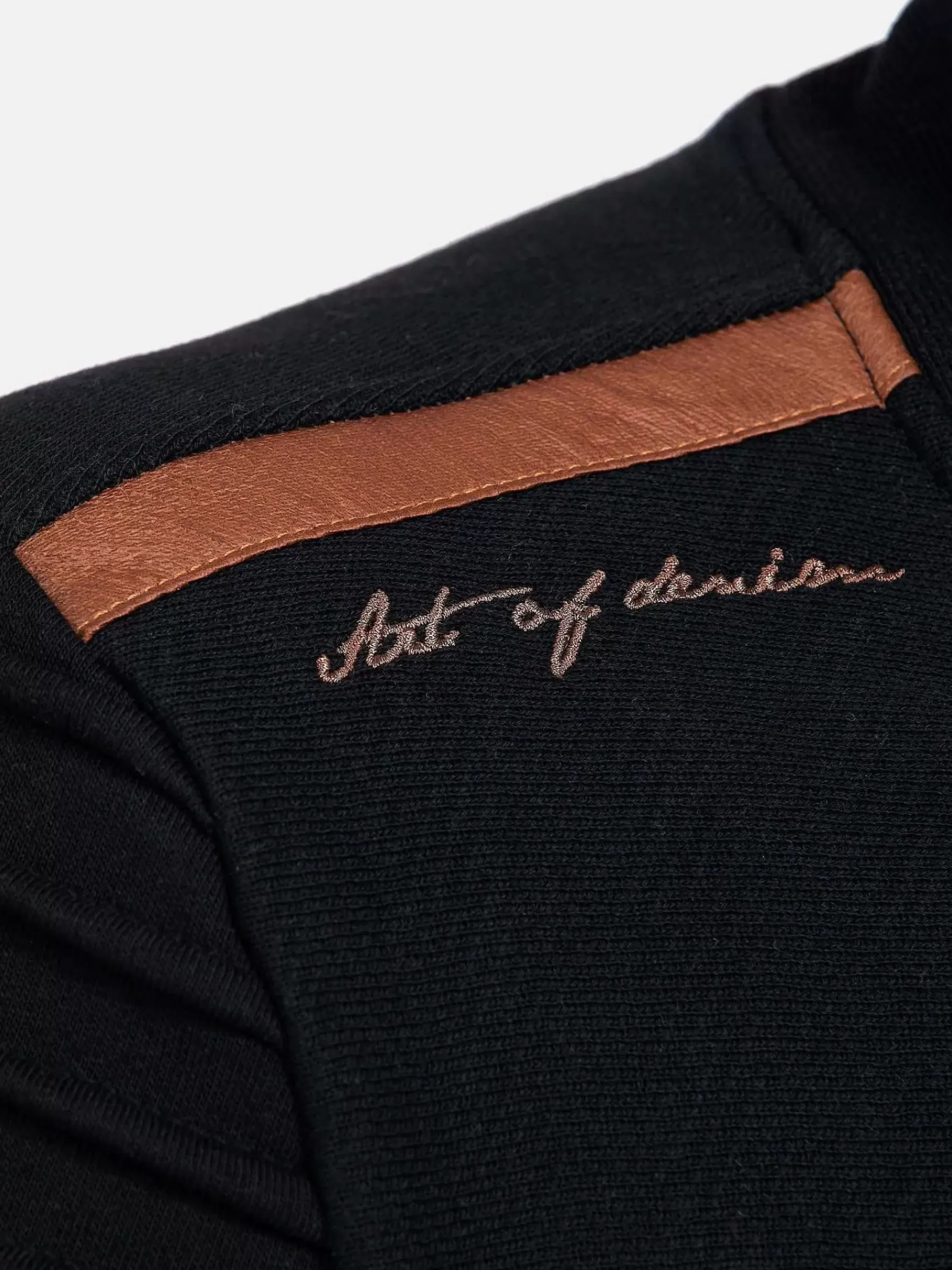 Zwarte Sweater Met Bruine Elementen, Een Opstaande Kraag, Trekkoord En Een Decoratieve Ritssluiting In De Hals. Op De Linkerborst Heeft Deze Sweater Een Merkembleem. De Elastische Zoom En Manchetten Sluiten Perfect. Een Modieuze, Warme Sweater Voor De Koude Dagen.