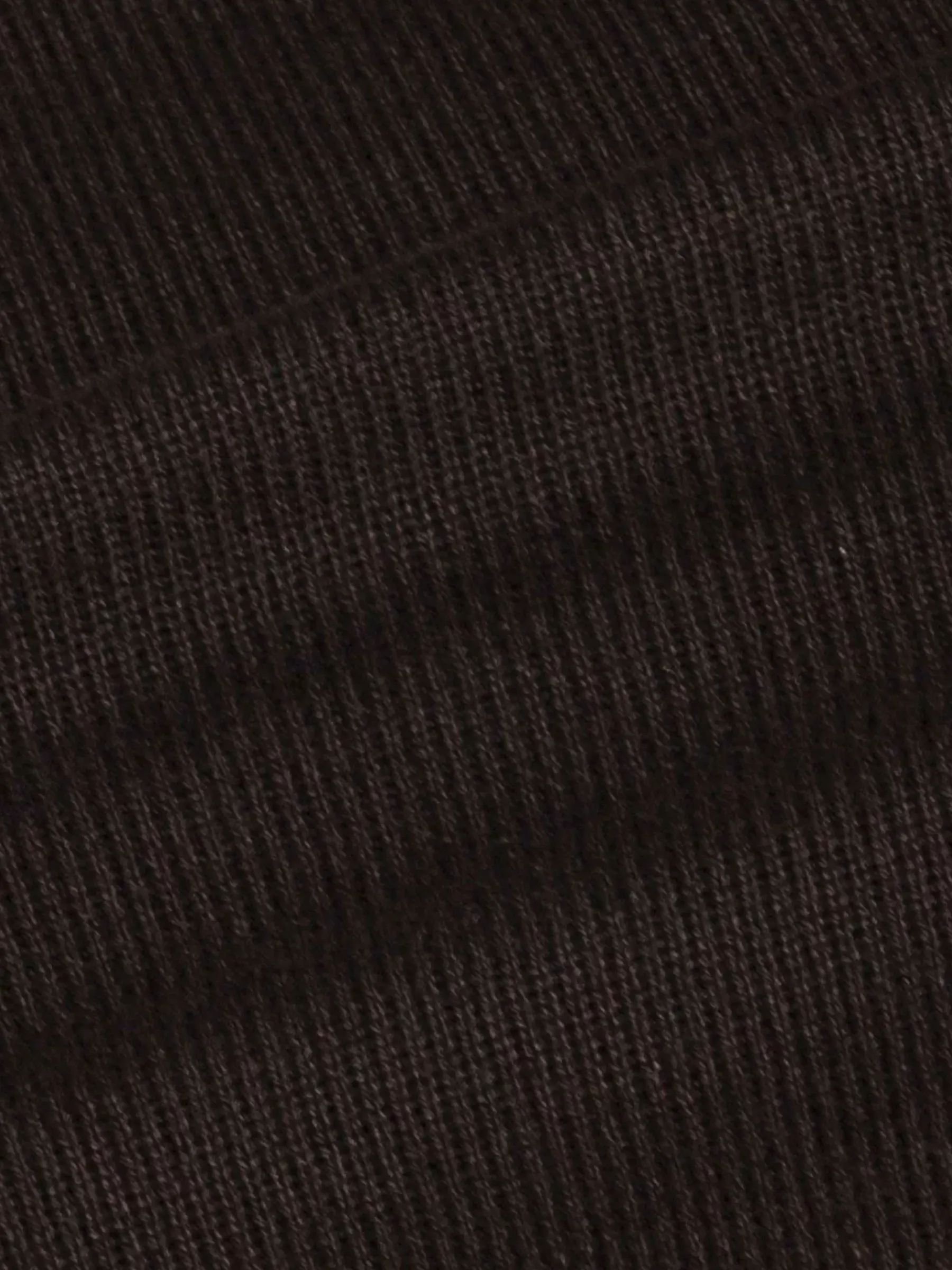 Donkerbruine Trui Met Hoge Kraag En Afgewerkt Met Fijn Streepmotief.