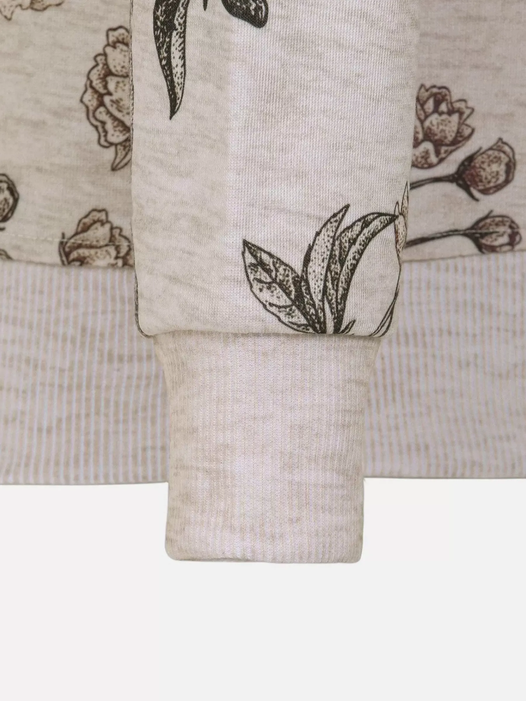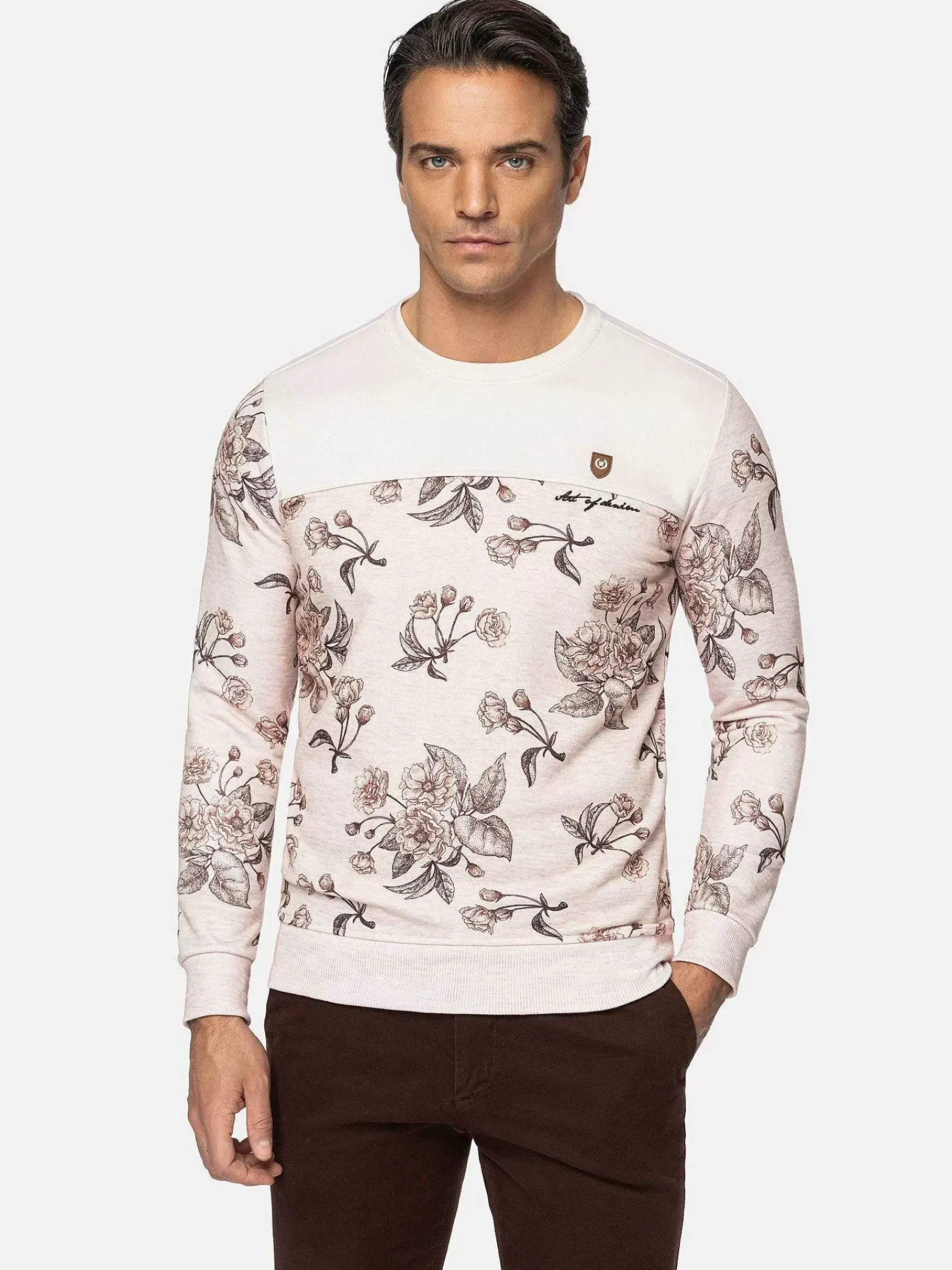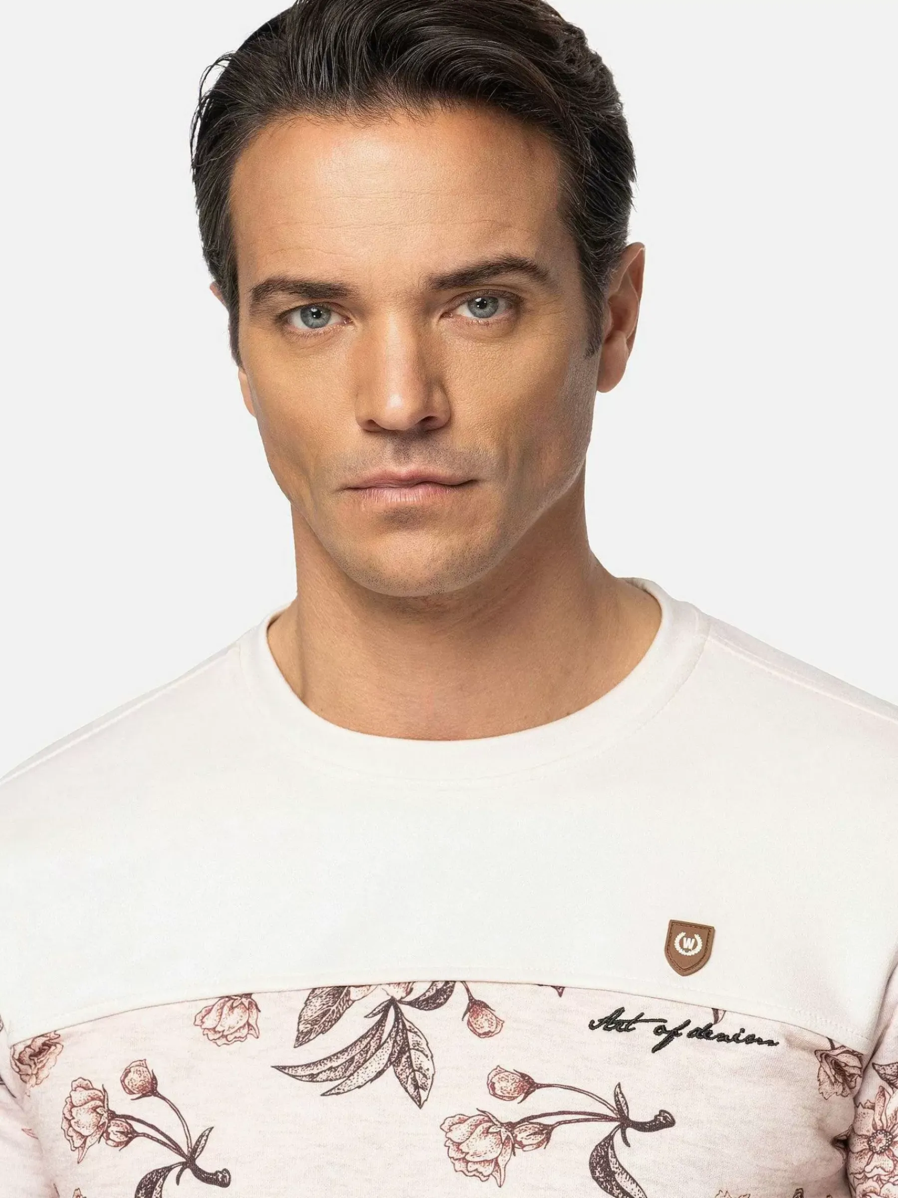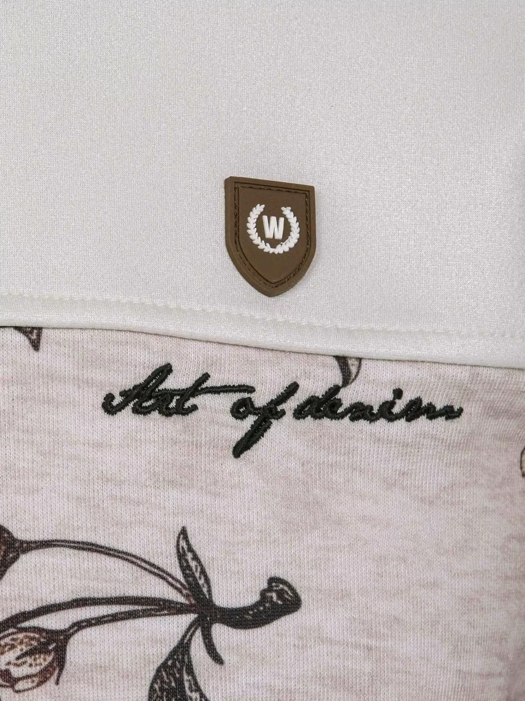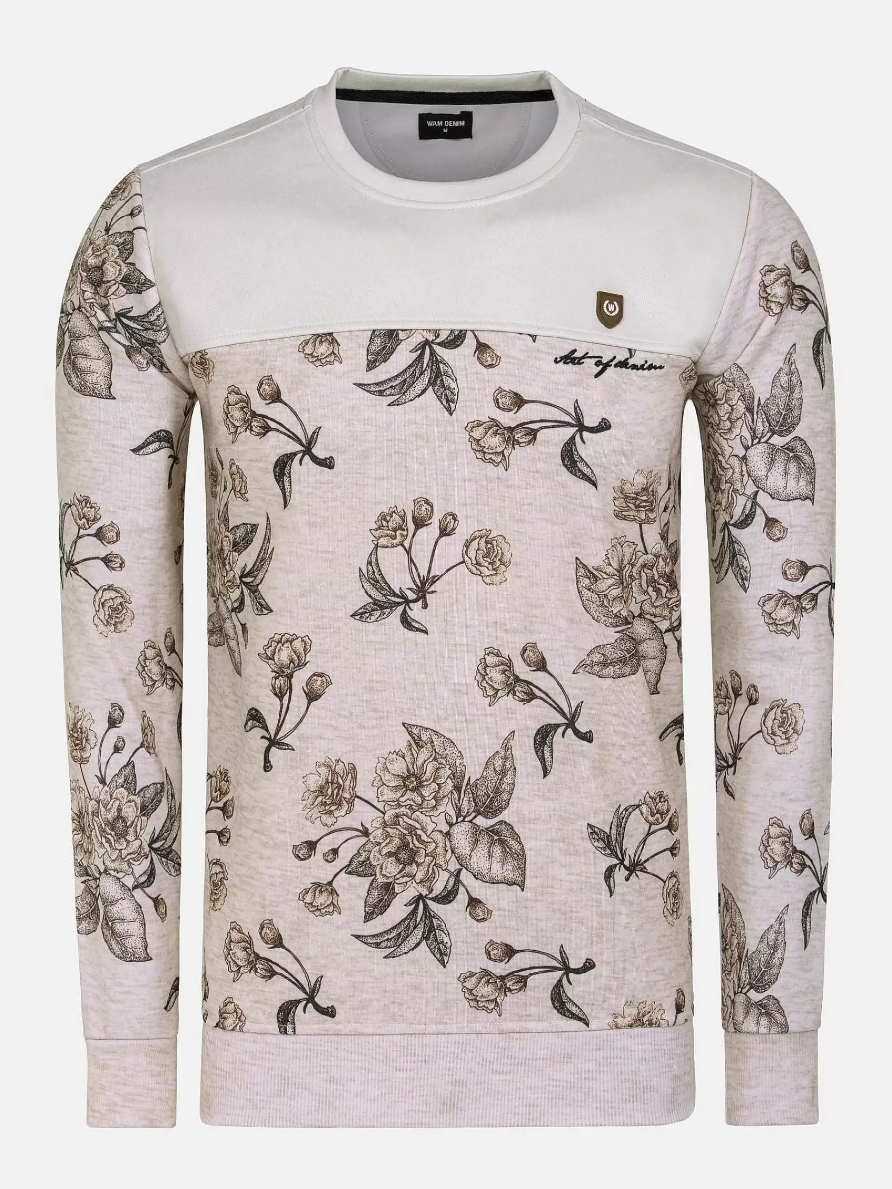 Een Originele Sweater In Het Beige. Het Bovenstuk Van De Sweater Is Effen In Een Witte Kleur En Daaronder Heeft Deze Sweater Een Prachtig Design Van Bloemen. Op De Linkerborst Is Een Klein Embleem Bevestigd. Zowel Te Dragen Met En Chino Als Een Jeans.