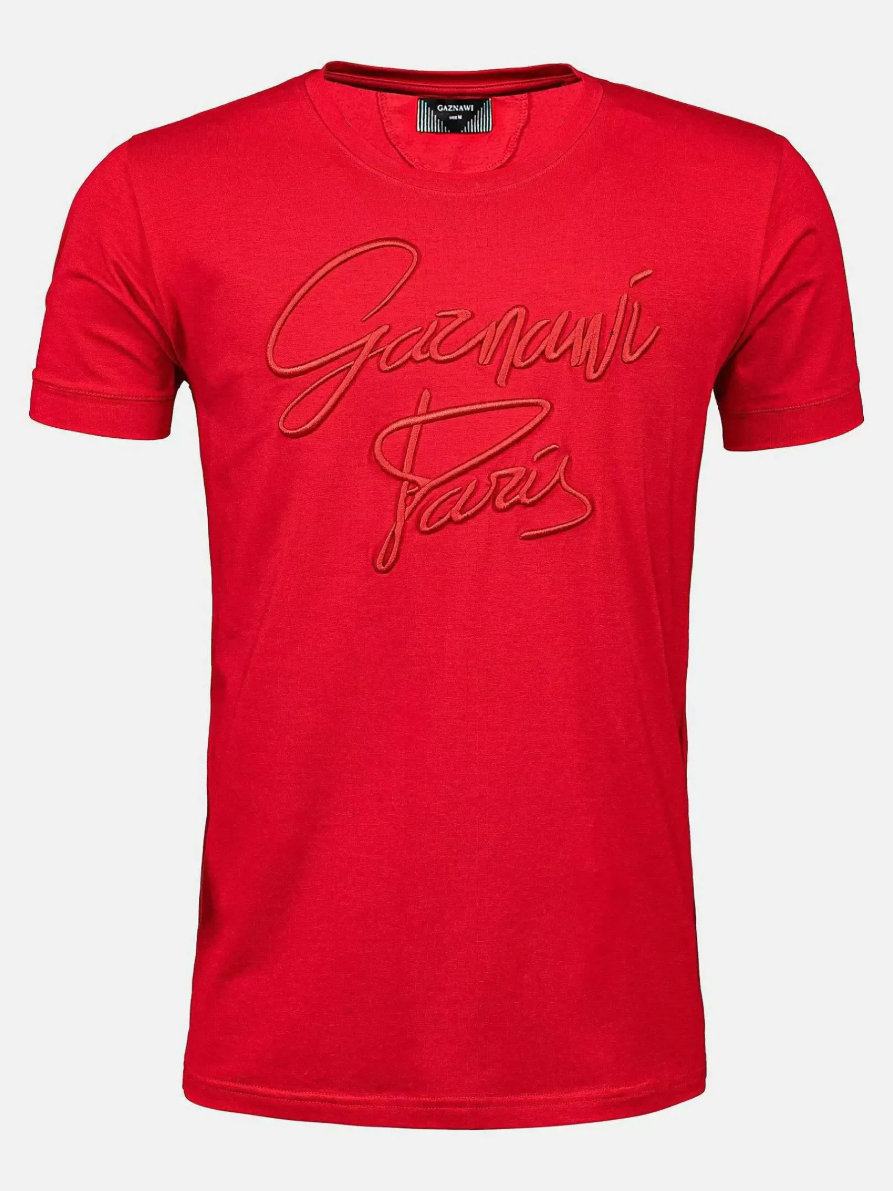 Rood T-Shirt Met Ronde Hals. Op De Voorzijde Een Grote Print Met De Tekst Gaznawi Paris.