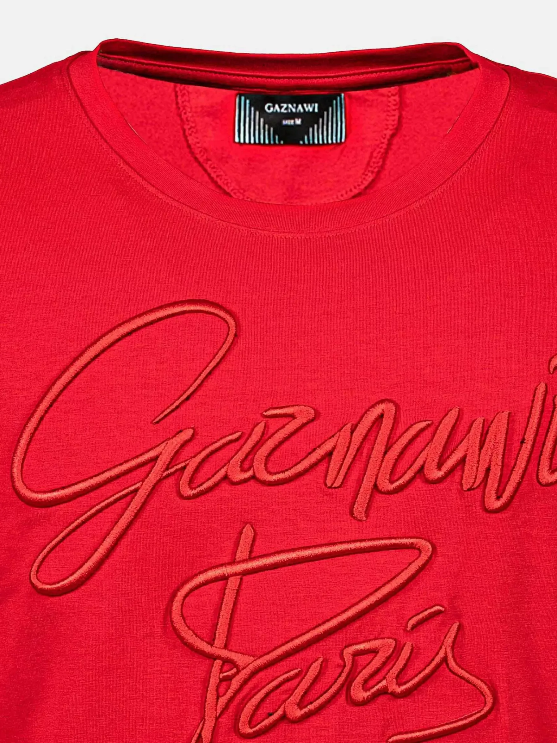 Rood T-Shirt Met Ronde Hals. Op De Voorzijde Een Grote Print Met De Tekst Gaznawi Paris.