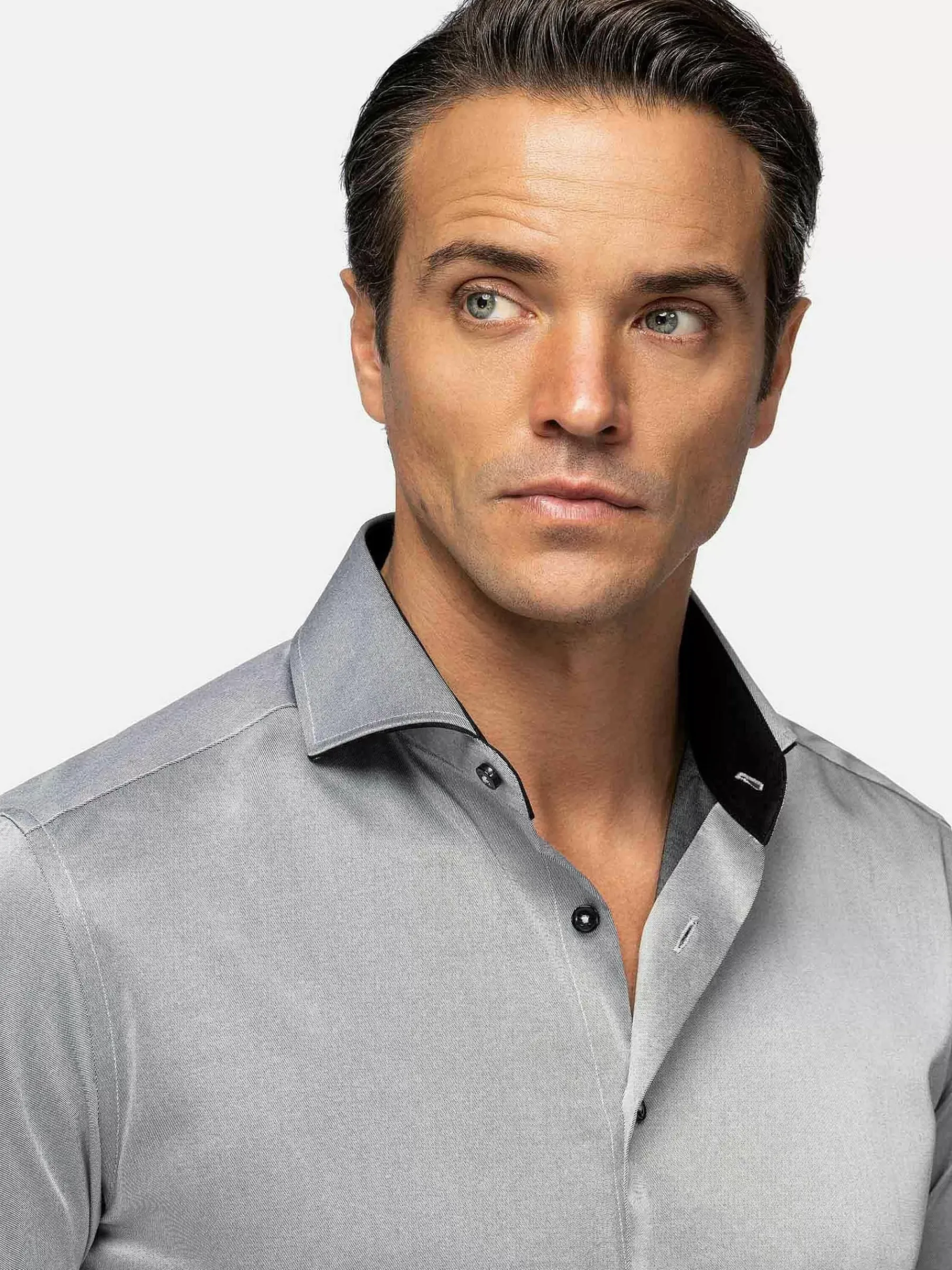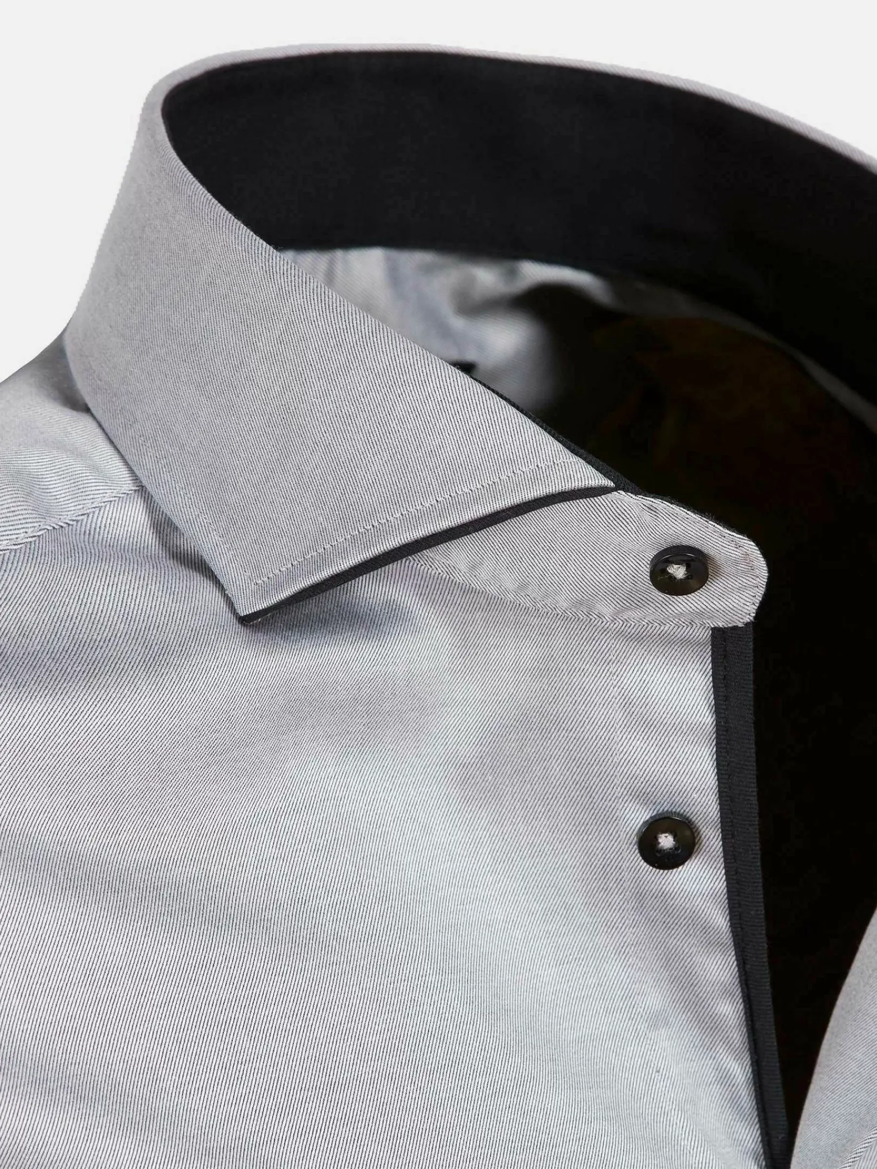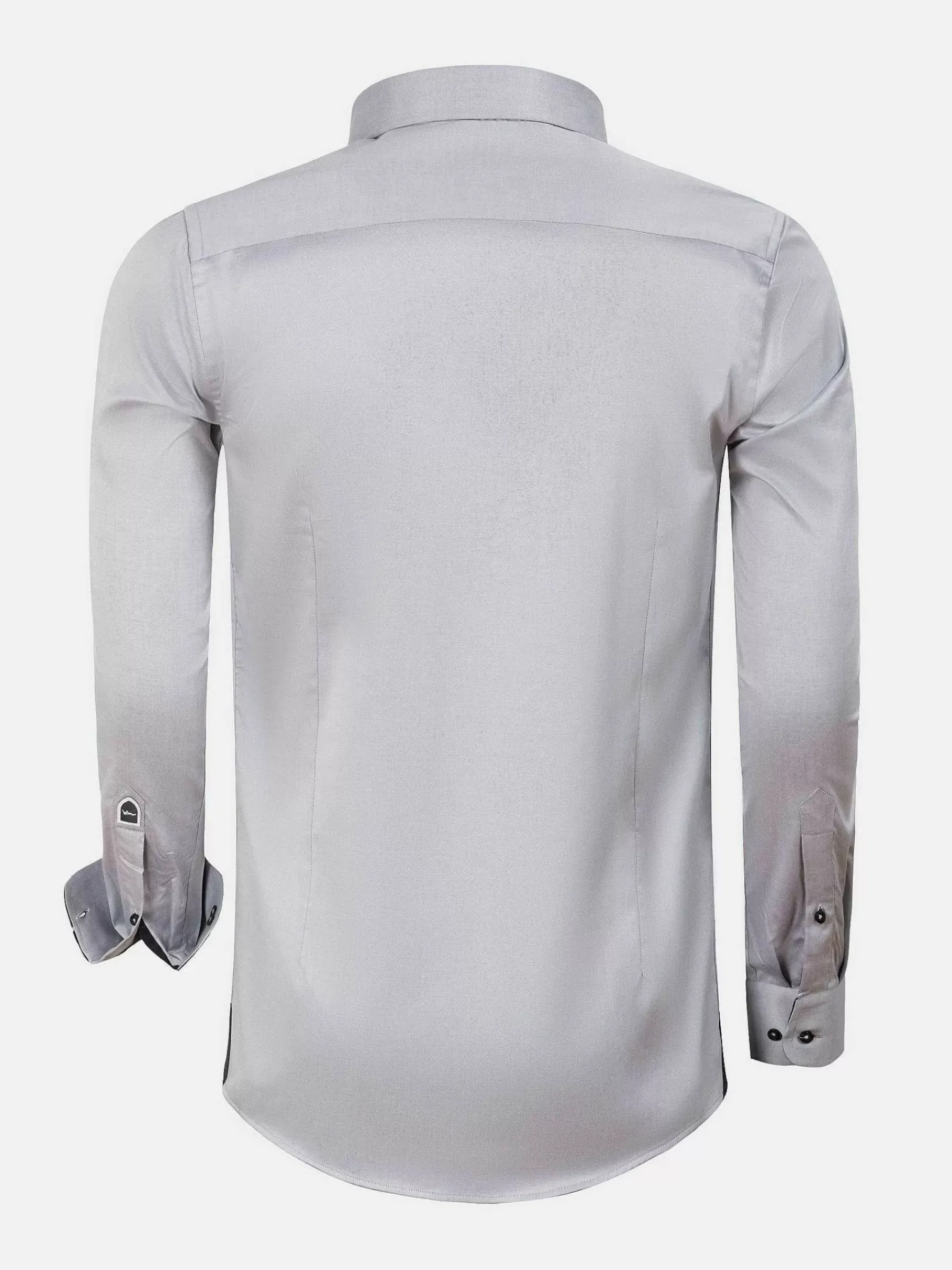 Grijs Overhemd Met Een Mooie Glans. Past Heel Mooi Op Een Pantalon Voor Een Nette Look. Het Overhemd Loopt Van Onderen Rond Af. De Zwarte Manchetten Geven Een Mooi Kleurencontrast Bij Het Omslaan.