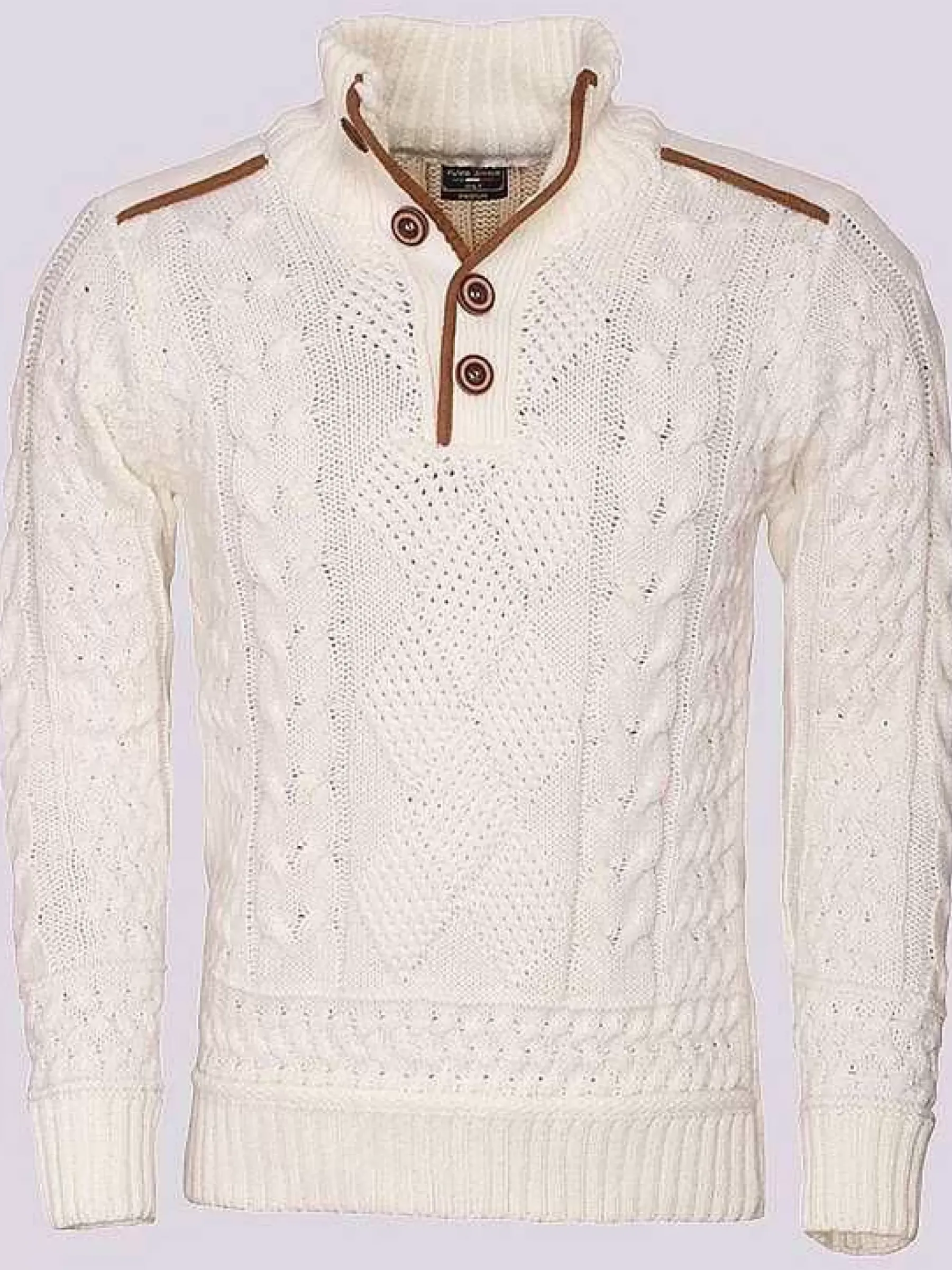 Grof Geweven Trui In De Kleur Gebroken Wit. De Knopen Zijn Bruin En Steken Hierdoor Goed Af Tegen De Stof, Evenals De Vlakken Op De Schouders.