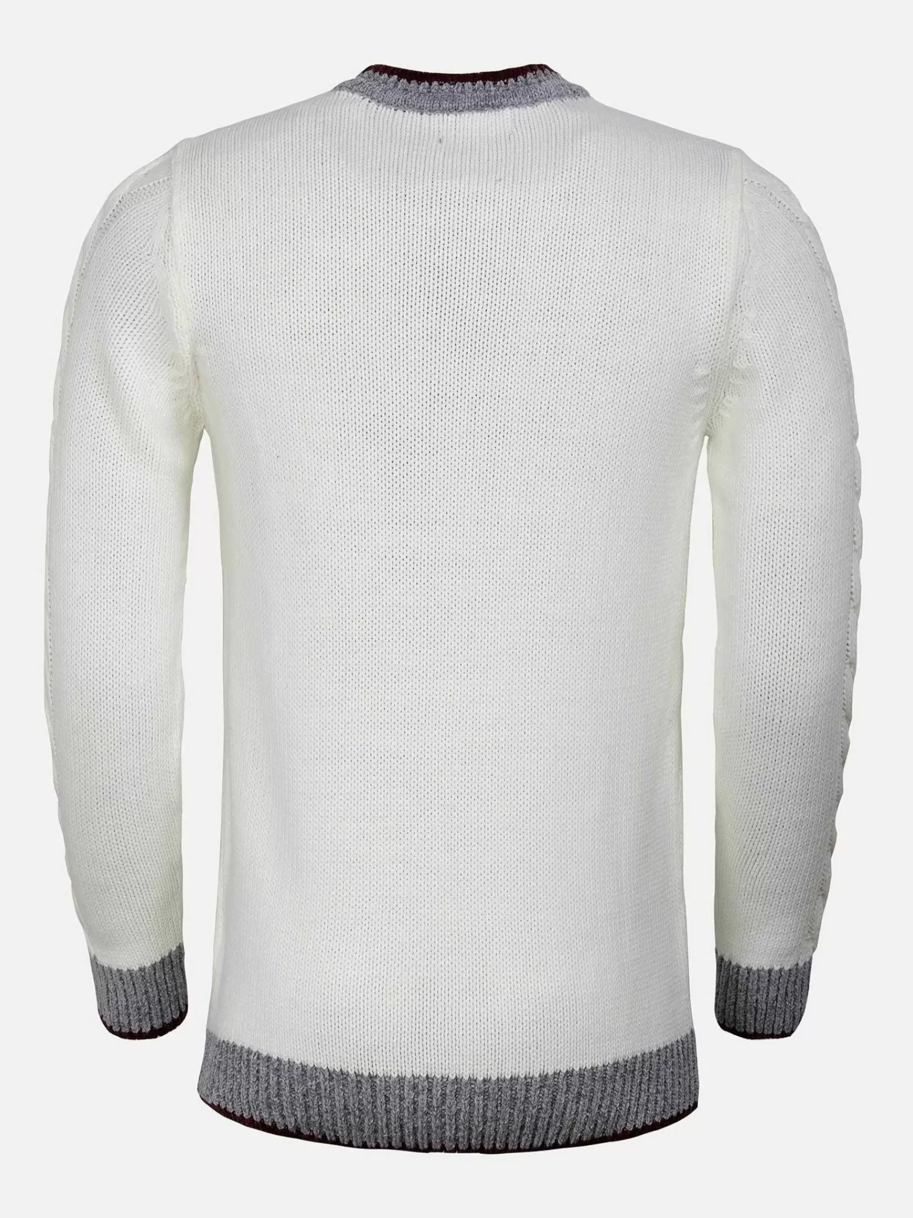 Witte Sweater Met Linkerborstzak. Afgewerkt Met De Kleuren Grijs En Bordeauxrood In De Kraag En Aan De Onderkant Van De Mouwen. Staat Mooi Op Een Pantalon Of Een Donkere Jeans.