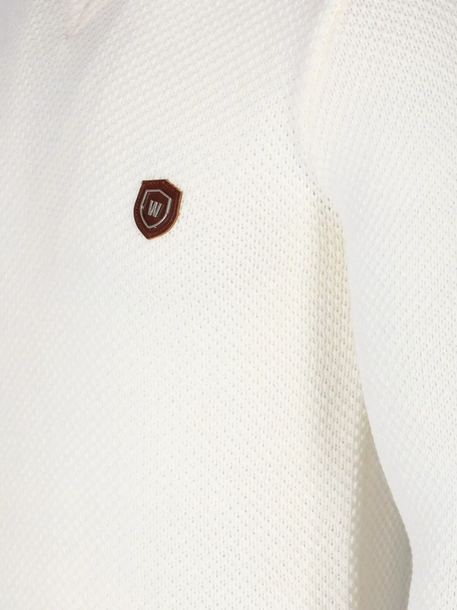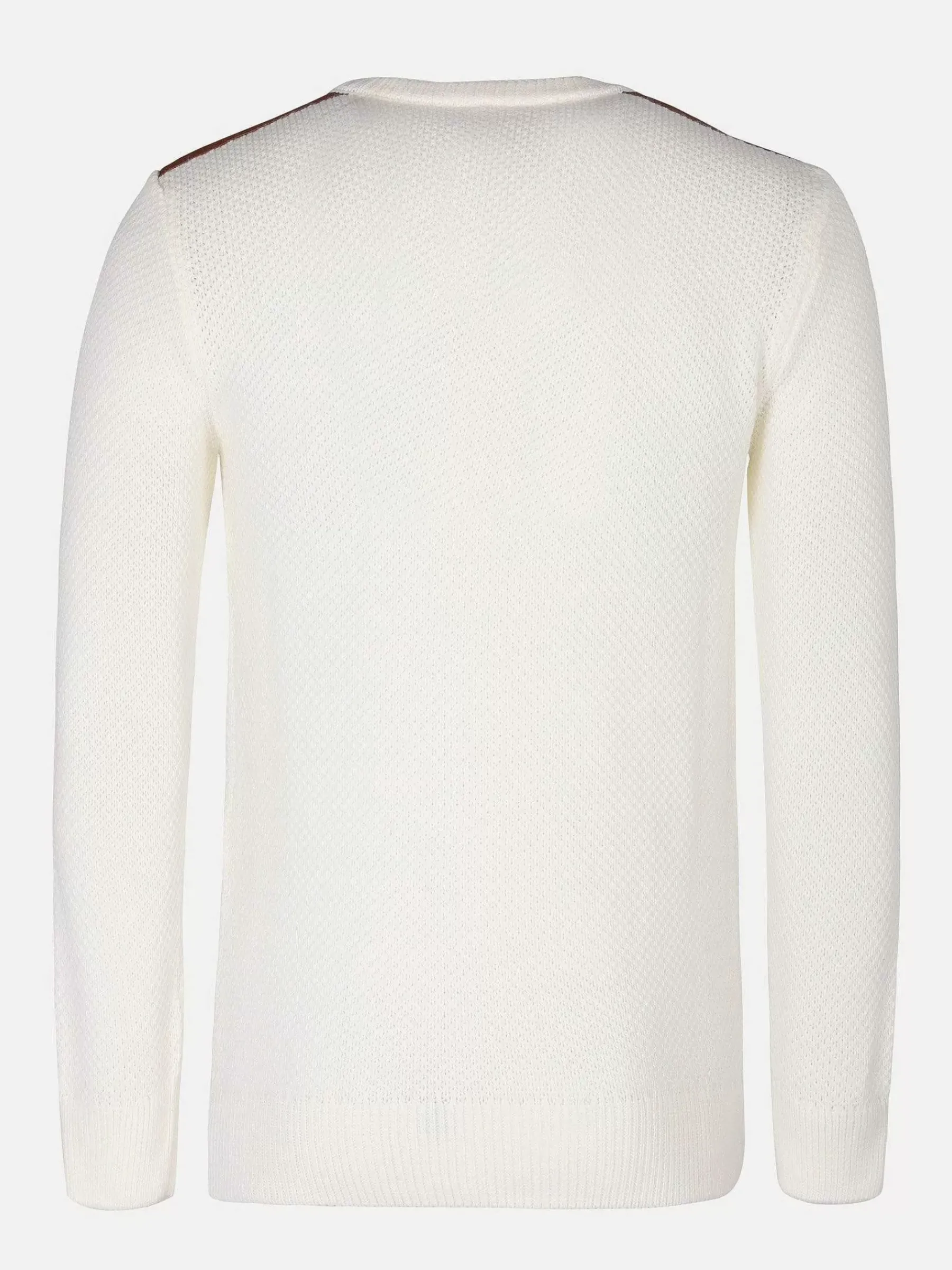 Witte Trui Met V-Hals. Deze Warme En Stijlvolle Trui Heeft Verschillende Bruine Details Op De Schouder, Linkerborst En Rechts Onder Aan De Boord. Staat Mooi Op Een Donkere Jeans.