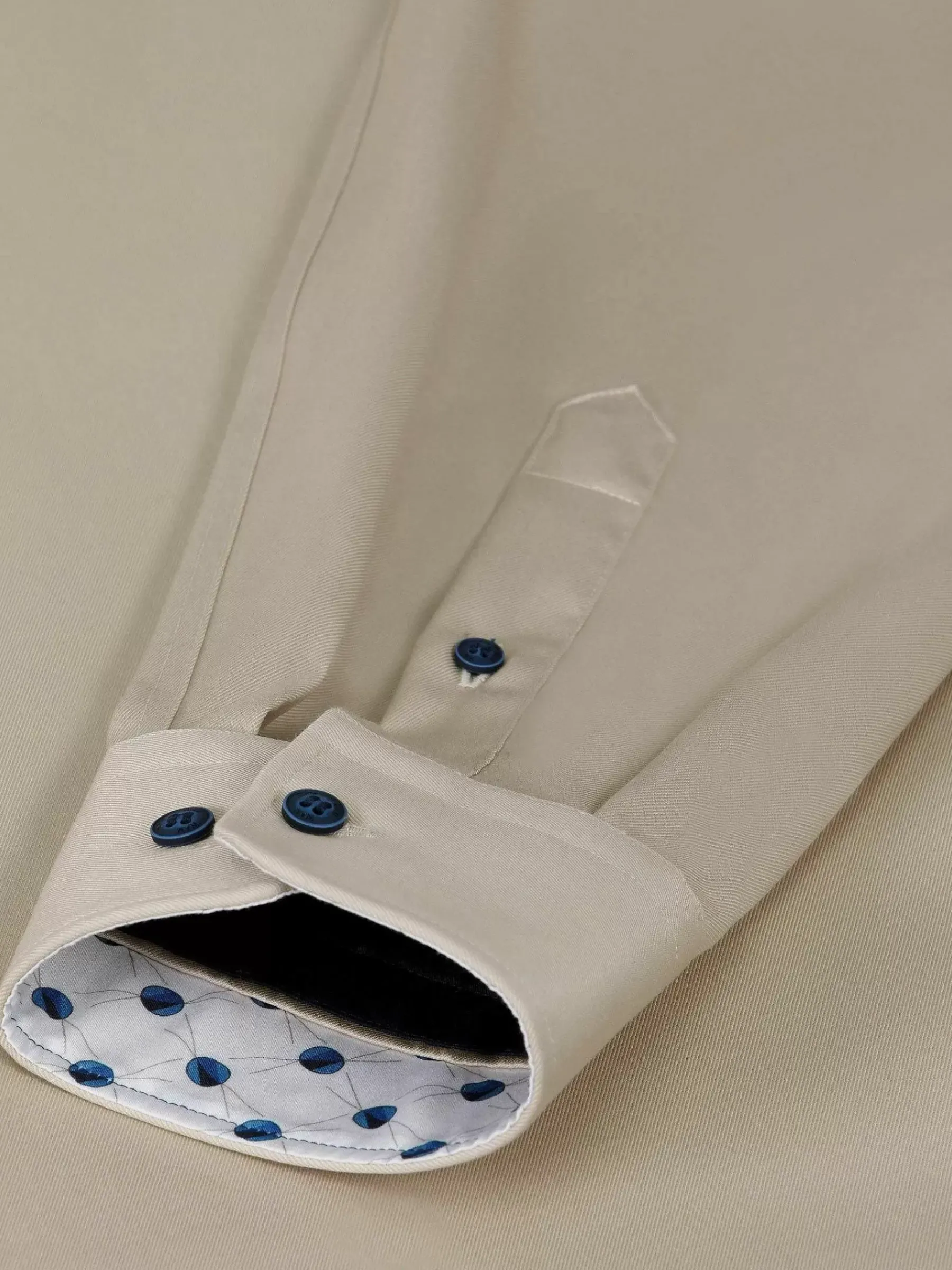 Beige Overhemd Met Cognackleurige Knopen En Doorlopende Bies. Het Overhemd Heeft Een Mooie Glans En Verschillende Details. De Binnenkant Van De Kraag En Manchet Heeft Een Leuk Patroon Van Stippen.