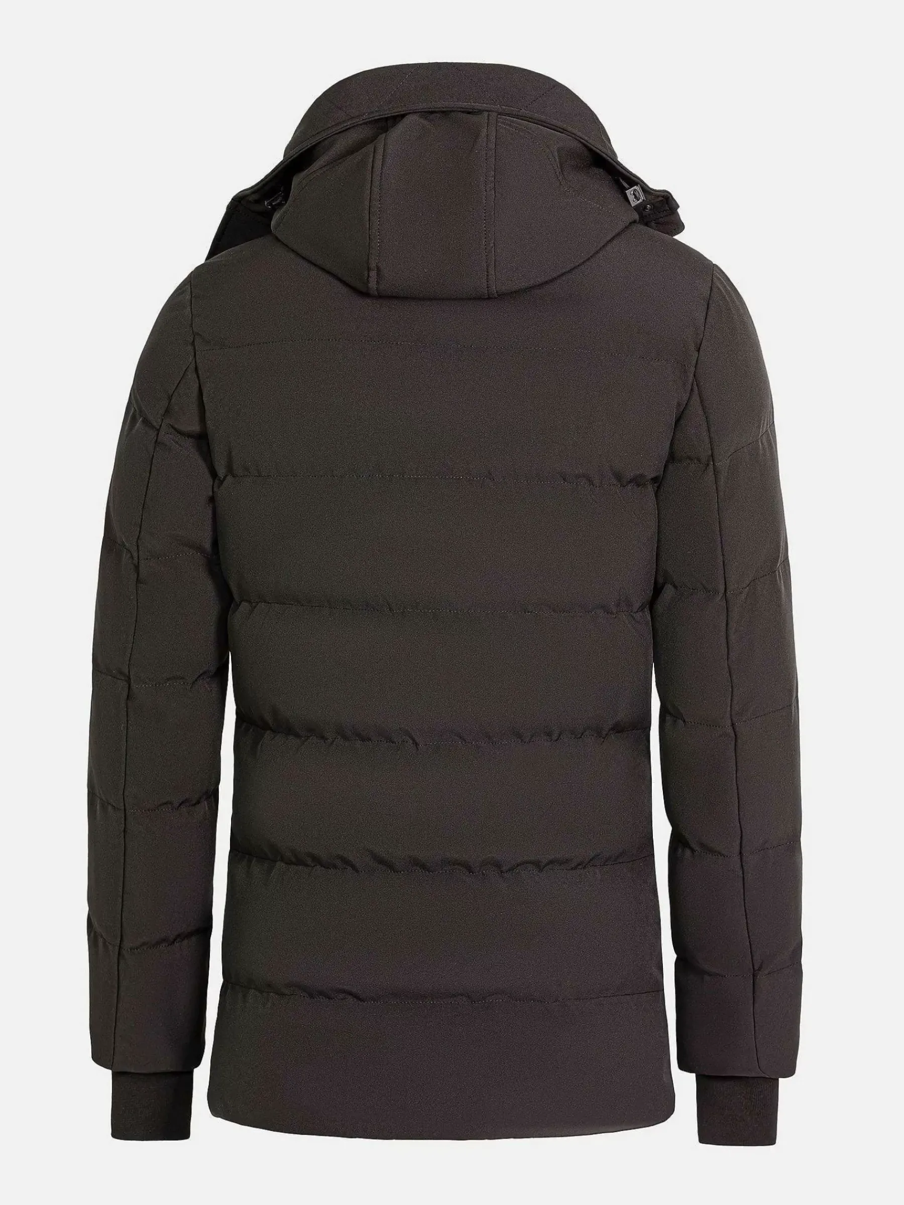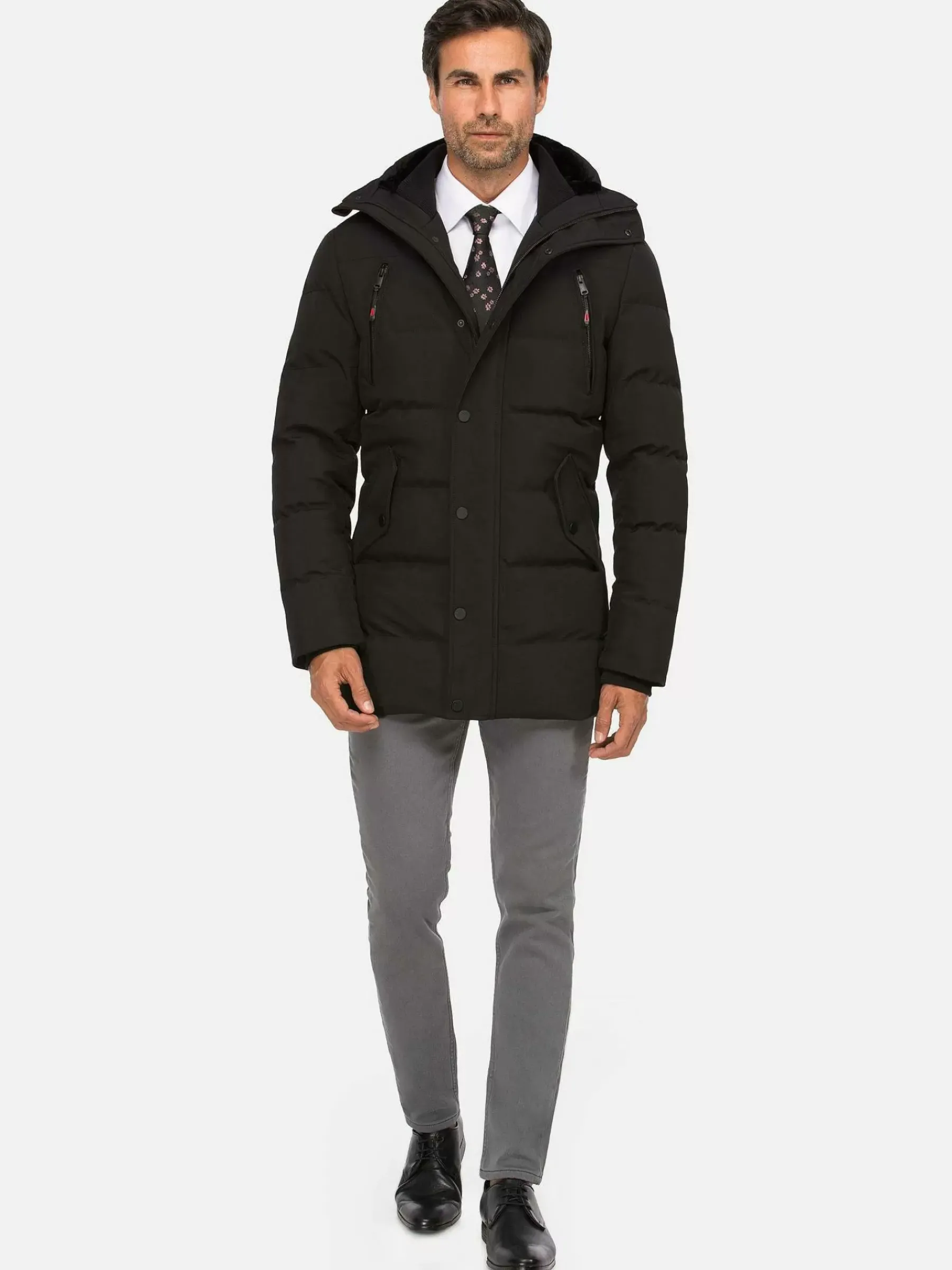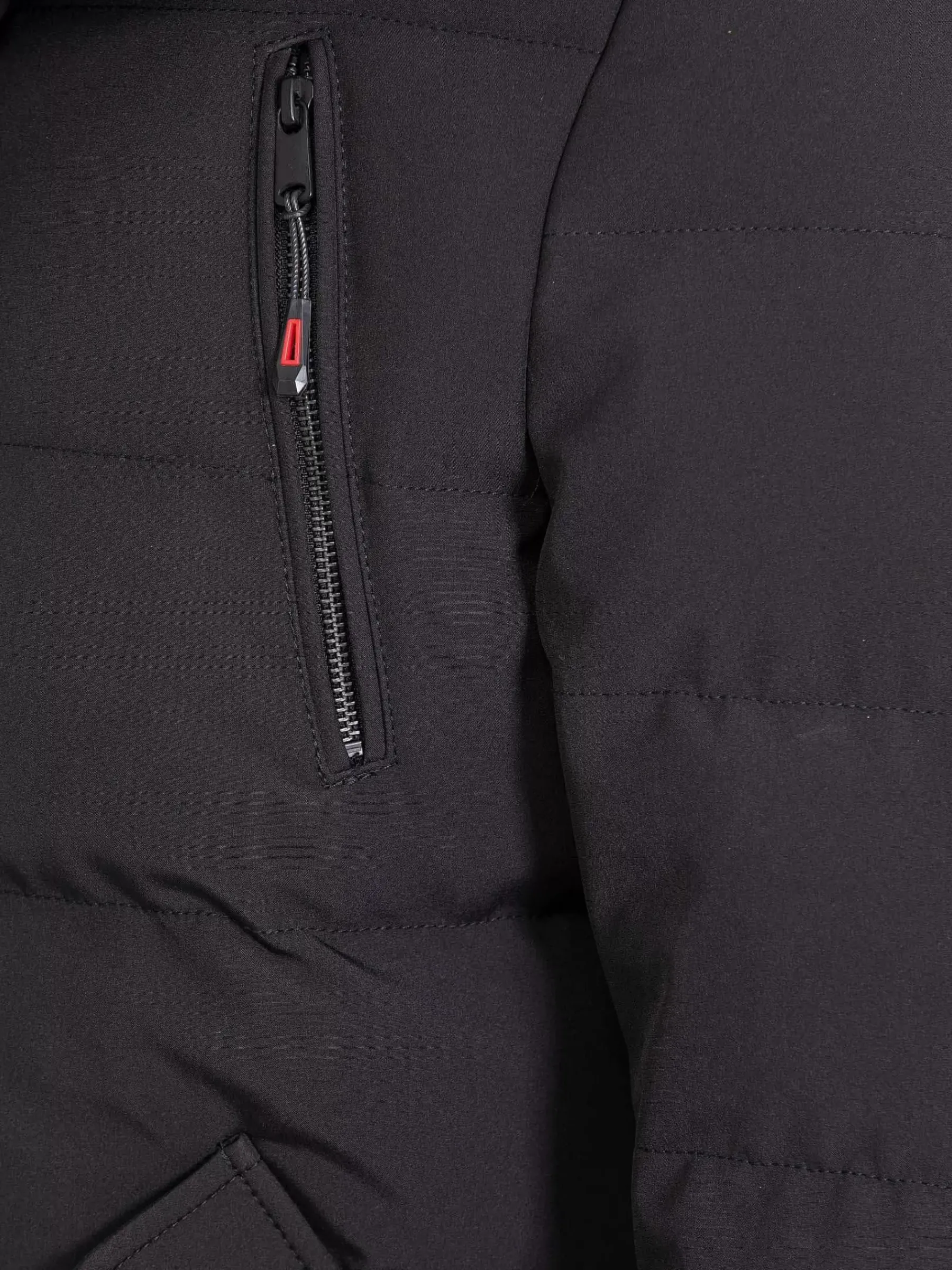Zwarte Winterjas Met Capuchon. De Jas Heeft Een Verborgen Ritssluiting Aan De Voorkant Met Drukknoopsluiting, Twee Borstzakken Met Ritssluiting En Twee Zijzakken Aan De Voorkant.